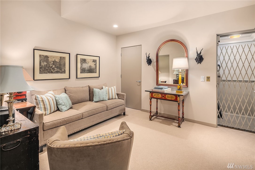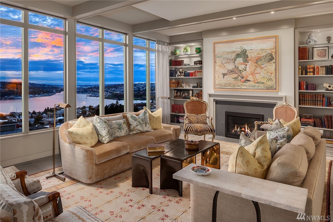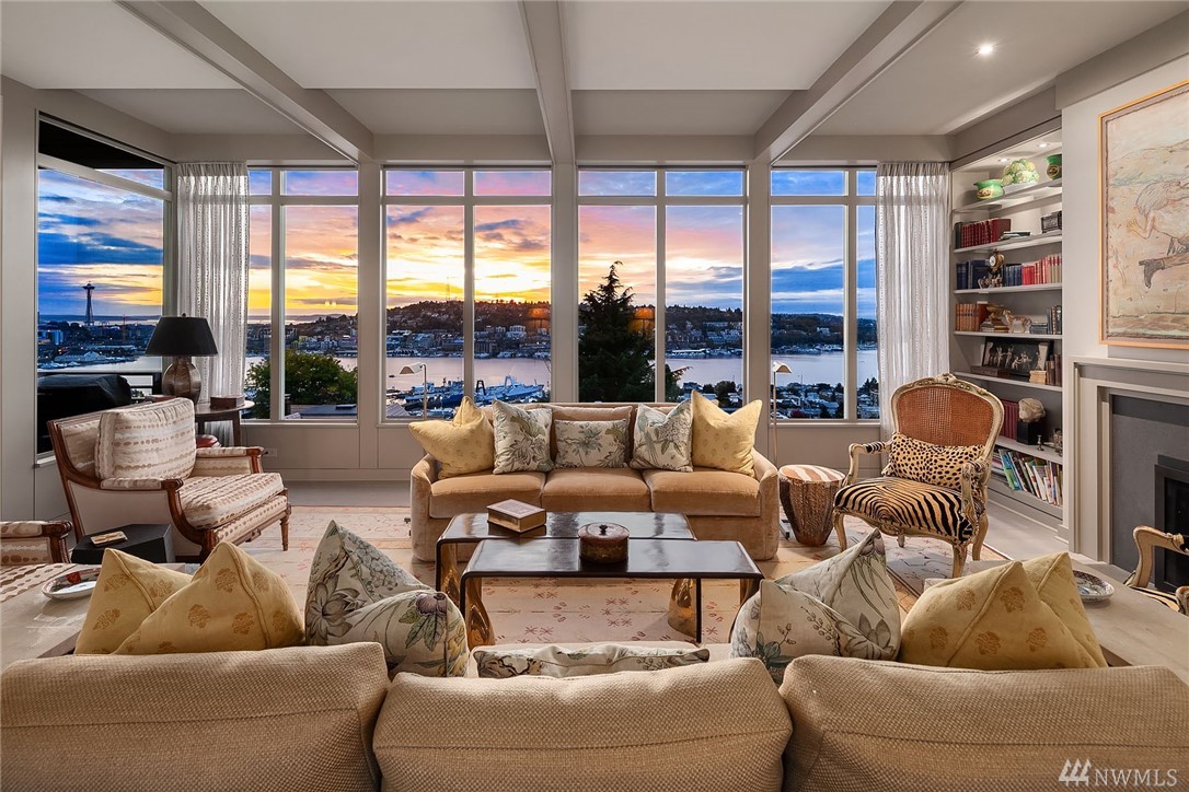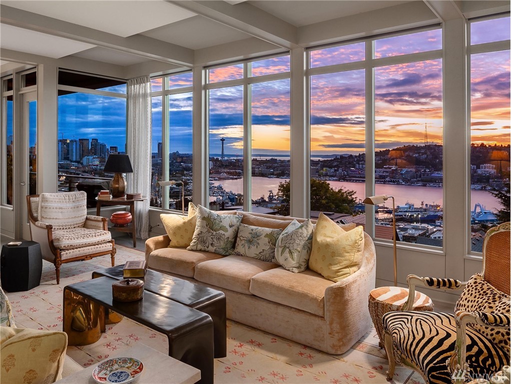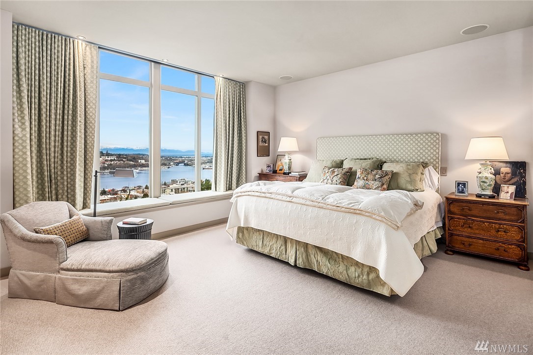 Sophisticated Capitol Hill residence in gated entry Newton Place with private elevator, commanding West-facing city, mountain & water views. Grand entry with double doors & soaring ceiling; elevated main living space maximizes views. Gourmet kitchen, living room lined with windows, covered balcony, home office. 2 bedrooms on the main floor, each with ¾ bath. Lush roof garden; guest suite with ¾ bath and separate entrance; attached 2-car garage; motorized shades; shared pool and gym.