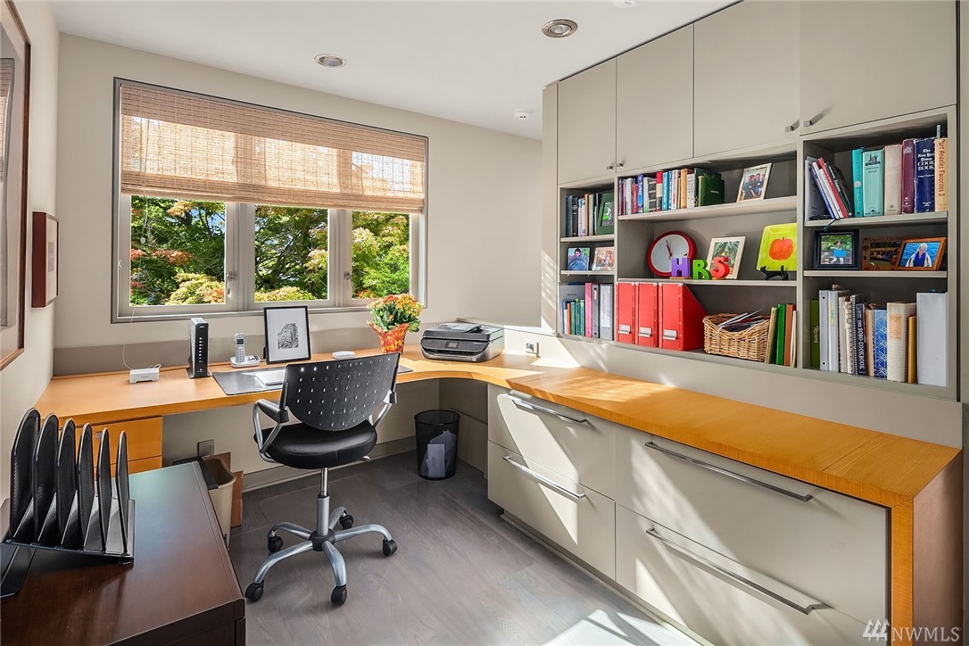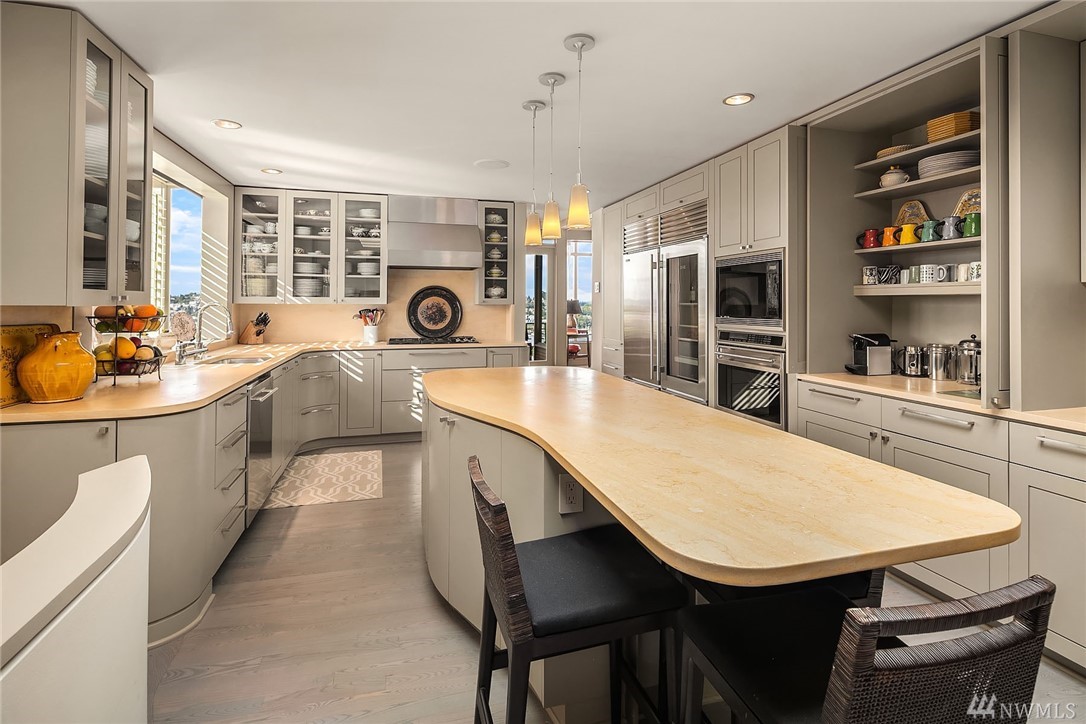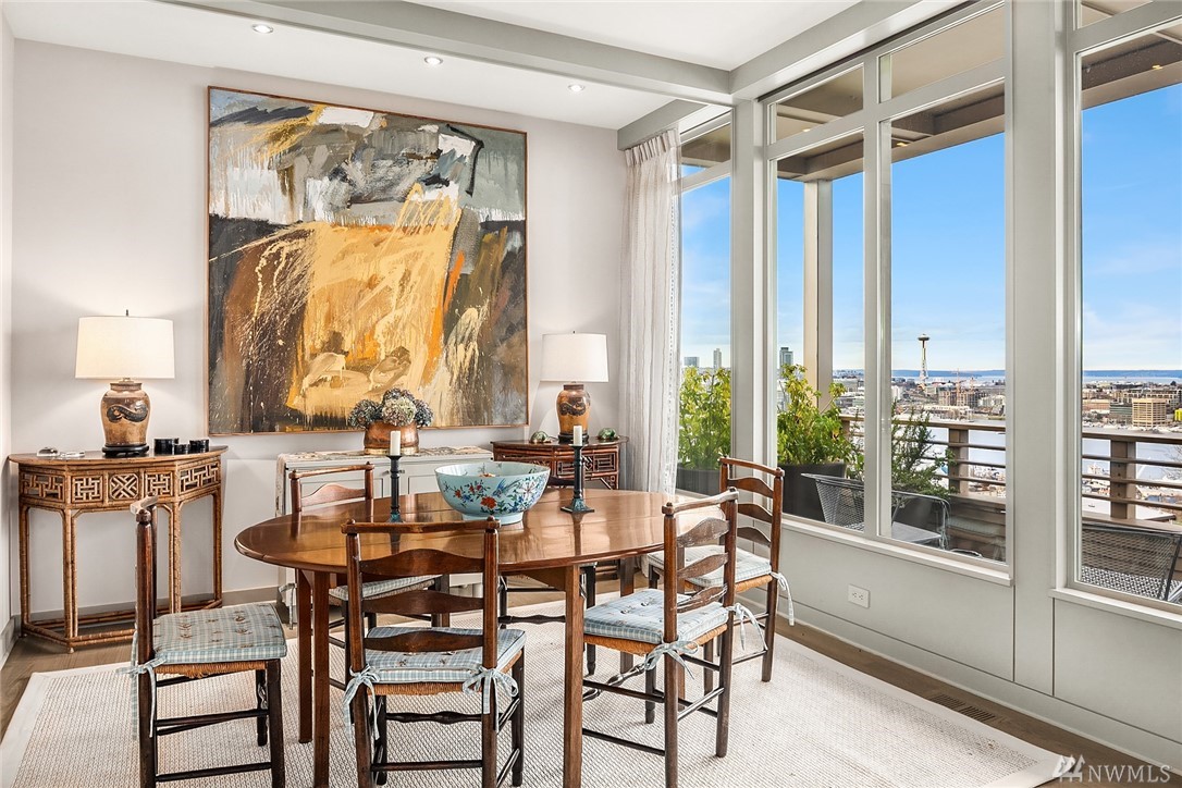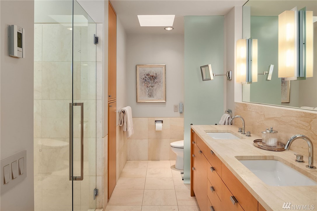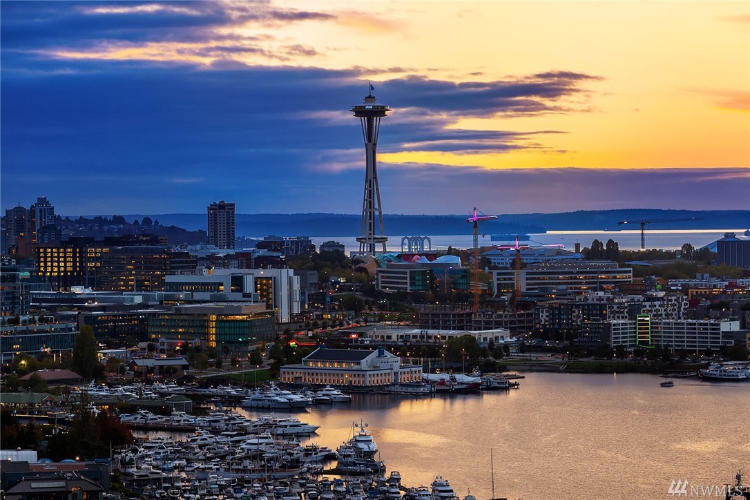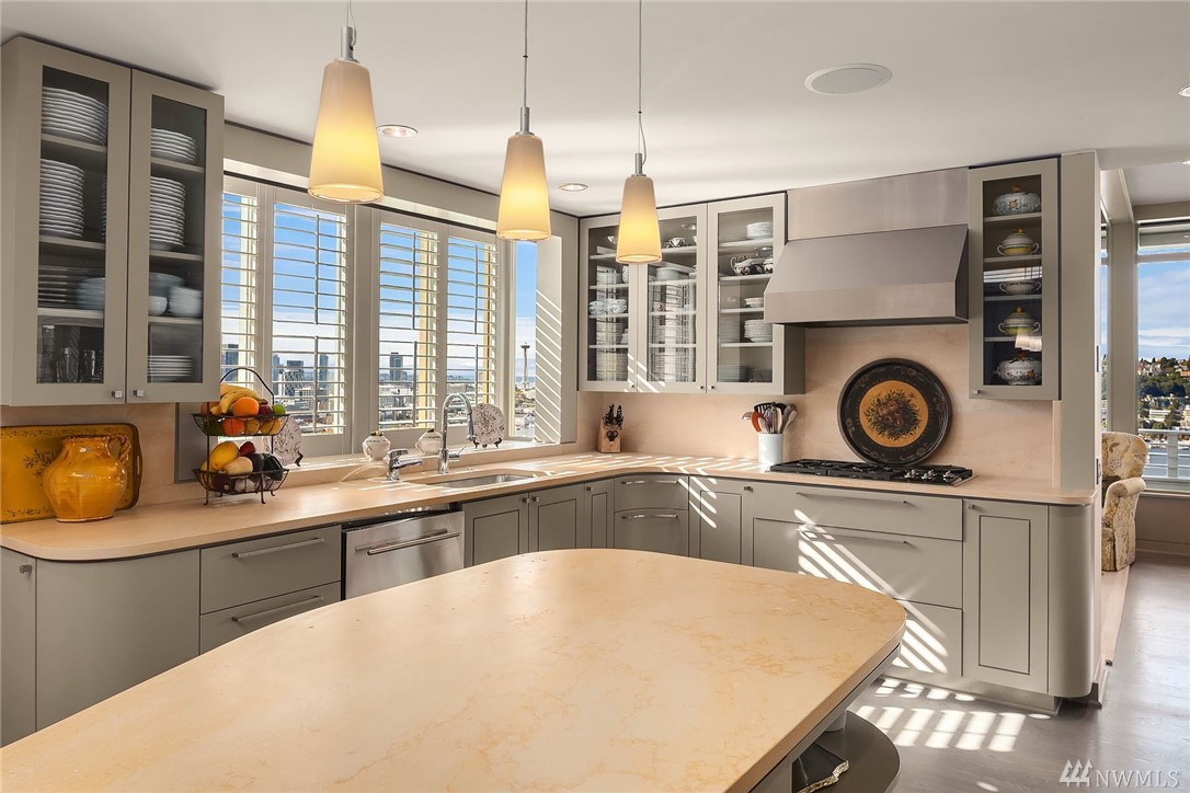 Sophisticated Capitol Hill residence in gated entry Newton Place with private elevator, commanding West-facing city, mountain & water views. Grand entry with double doors & soaring ceiling; elevated main living space maximizes views. Gourmet kitchen, living room lined with windows, covered balcony, home office. 2 bedrooms on the main floor, each with ¾ bath. Lush roof garden; guest suite with ¾ bath and separate entrance; attached 2-car garage; motorized shades; shared pool and gym.