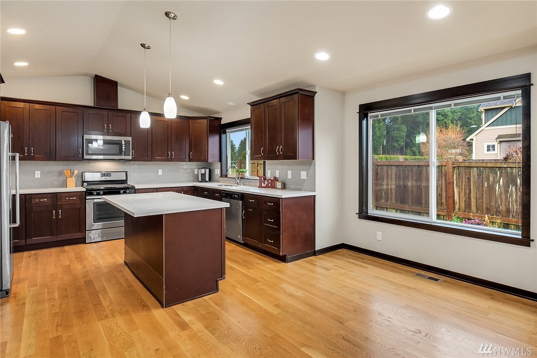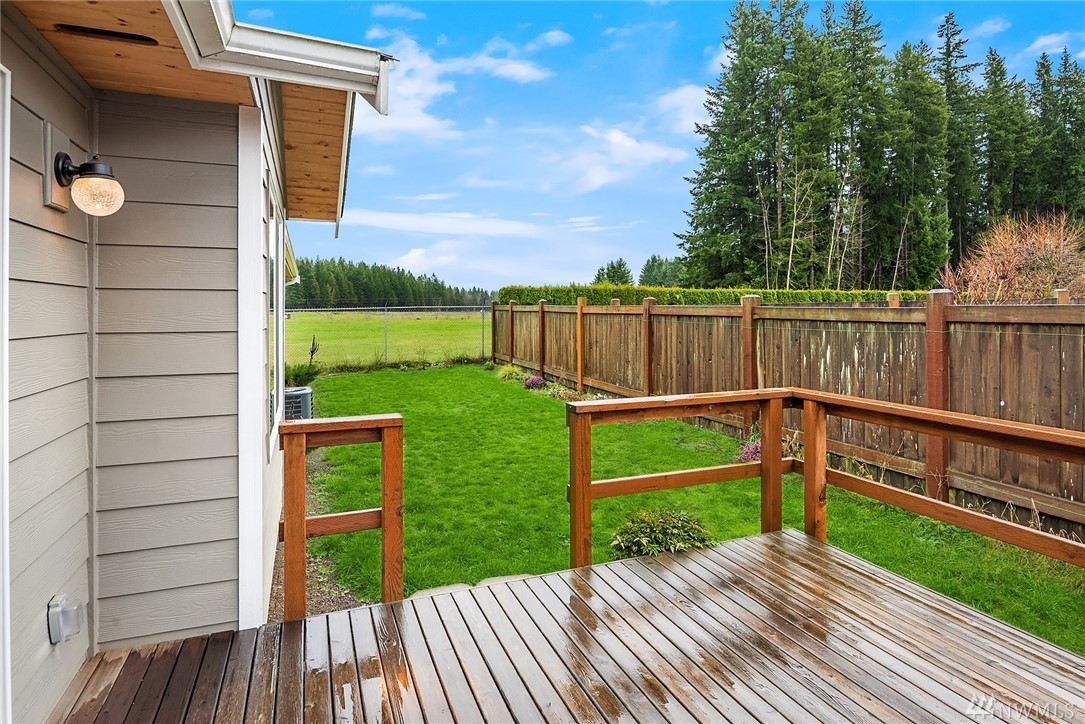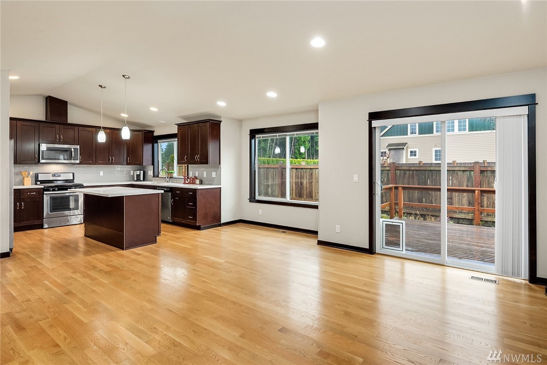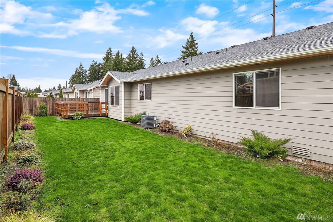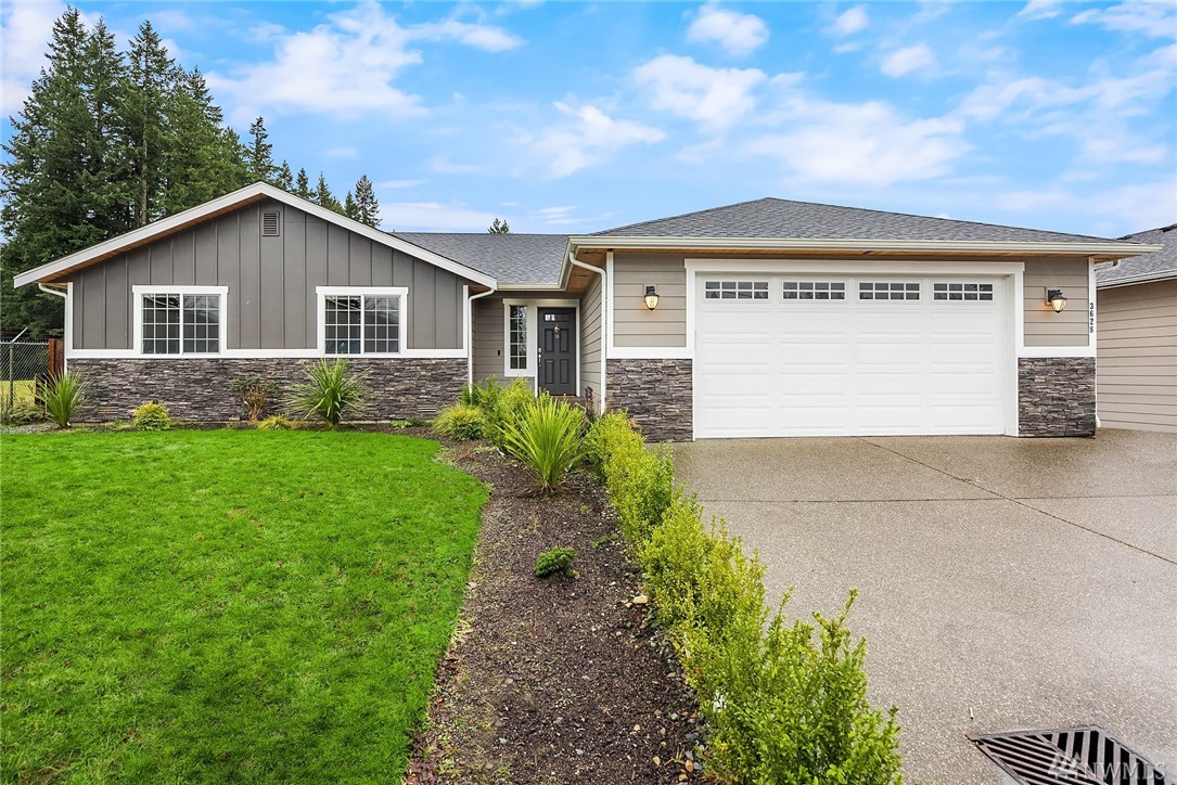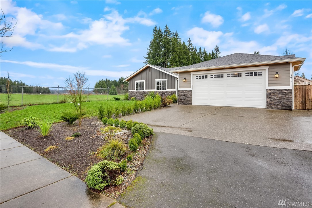 Stunning Rambler in Arlington! 3 BR, 2 Full BA. Beautiful REAL hardwood flooring throughout entry, LR, kitchen & hallway. Living Room w/cathedral ceilings, gas FP & slider out to deck, fully fenced backyard. Island Kitchen featuring quartz counters, gas range, built-in micro, undermount sink, subway back splash, TONS of cupboard space & dining area too! Master suite w/walk-in closet, private bath w/ walk-in shower &, double vanity. Laundry RM w/utility sink & cabinet. Oversize finished garage w/entry ramp to home. Air conditioning & hardwired GENERATOR ~ no worries about power outages! ADA compliant door passages. 7 miles of walking trails in adjacent park. Close to shopping, Everett Clinic, Costco & I-5. Low maintenance & move in ready!