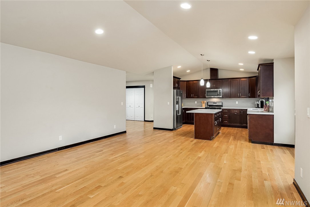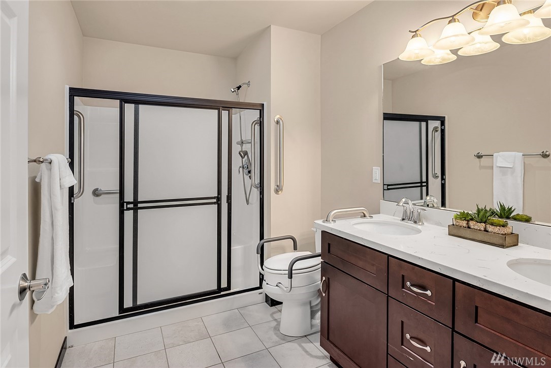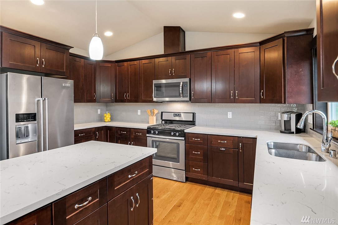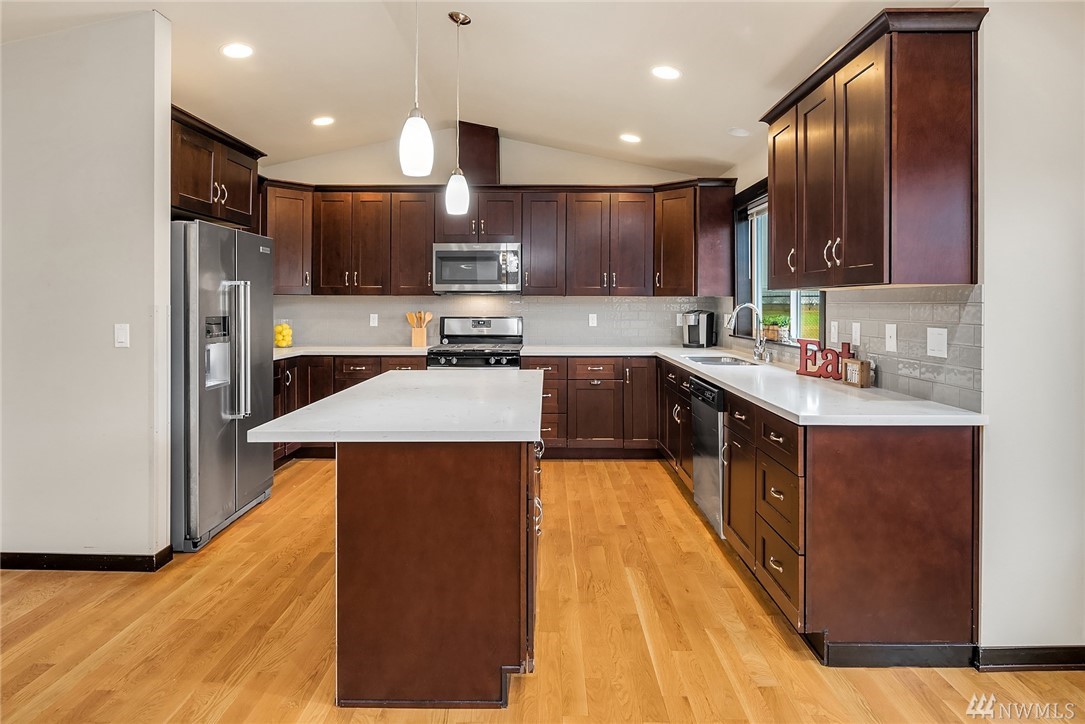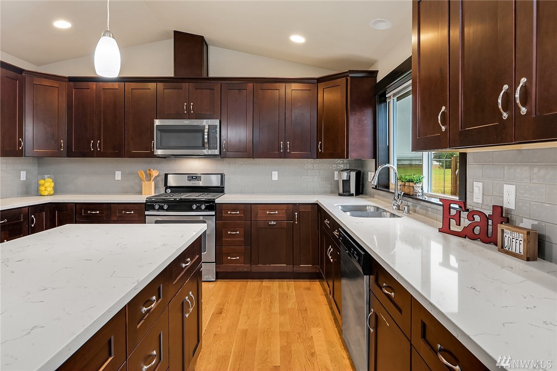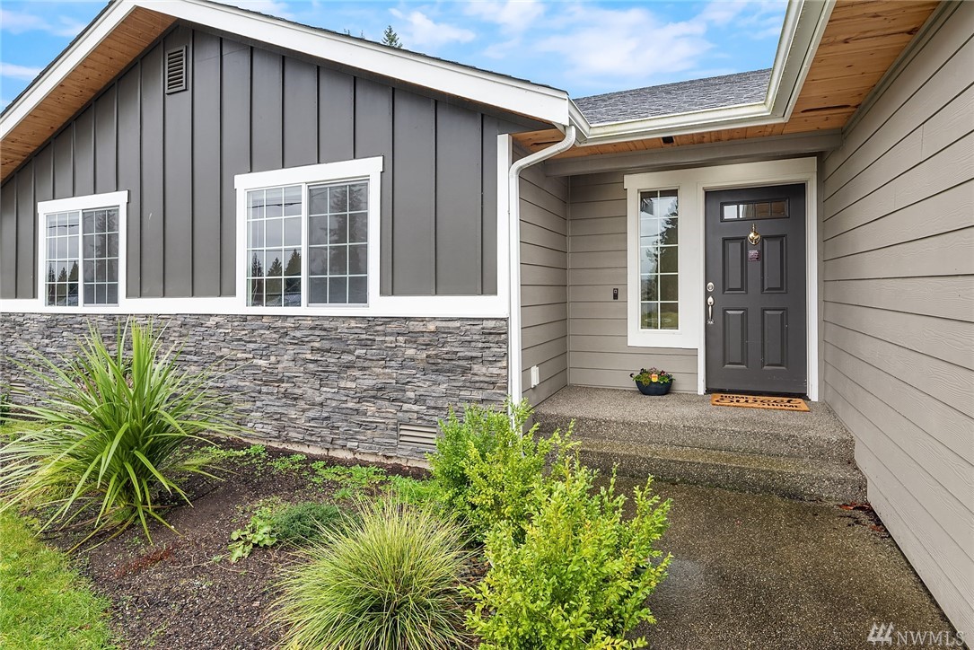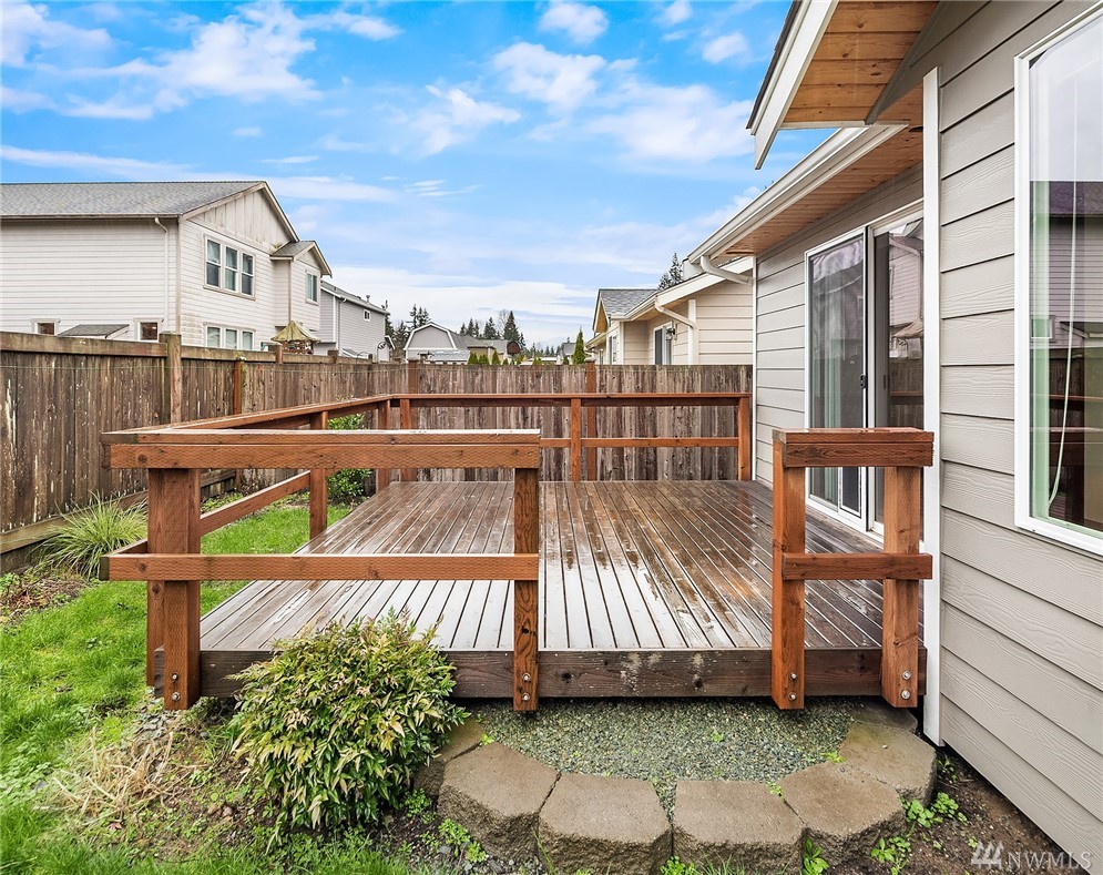 Stunning Rambler in Arlington! 3 BR, 2 Full BA. Beautiful REAL hardwood flooring throughout entry, LR, kitchen & hallway. Living Room w/cathedral ceilings, gas FP & slider out to deck, fully fenced backyard. Island Kitchen featuring quartz counters, gas range, built-in micro, undermount sink, subway back splash, TONS of cupboard space & dining area too! Master suite w/walk-in closet, private bath w/ walk-in shower &, double vanity. Laundry RM w/utility sink & cabinet. Oversize finished garage w/entry ramp to home. Air conditioning & hardwired GENERATOR ~ no worries about power outages! ADA compliant door passages. 7 miles of walking trails in adjacent park. Close to shopping, Everett Clinic, Costco & I-5. Low maintenance & move in ready!