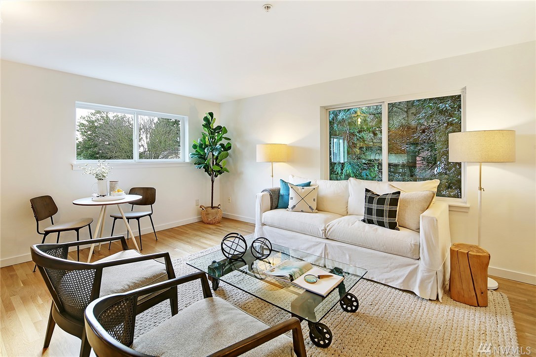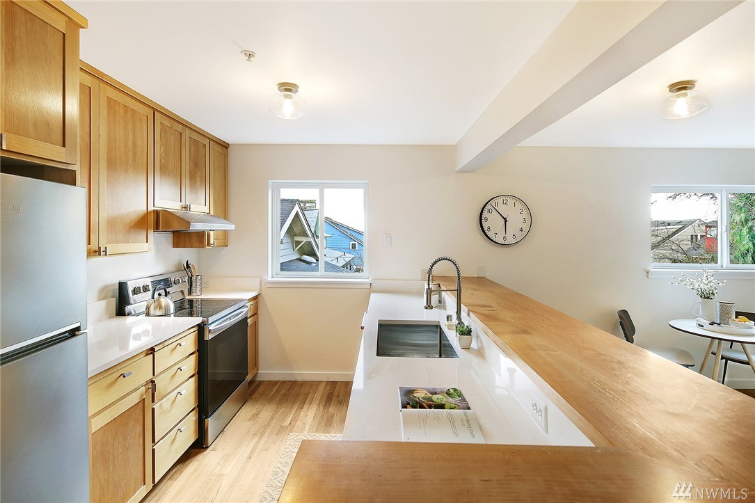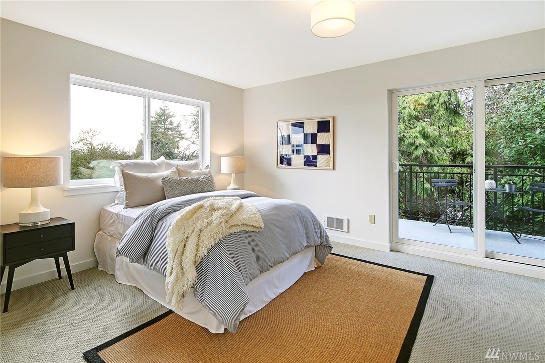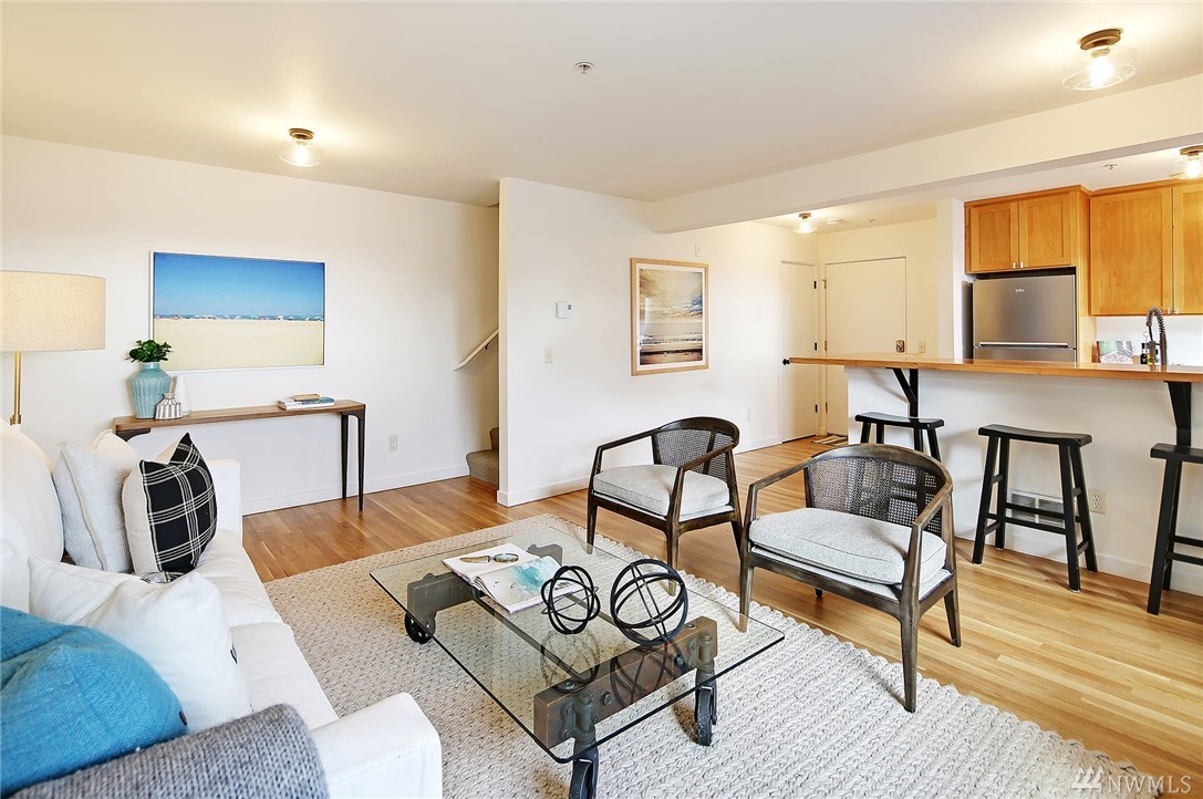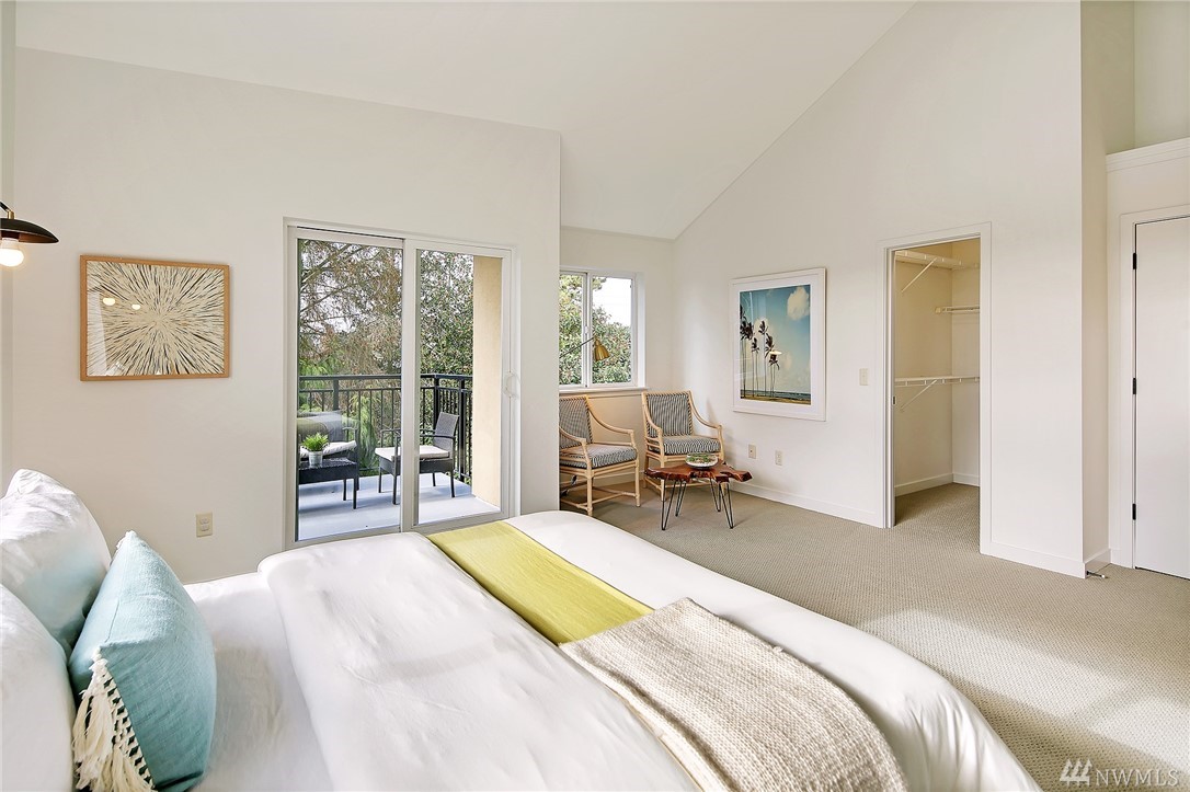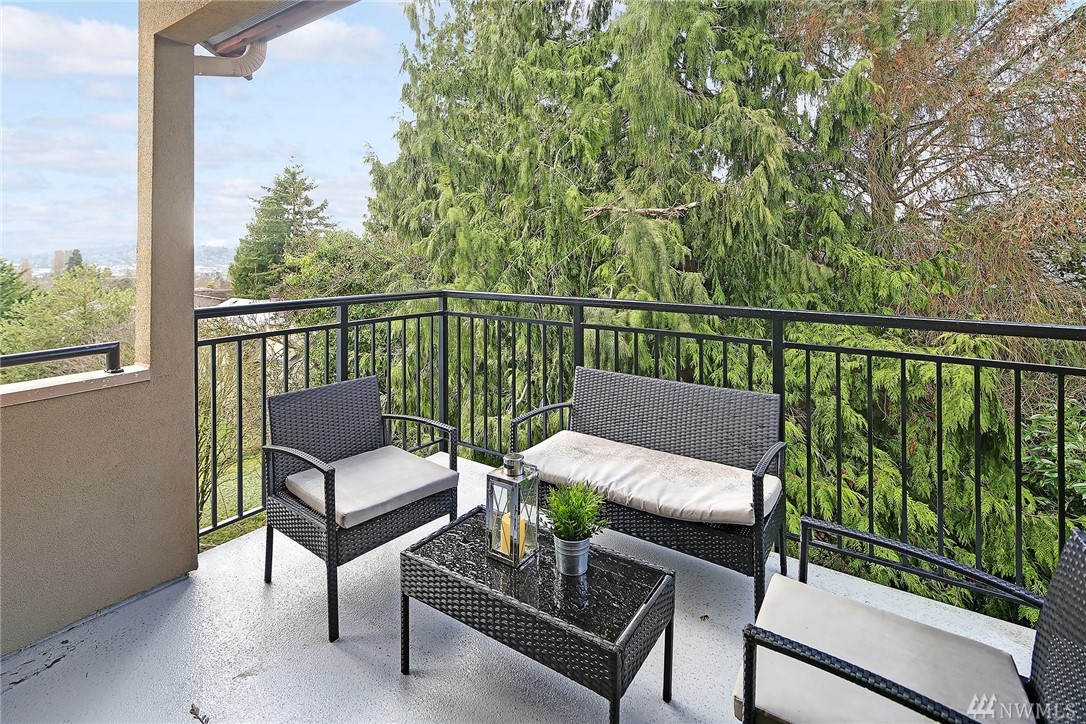 Modernly updated top unit w/ peekaboo views of Elliot Bay! The atrium common space welcomes you as you step into the open-style kitchen, dining & living area. Updated kitchen/living room include new SS appliances, Quartz countertops, refinished oak hardwoods, updated lighting & freshly painted walls. Upstairs, the spacious & newly carpeted/painted bedrooms each have their own full bathrooms & balcony overlooking a private-wooded backdrop. This condo is quiet from the city noise & offers constant natural light. Perfectly located in the heart of Ballard, w/ a walk score of 88, close to bus lines & top-rated schools. Extensive repairs completed in 2020-work included: new siding, new roof, new balconies & windows. 1 parking space in garage.