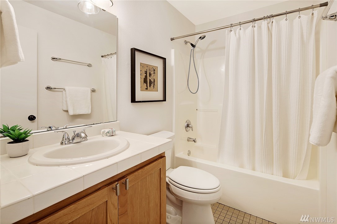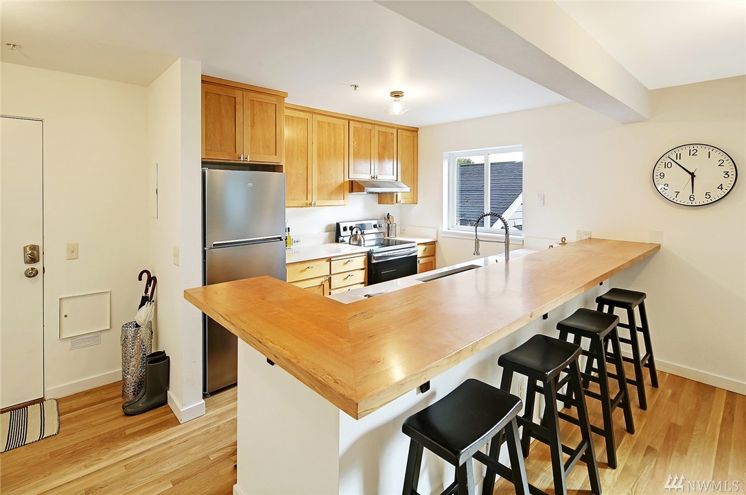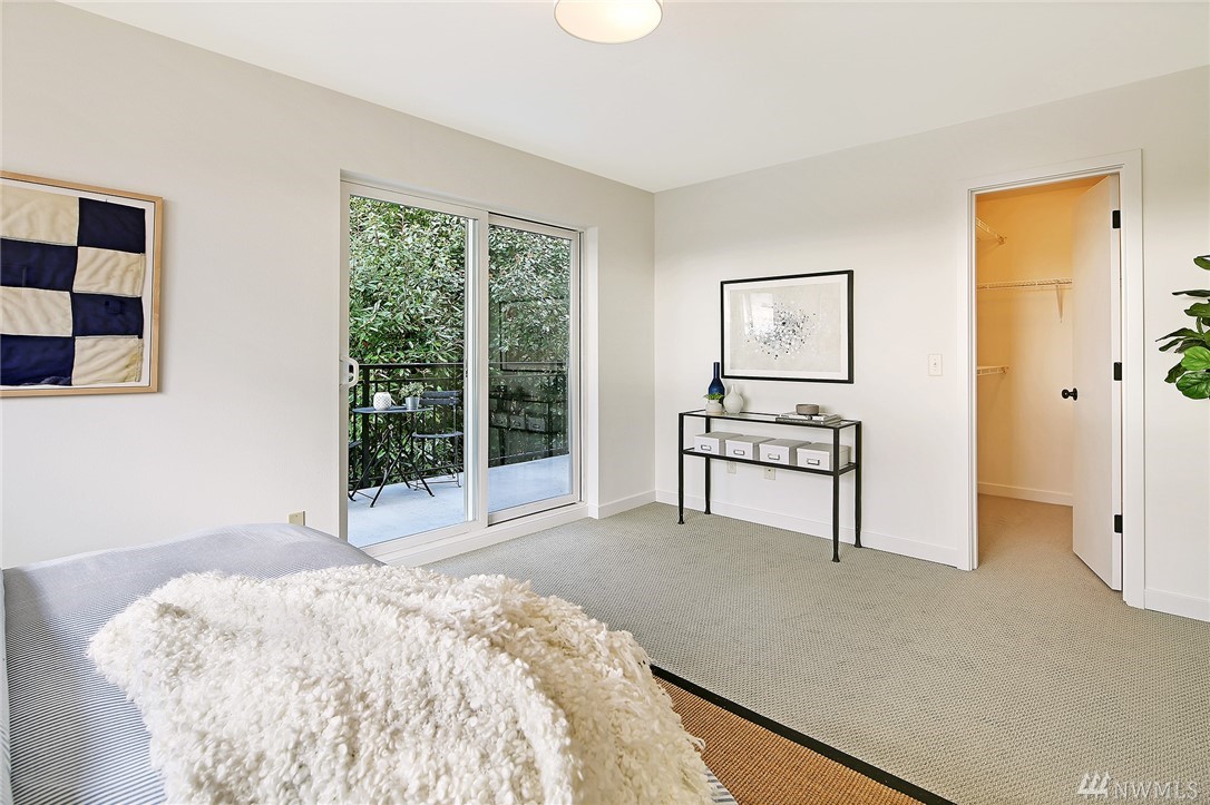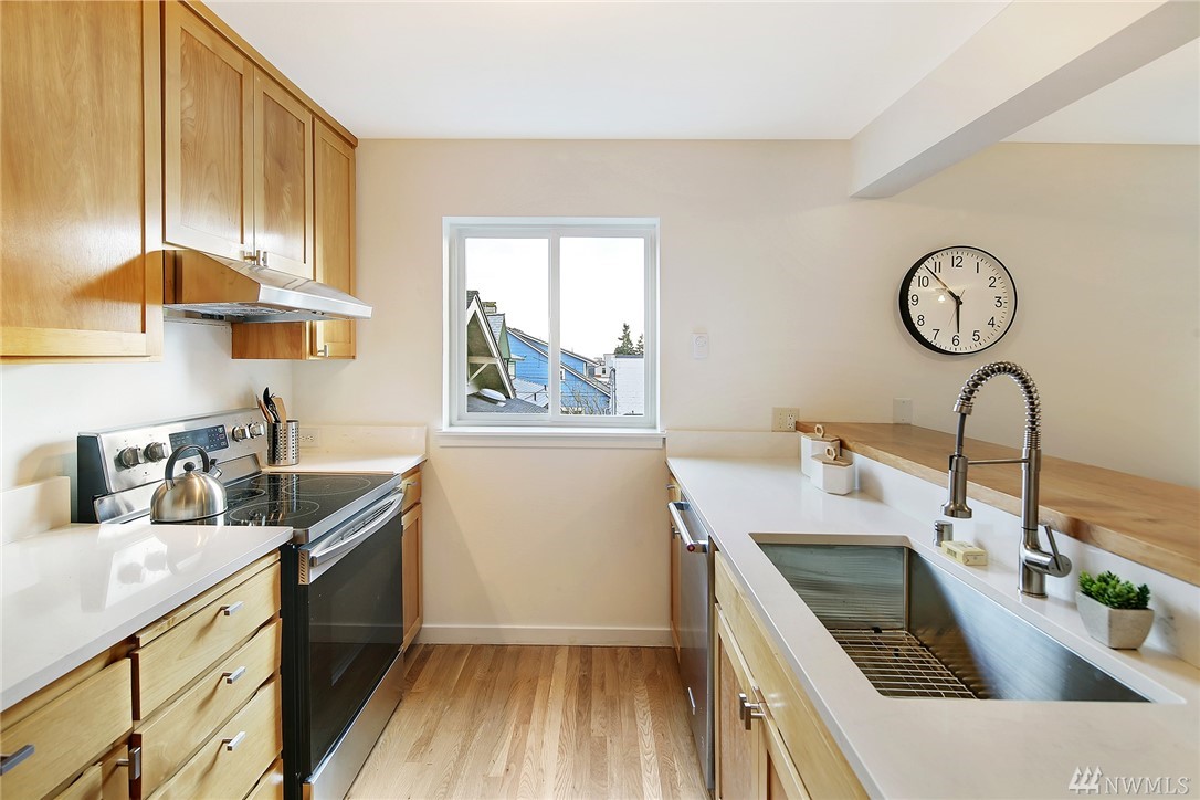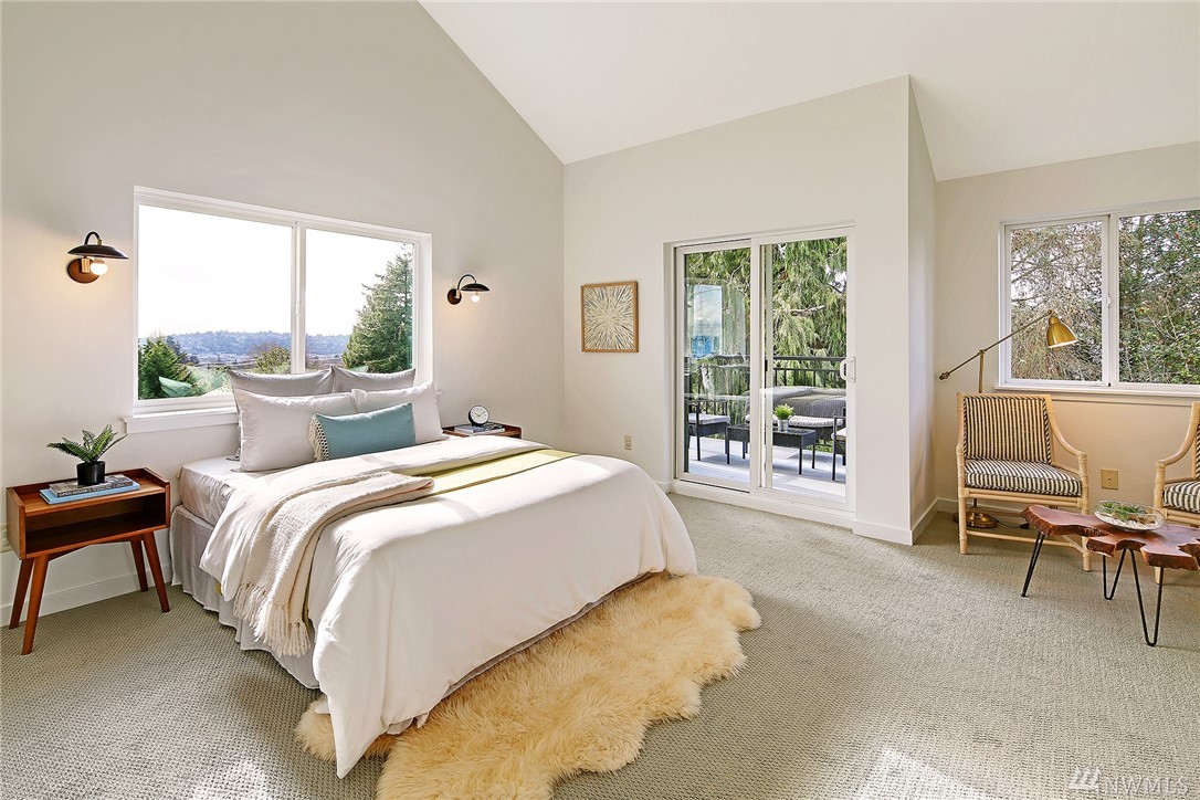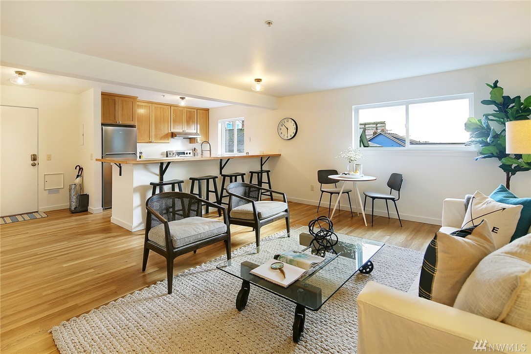 Modernly updated top unit w/ peekaboo views of Elliot Bay! The atrium common space welcomes you as you step into the open-style kitchen, dining & living area. Updated kitchen/living room include new SS appliances, Quartz countertops, refinished oak hardwoods, updated lighting & freshly painted walls. Upstairs, the spacious & newly carpeted/painted bedrooms each have their own full bathrooms & balcony overlooking a private-wooded backdrop. This condo is quiet from the city noise & offers constant natural light. Perfectly located in the heart of Ballard, w/ a walk score of 88, close to bus lines & top-rated schools. Extensive repairs completed in 2020-work included: new siding, new roof, new balconies & windows. 1 parking space in garage.
