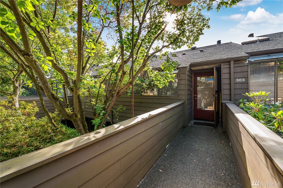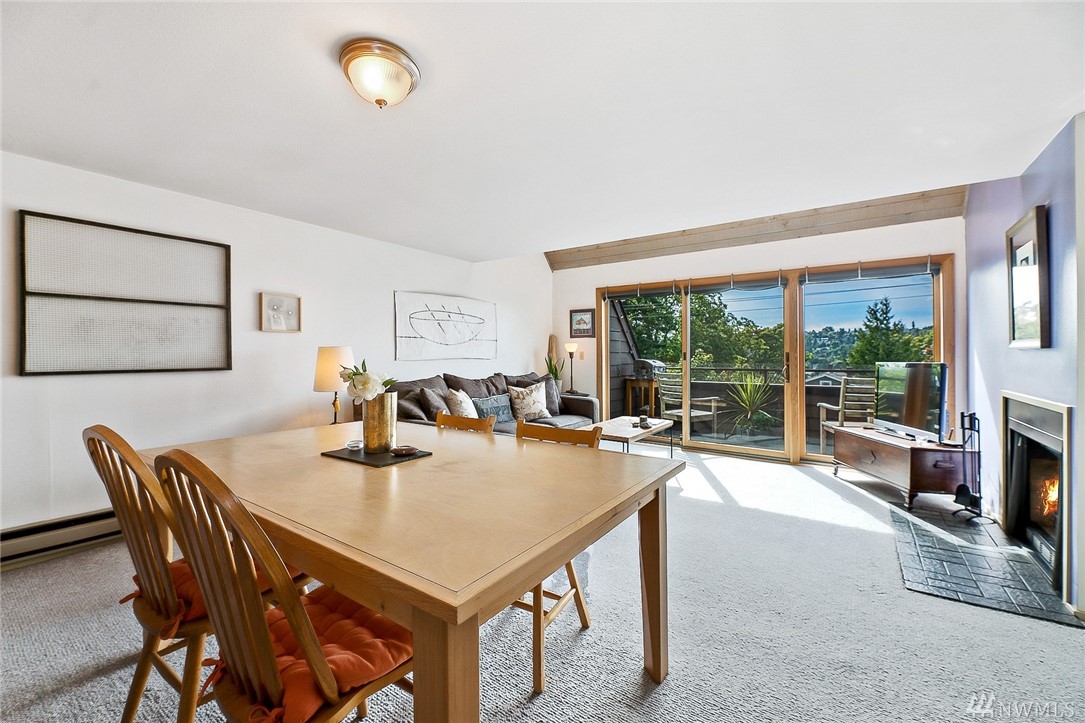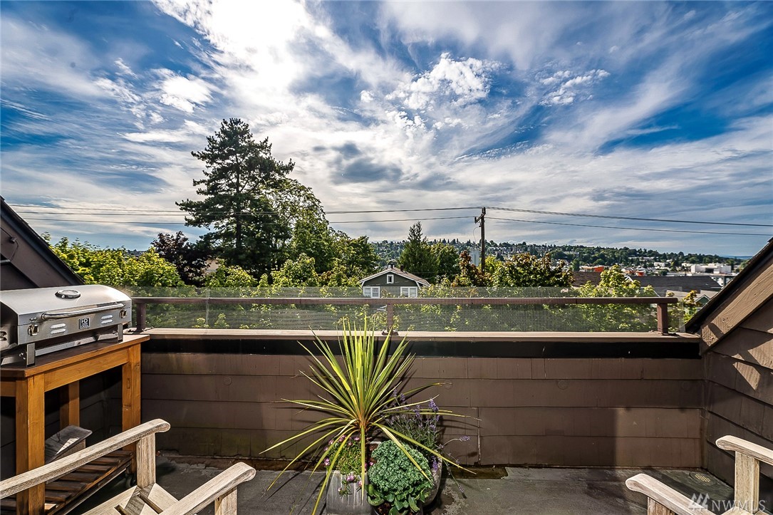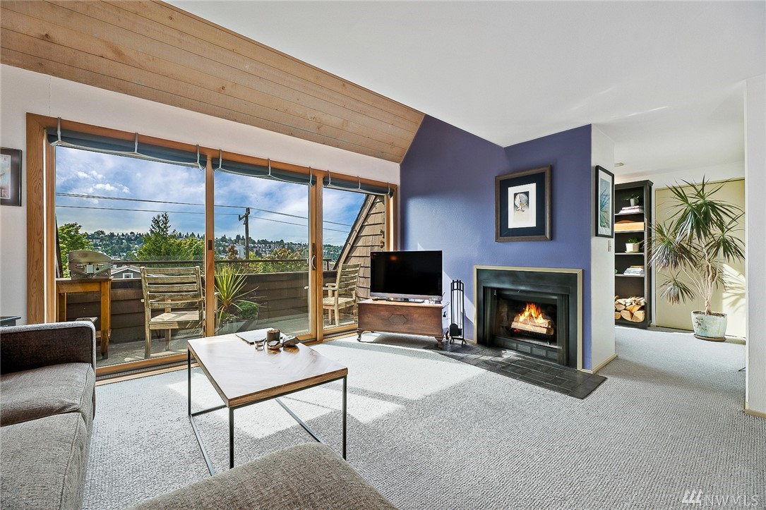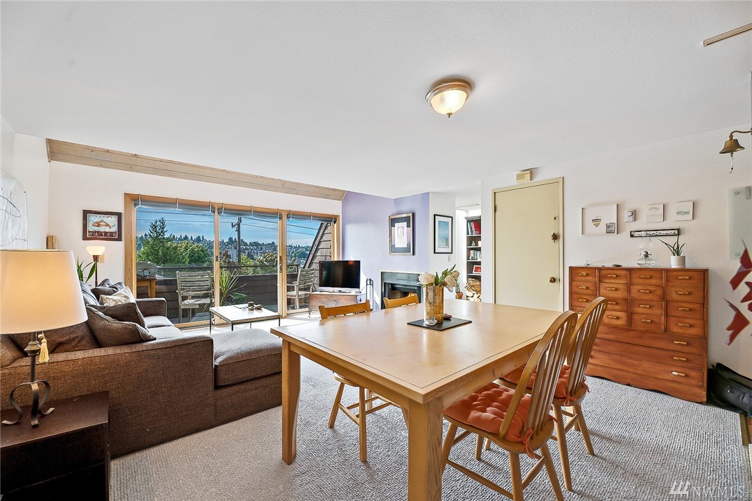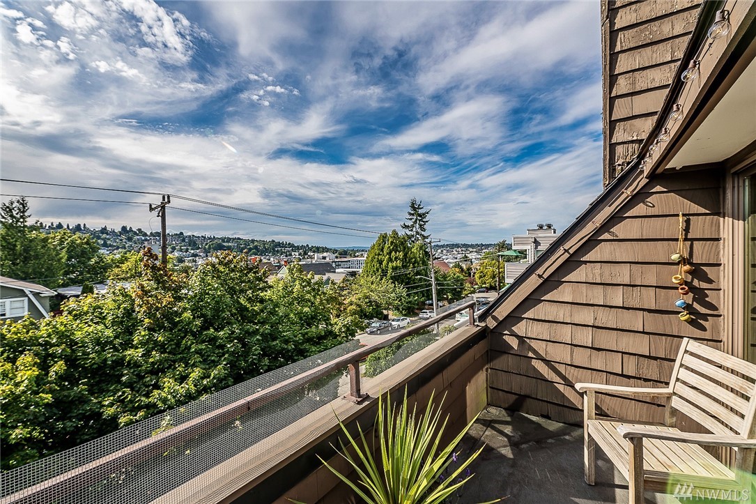 Enter through your own private entrance, w/no lobby or elevators into this uniquely warm & hip loft styled condo on the West slope of Queen Anne! Newer windows provide an abundance of natural light giving a feeling of living in a treehouse. Large living & dining spaces w/open kitchen, bedroom & full bath w/a west facing deck complete the main floor. Upstairs contains a master bedroom w/generous closest spaces & cozy office space, just right for working at home. One car off st parking.