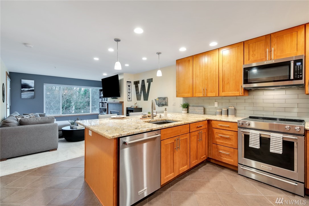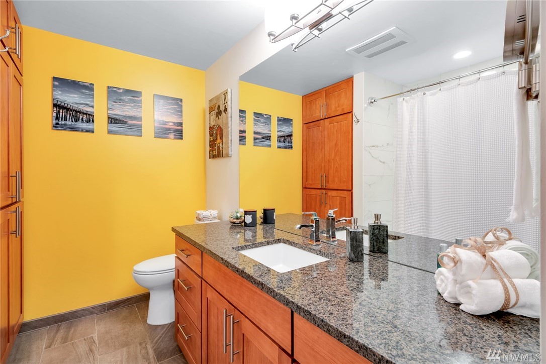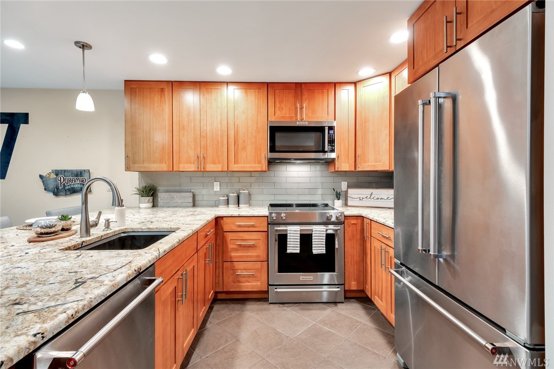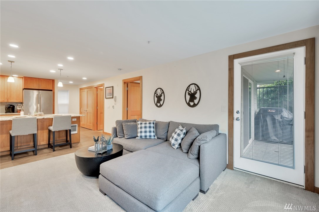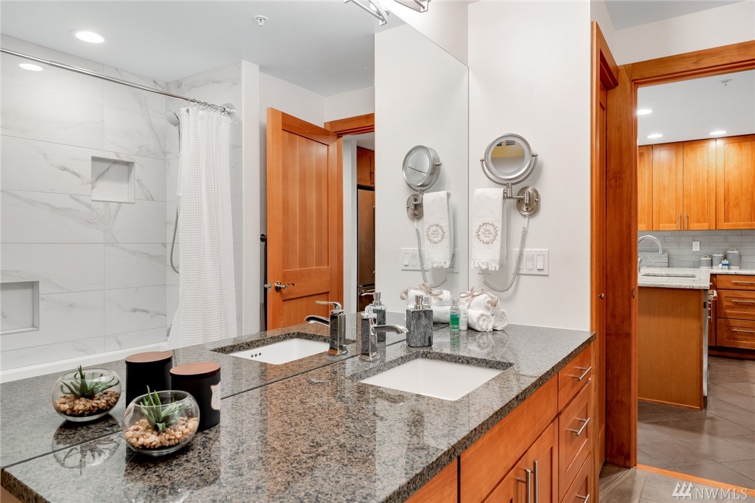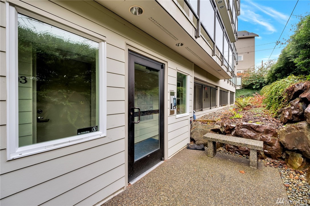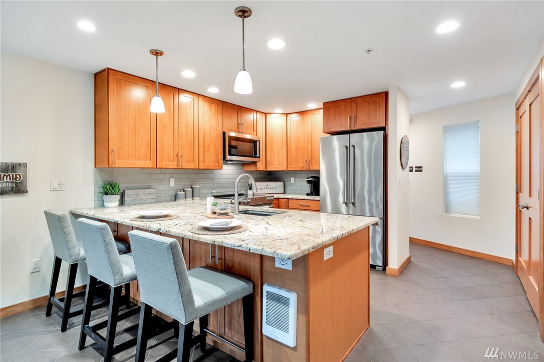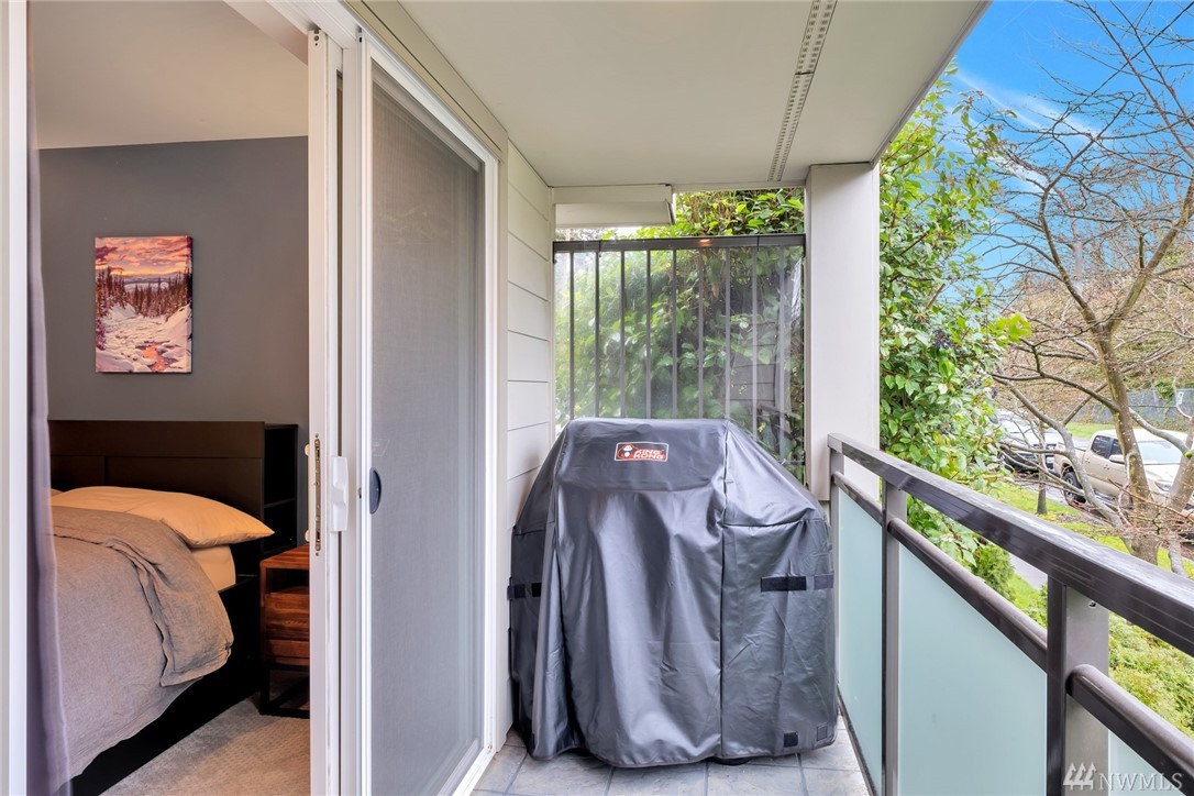 Stunning corner 1 bedroom in desirable Magnolia! The Benson offers upscale finishes including slab granite peninsula, glass subway backsplash, all stainless steel appliances, richly hued wood cabinets & doors throughout, open & bright living room with fireplace, a sitting patio off the master bedroom and a full bath with spa-like finishes. Generous utility & laundry space with french doors, remote control window treatments, ample storage and secure underground garage parking. Easy access to Downtown, Pier 91 bike path, Interbay & Magnolia Village. Secure video entry system, convenient elevator from garage.