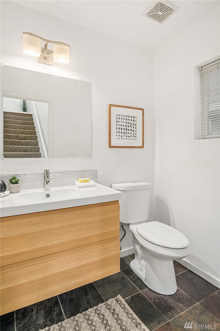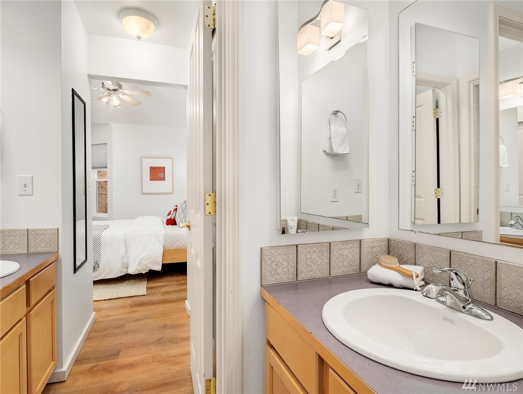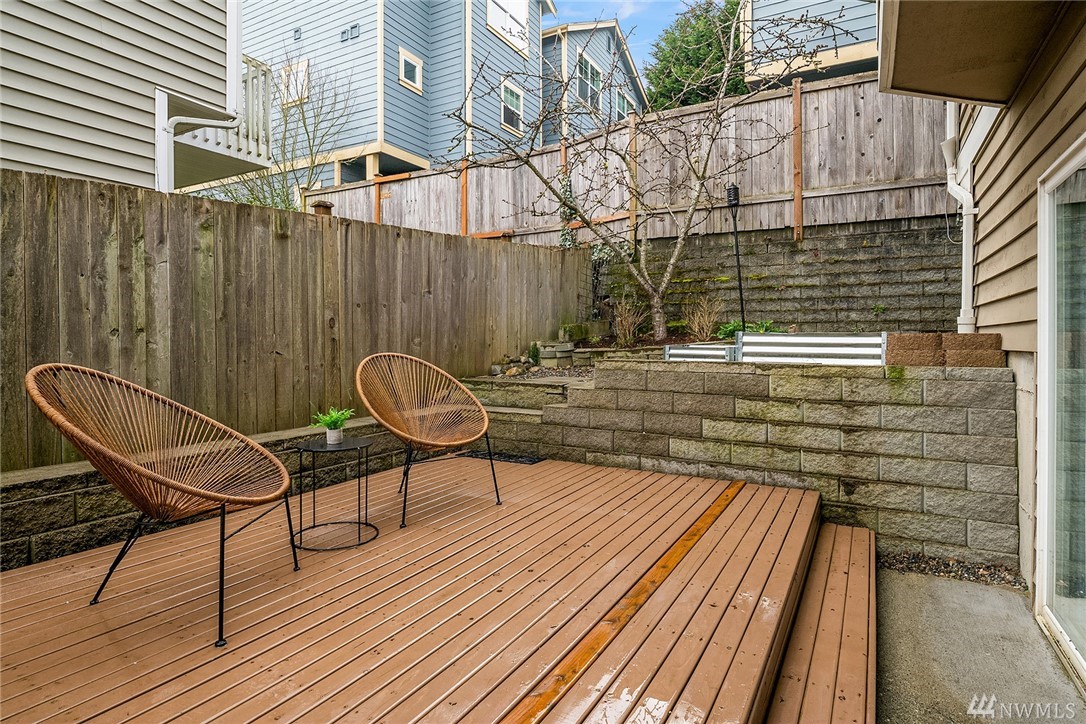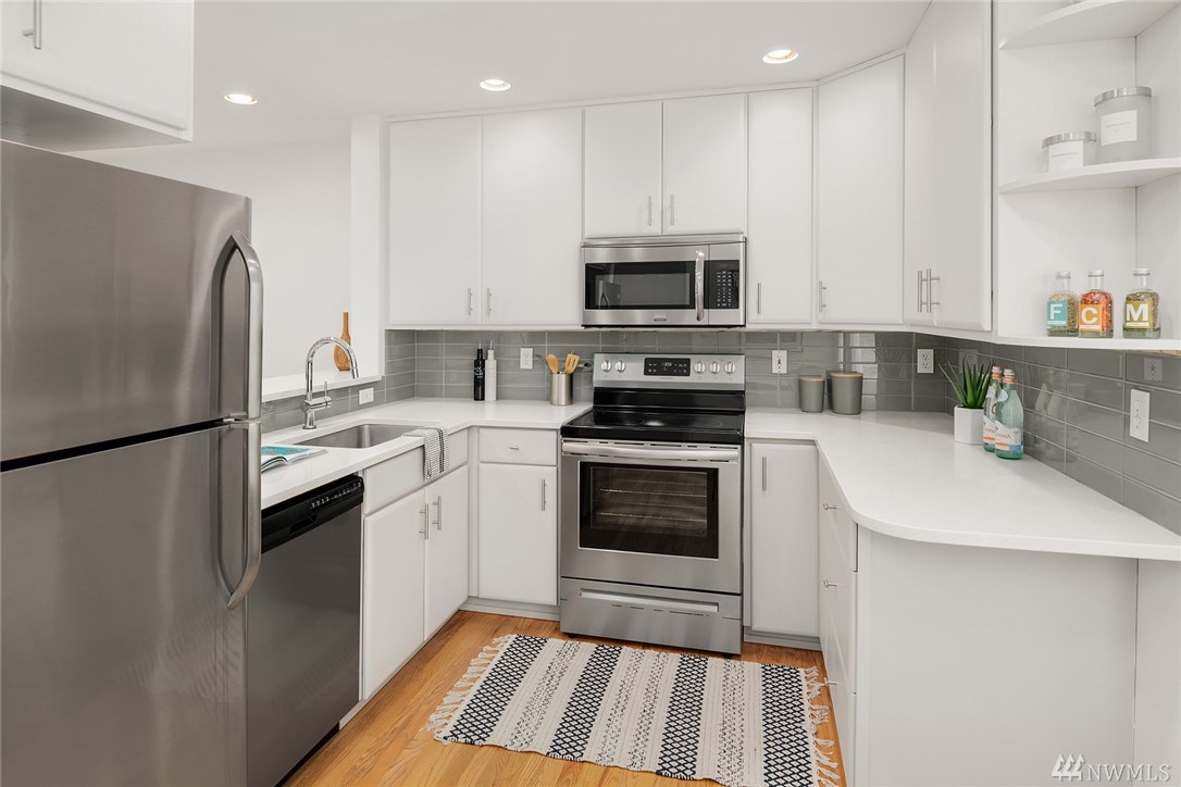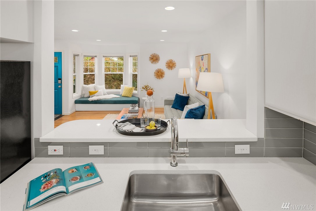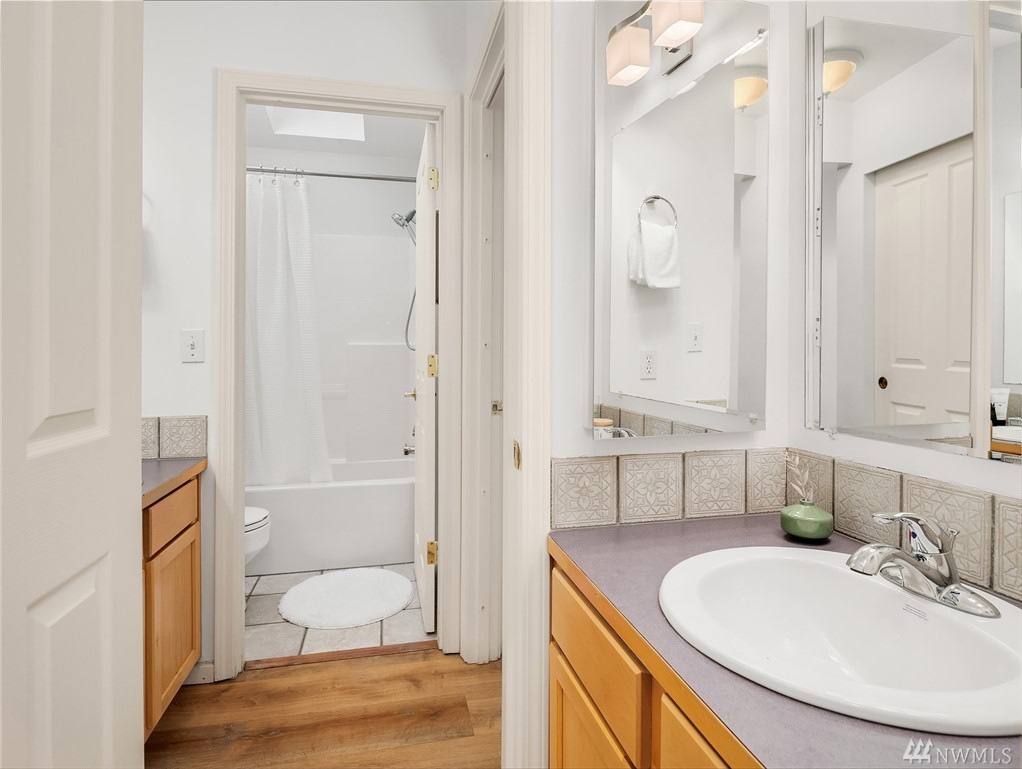 laminate wood flooring upstairs. Stylish updated kitchen has solid surface counters, undermount sink, soft-close drawers, & stainless appliances. The breakfast bar is great for staying connected and there's a comfortable dining area off the kitchen. Upper level features vaulted ceilings, BR ceiling fans, jack-n-jill bathroom w/ 2 brand new sinks, and an optional laundry closet in the hall. The lower level offers the perfect home office or guest suite w/1 BR & 3/4 Bath. Enjoy summer meals on the back deck. 1-car attached Garage plus driveway. No HOA Dues! FUTURE NE 130th Light Rail Station is less than a mile!
