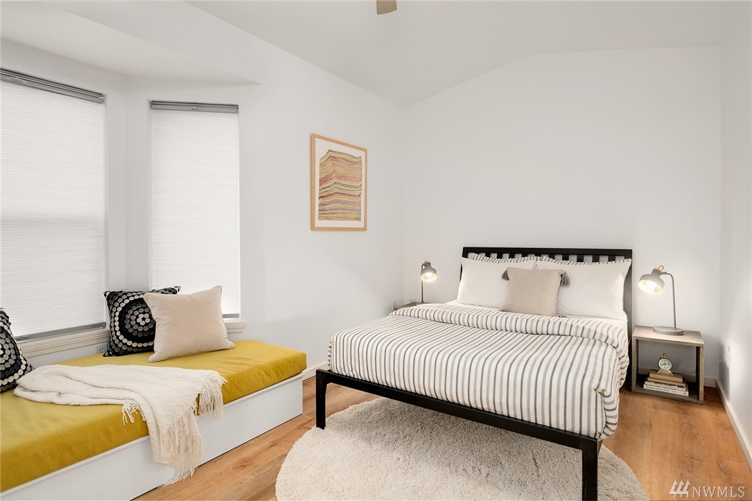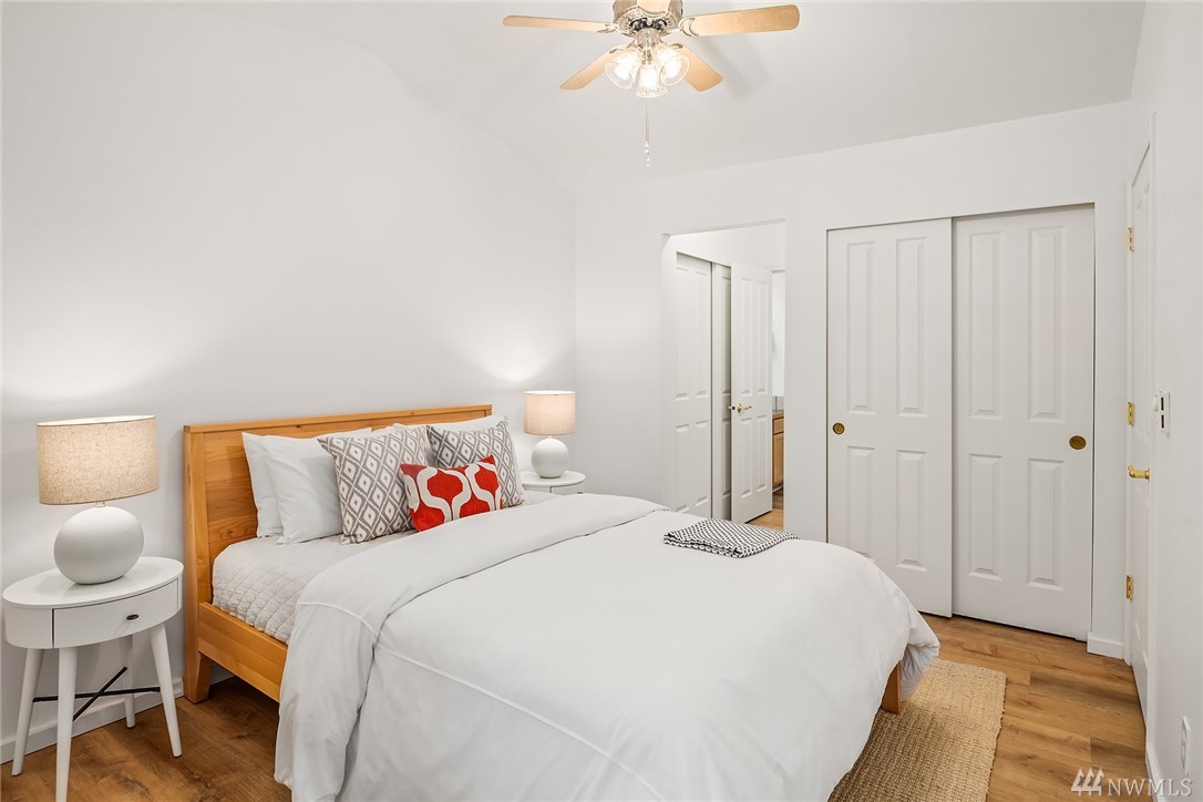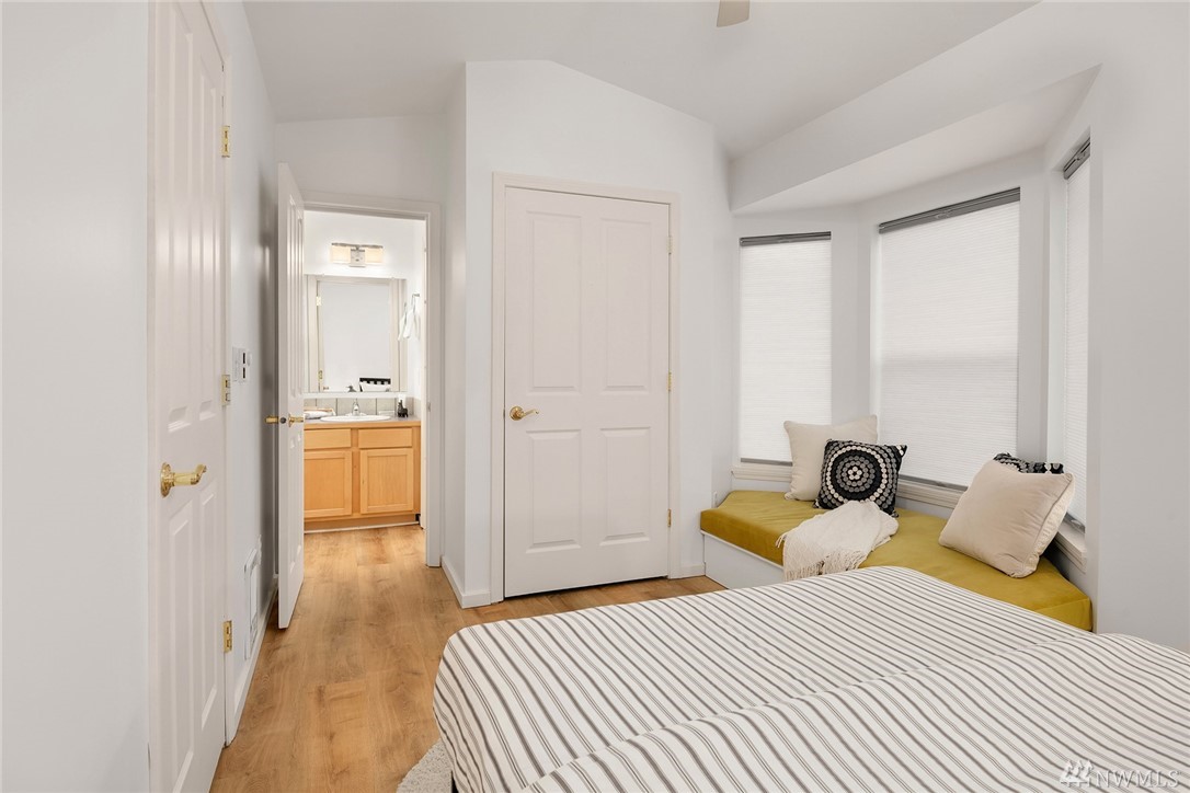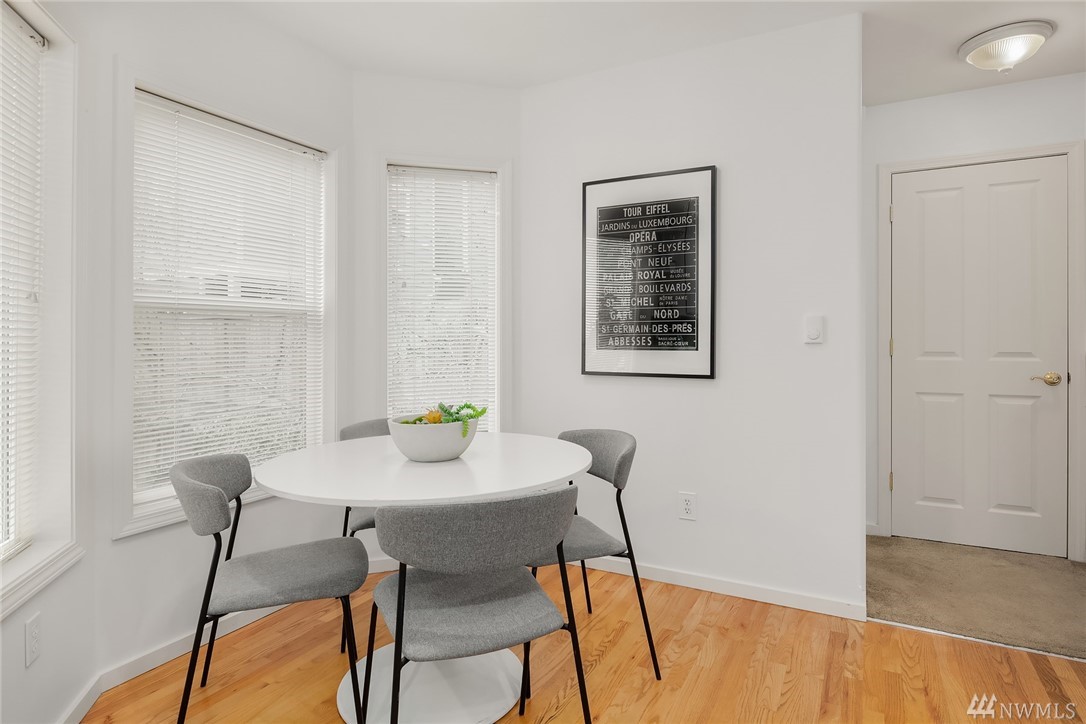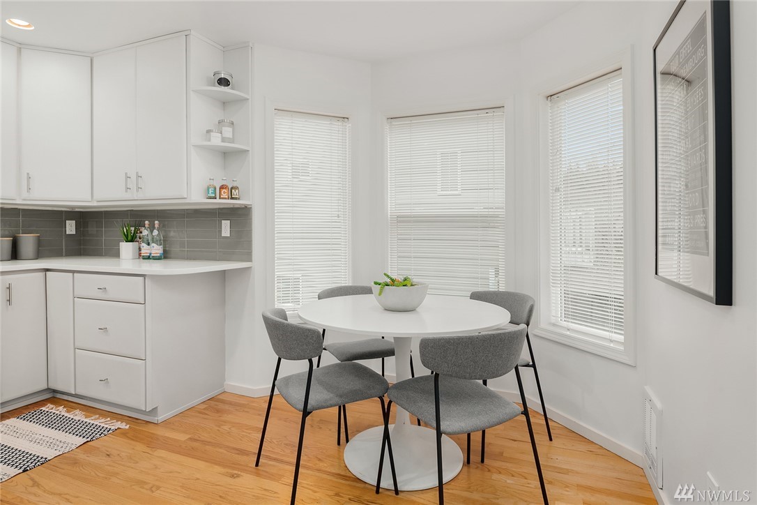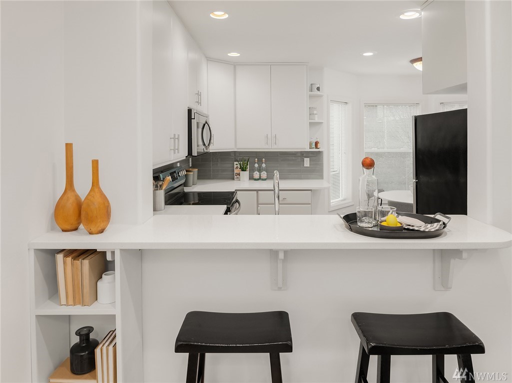 laminate wood flooring upstairs. Stylish updated kitchen has solid surface counters, undermount sink, soft-close drawers, & stainless appliances. The breakfast bar is great for staying connected and there's a comfortable dining area off the kitchen. Upper level features vaulted ceilings, BR ceiling fans, jack-n-jill bathroom w/ 2 brand new sinks, and an optional laundry closet in the hall. The lower level offers the perfect home office or guest suite w/1 BR & 3/4 Bath. Enjoy summer meals on the back deck. 1-car attached Garage plus driveway. No HOA Dues! FUTURE NE 130th Light Rail Station is less than a mile!