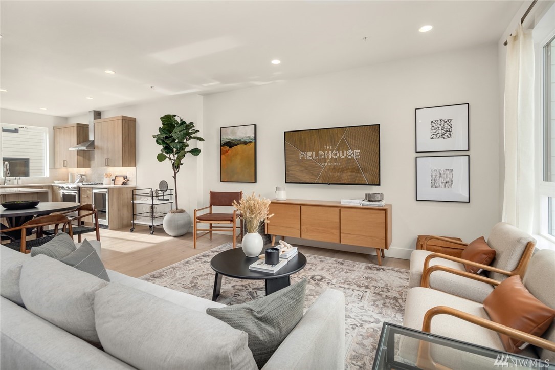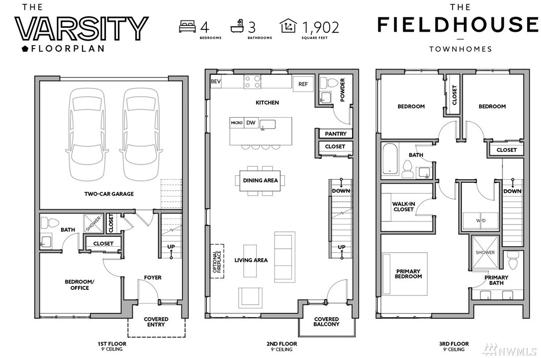 Introducing THE FIELDHOUSE, A Walk Anywhere Community in the heart of DT Bothell just steps to McMenamins, shopping, cafes, parks, trails, and everywhere you want to go! Upgraded features come standard: huge kitchen center island, pantry, Quartz counters, under-cabinet lighting, AC, beverage fridge, KitchenAid appliances, E/V car charger enabled, wrought-iron railings, sleek hardwoods, covered deck and front porch, plentiful storage. Owners suite w/sumptuous bath, spacious walk-in closet, custom ceramic tile. Two car side by side garage! This 4 bedroom "Varsity" is in a premier "end location" (home faces south for maximum natural light) + features GUEST SUITE with adjoining bath on garage level. Beautifully Appointed! Smart + Modern!