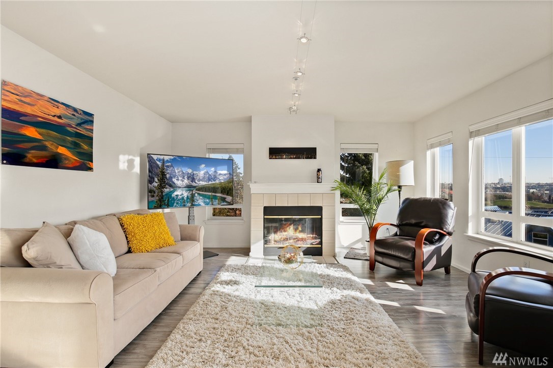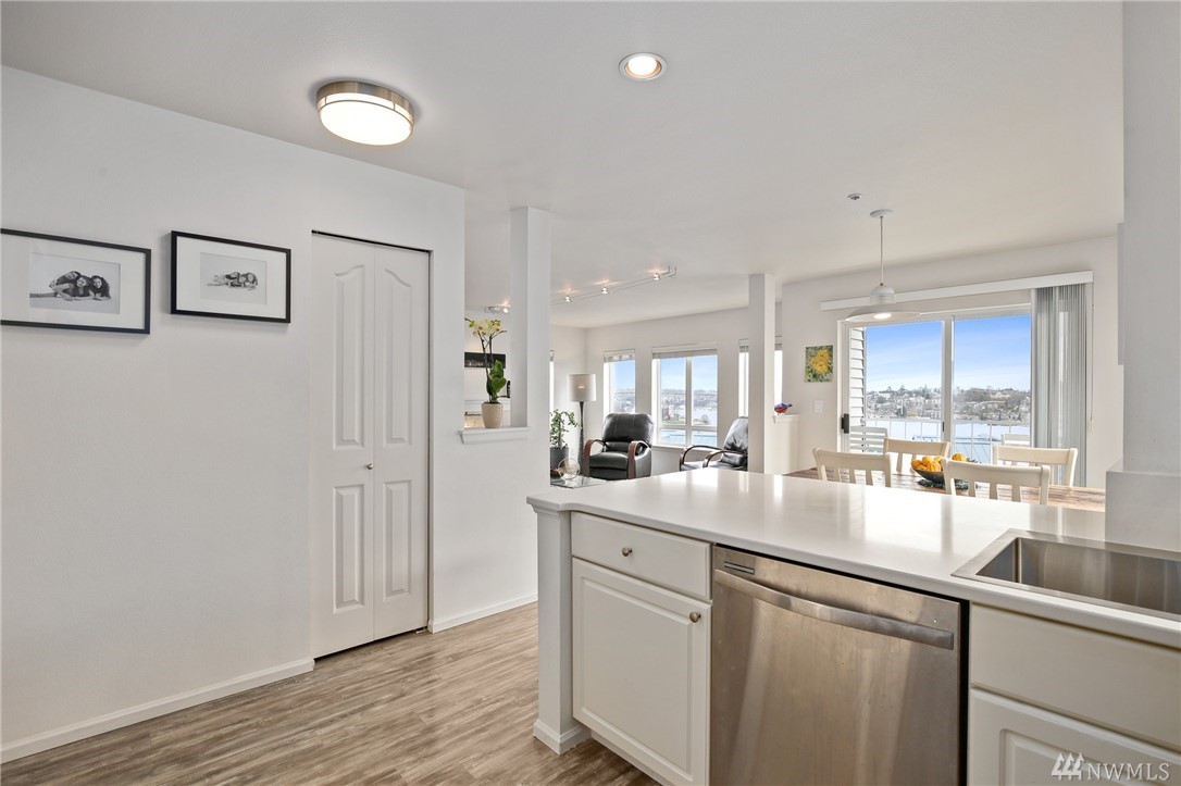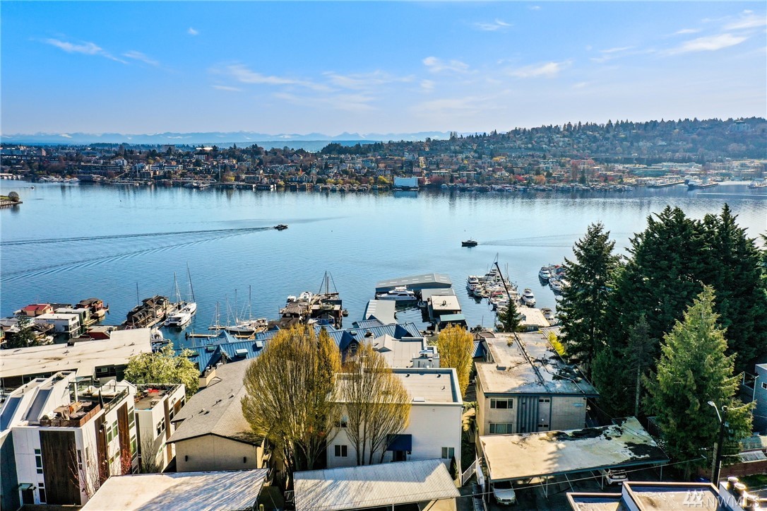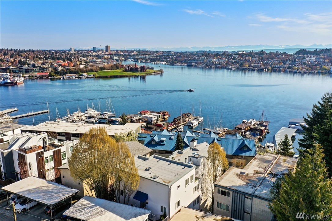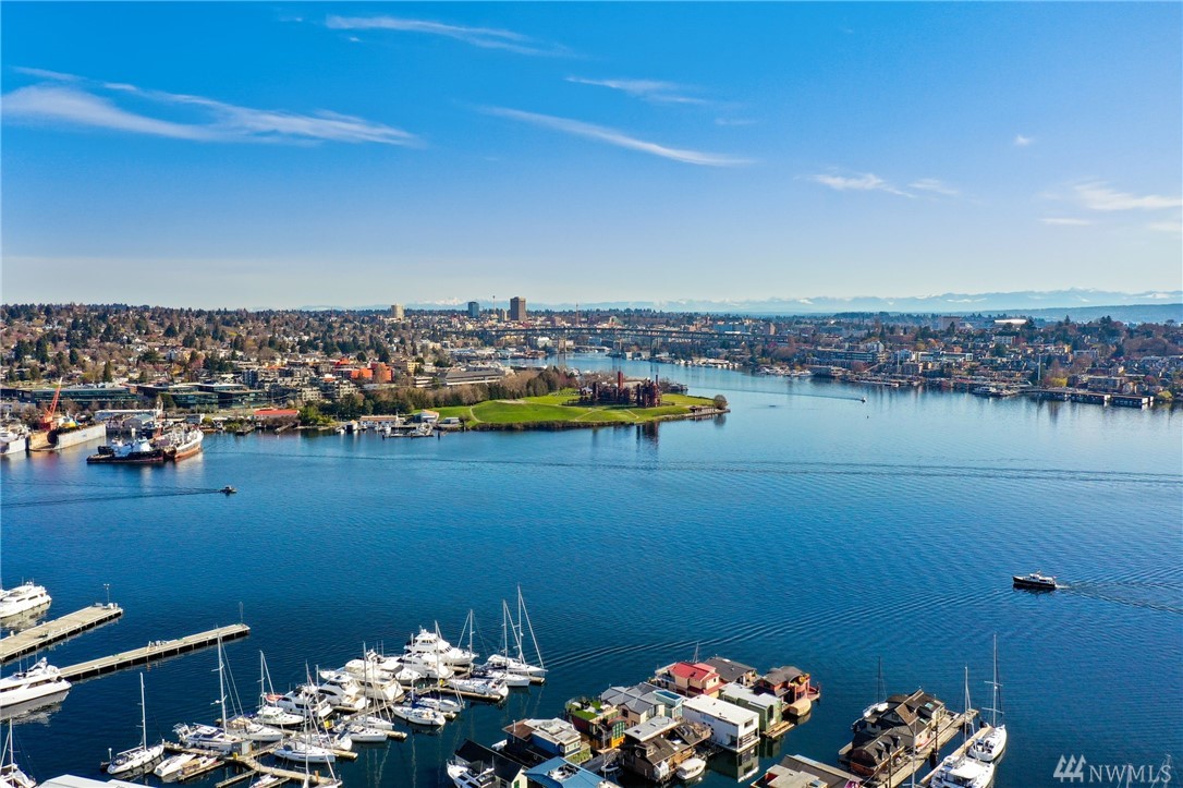 Enjoy stunning & expansive views of Lake Union, Gas Works Park, and the gorgeous Cascades from this spacious 2 bedroom condo.  Light & open floor-plan with new flooring throughout.  Enjoy the cozy fireplace and your front row seats to 4th of July fireworks! New kitchen counters with bar seating, stainless steel appliances, and new deep stainless sink. Imagine watching the sea planes land on Lake Union while washing dishes and prepping dinner! Huge master-suite with room for King bed, walk-in closet, en suite bathroom, and private balcony. Spacious 2nd bedroom and full bathroom for guests. Parking in secure garage + additional storage space. Walk to SLU, Downtown, hip Fremont with easy access to I-5 and 99! Urban living at it's best!