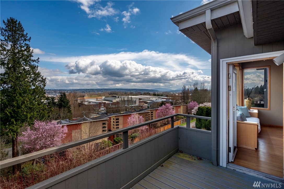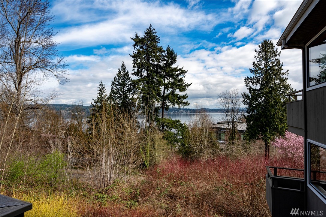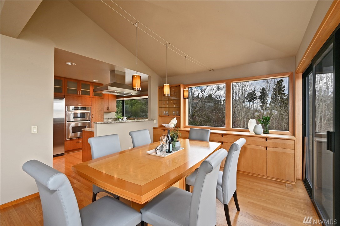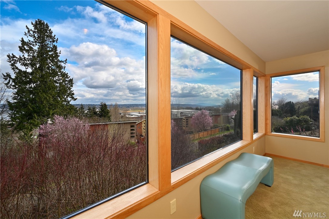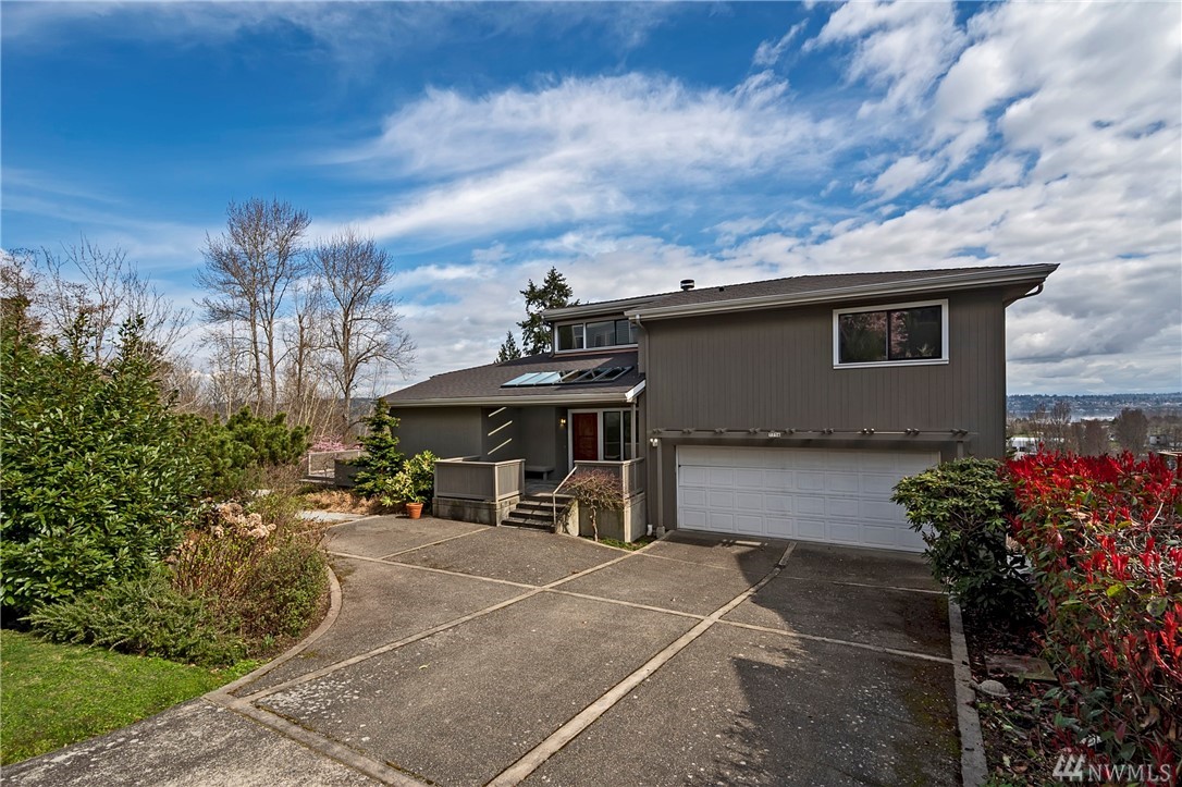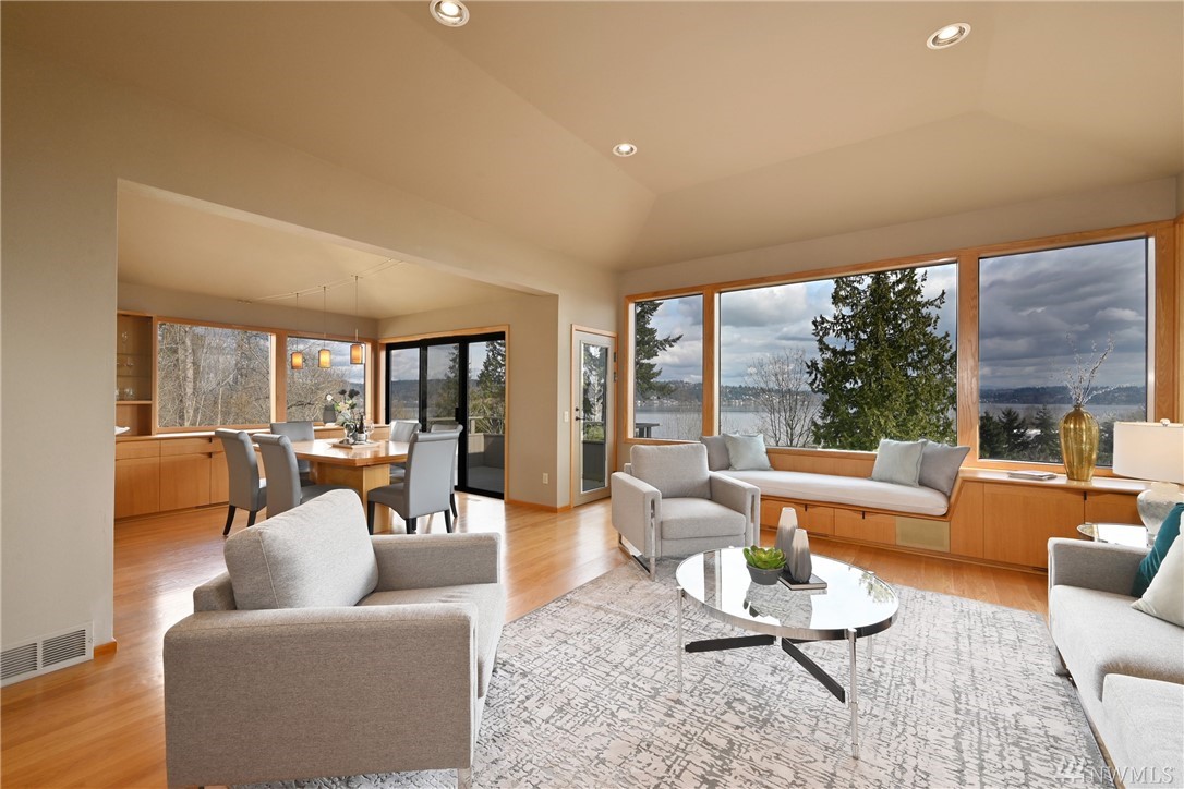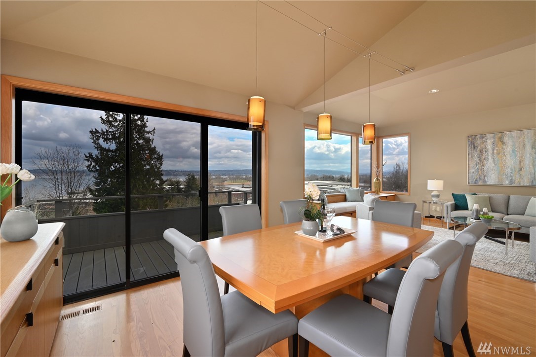 Private in city, luxurious view home. Overlooks Magnuson Park, Burke Gilman & Lake Washington. Sweeping lake / Mt. Rainier panoramas. Contemporary vaulted ceiling kitchen, dining, & architecturally captivating living room. Upstairs master w/ steam shower. Two separate but equal living areas: view-rich main & next floor down. Second kitchen (easy M.I.L.). A/C throughout. Spacious: 2 car garage w/generous built-in cabinets & HUGE unfinished basement storage for extra furniture, sports equipment & more. Parking for 5. Nature surrounds this stylish contemporary tucked in a cul-de-sac with amazing sunrise views. No traffic on tranquil street for rare, invisible serenity in the heart of Seattle. Optional View Ridge Swim & Tennis Club membership.