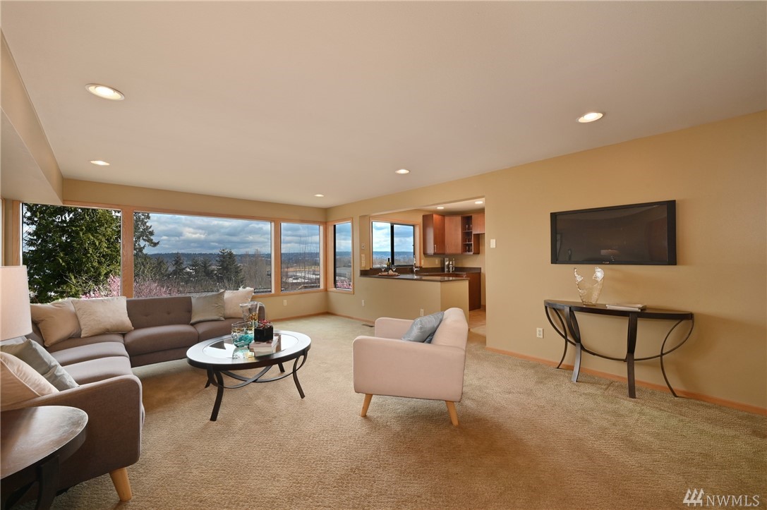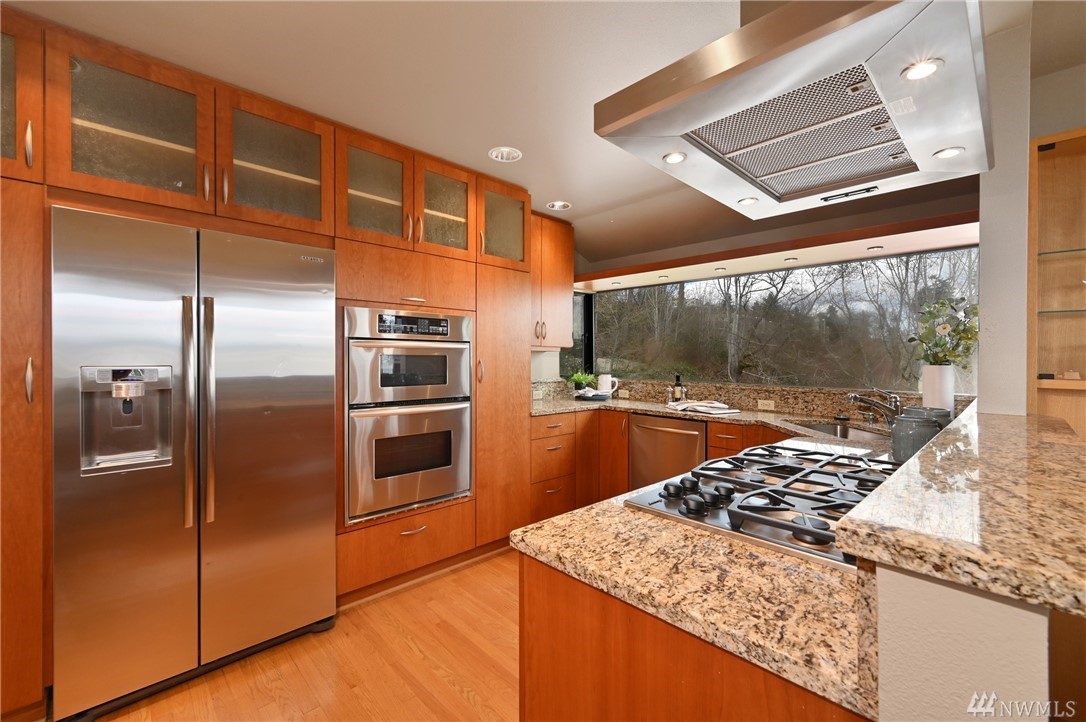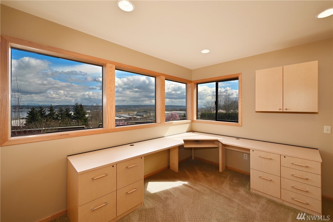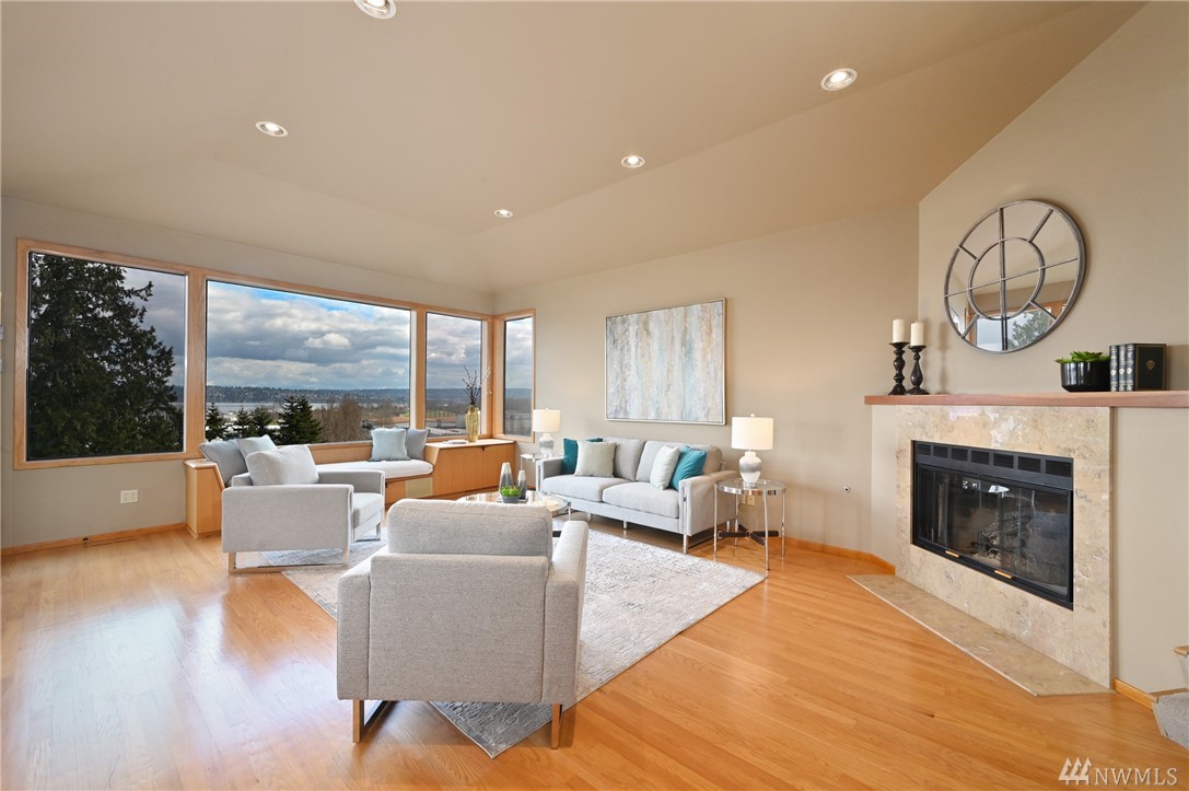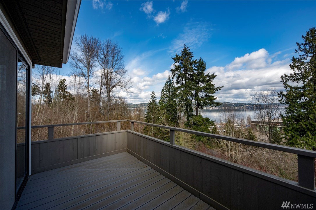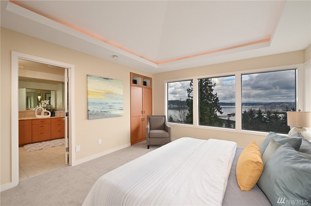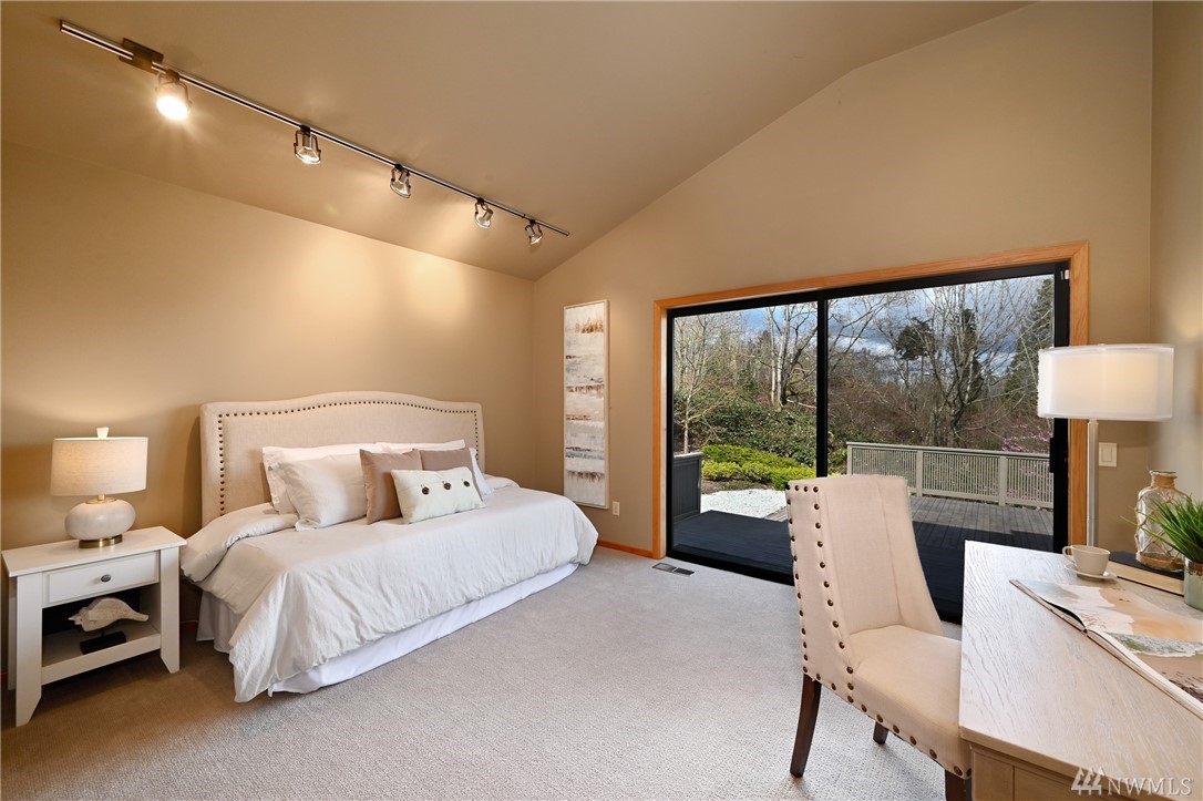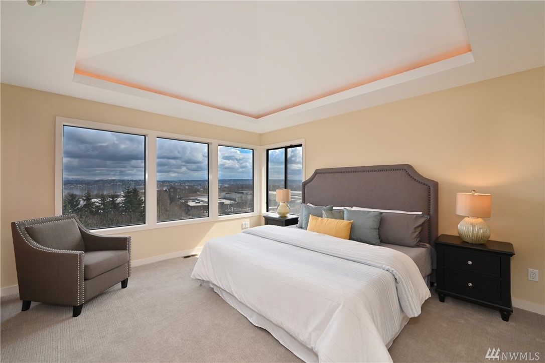 Private in city, luxurious view home. Overlooks Magnuson Park, Burke Gilman & Lake Washington. Sweeping lake / Mt. Rainier panoramas. Contemporary vaulted ceiling kitchen, dining, & architecturally captivating living room. Upstairs master w/ steam shower. Two separate but equal living areas: view-rich main & next floor down. Second kitchen (easy M.I.L.). A/C throughout. Spacious: 2 car garage w/generous built-in cabinets & HUGE unfinished basement storage for extra furniture, sports equipment & more. Parking for 5. Nature surrounds this stylish contemporary tucked in a cul-de-sac with amazing sunrise views. No traffic on tranquil street for rare, invisible serenity in the heart of Seattle. Optional View Ridge Swim & Tennis Club membership.