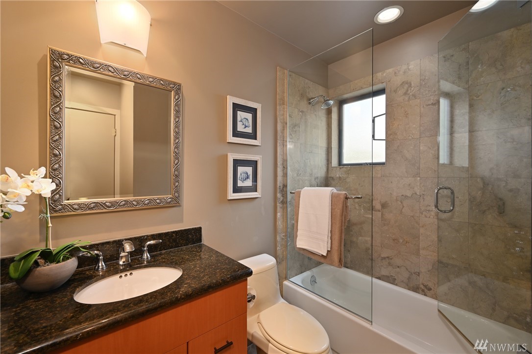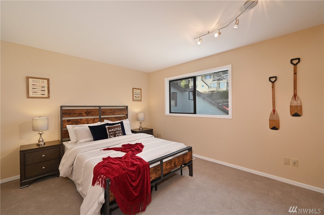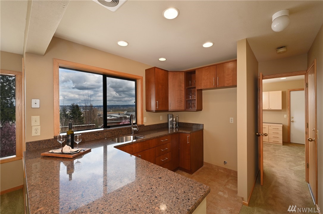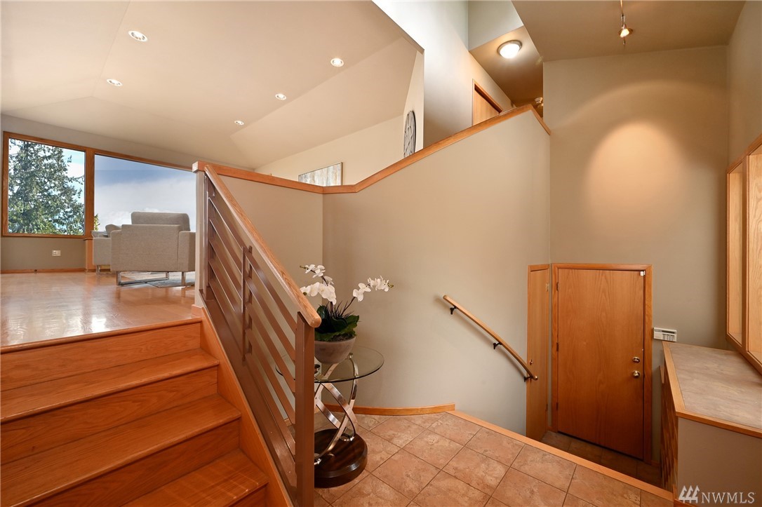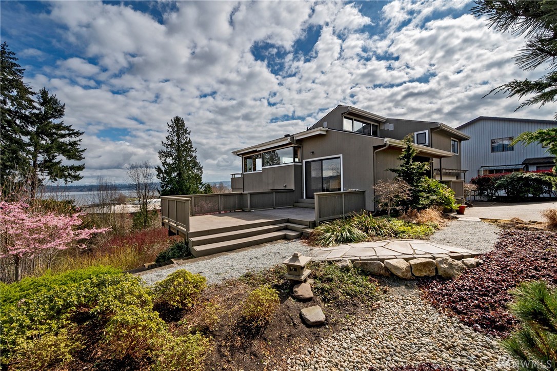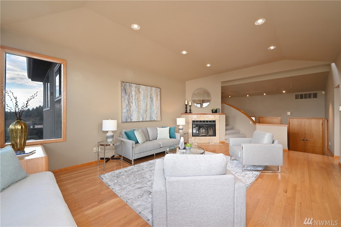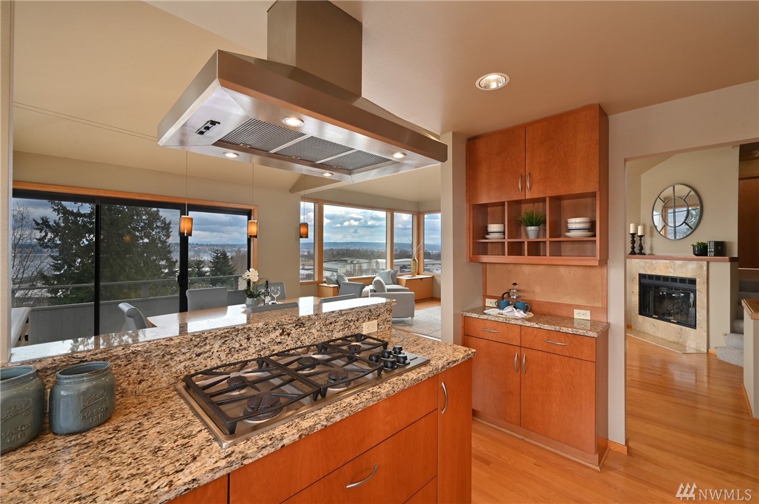 Private in city, luxurious view home. Overlooks Magnuson Park, Burke Gilman & Lake Washington. Sweeping lake / Mt. Rainier panoramas. Contemporary vaulted ceiling kitchen, dining, & architecturally captivating living room. Upstairs master w/ steam shower. Two separate but equal living areas: view-rich main & next floor down. Second kitchen (easy M.I.L.). A/C throughout. Spacious: 2 car garage w/generous built-in cabinets & HUGE unfinished basement storage for extra furniture, sports equipment & more. Parking for 5. Nature surrounds this stylish contemporary tucked in a cul-de-sac with amazing sunrise views. No traffic on tranquil street for rare, invisible serenity in the heart of Seattle. Optional View Ridge Swim & Tennis Club membership.