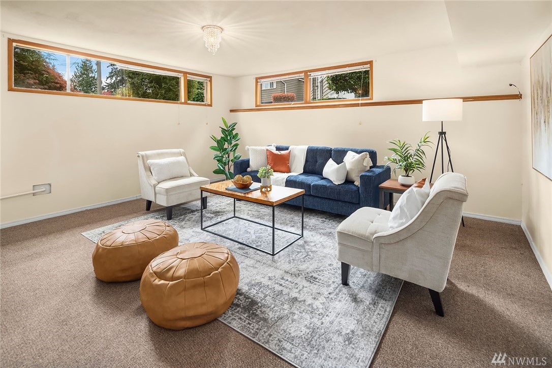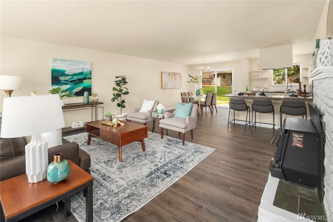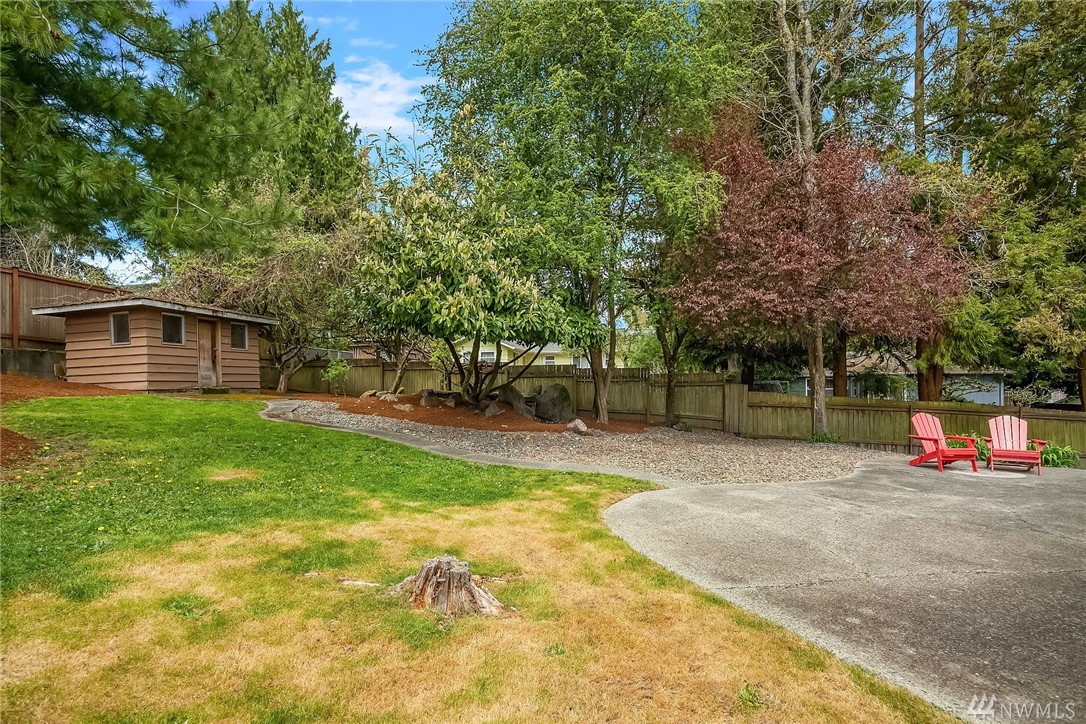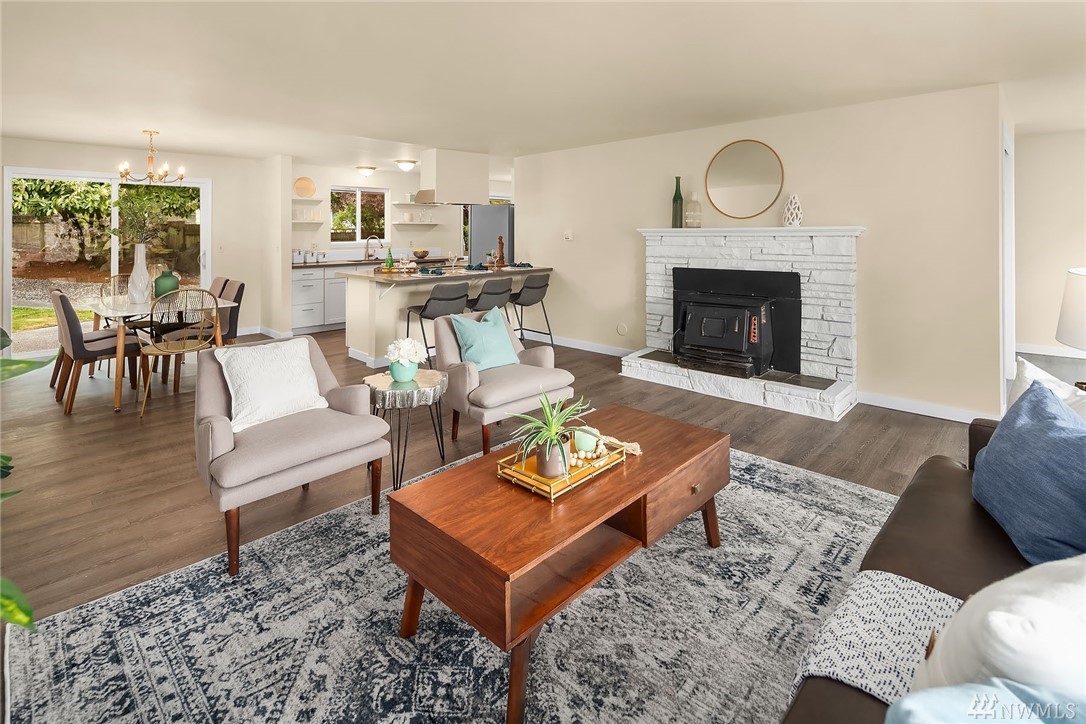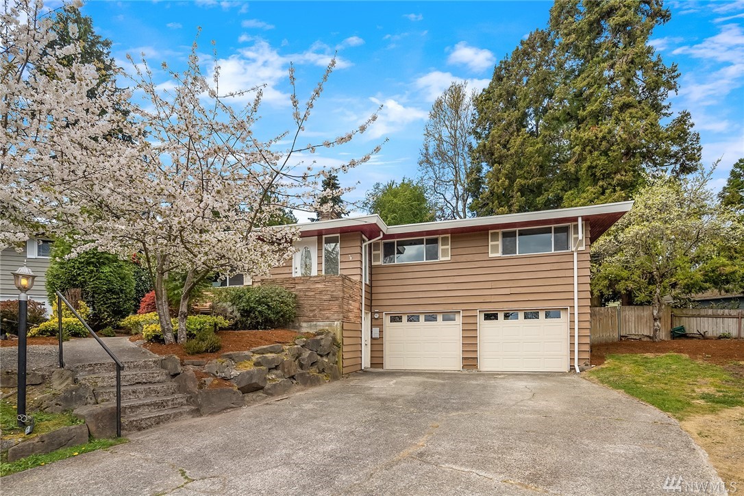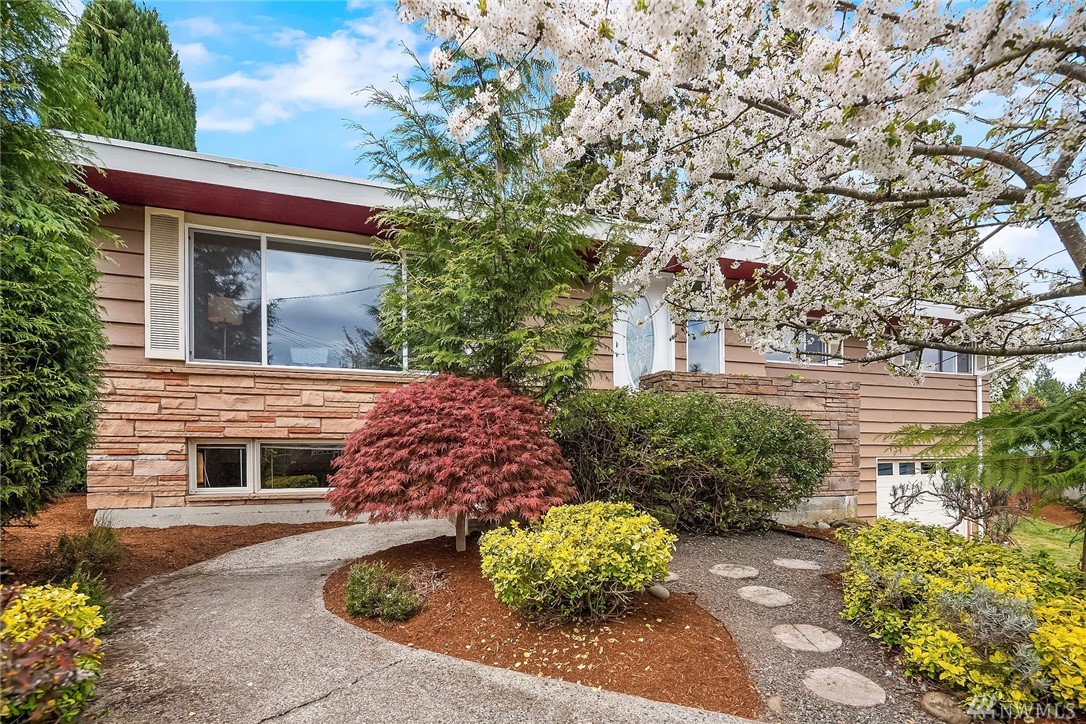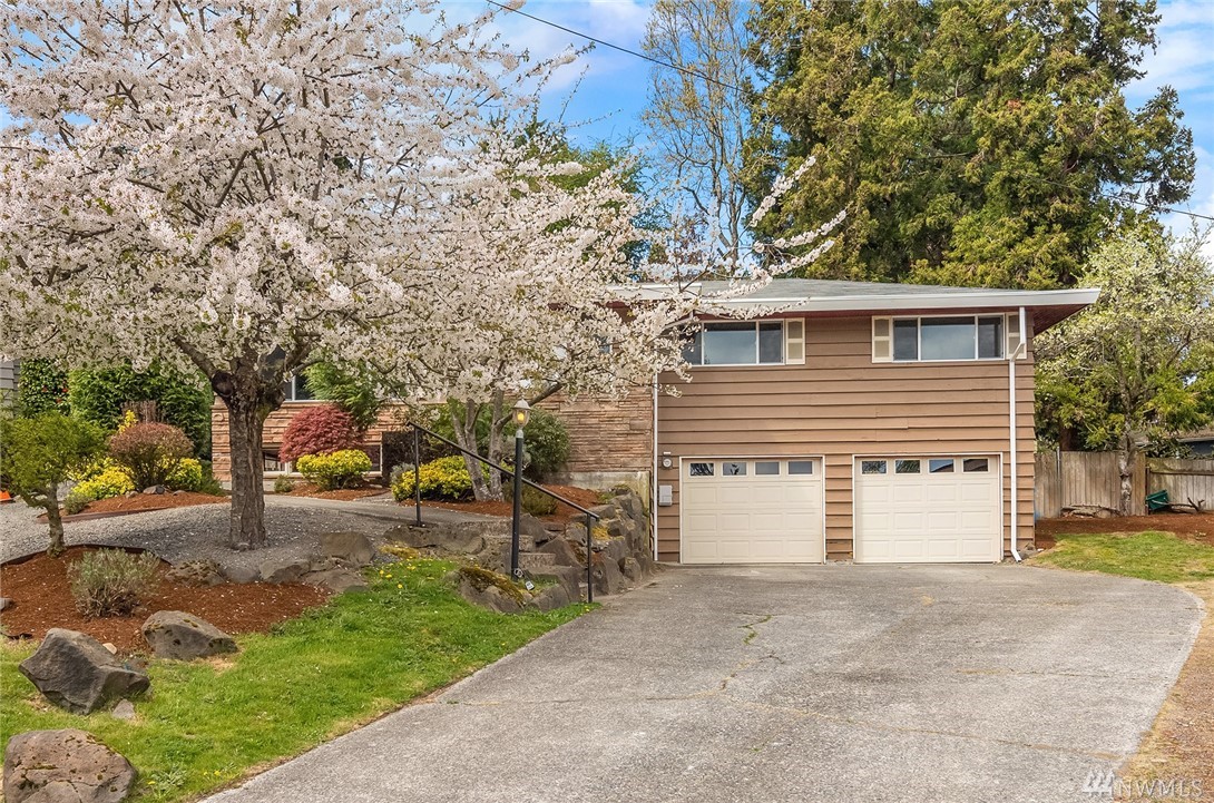 Shoreline classic, in desirable Ridgecrest neighborhood, offers mid-century vibe complimented with numerous updates. Situated on a quiet cul-de-sac, flanked by two beautiful Cherry trees, this may be the home you have been searching for. Light filled open living areas, highlighted by a remodeled kitchen and a large stone fireplace; you will be inspired. A small kitchen nook offers a gathering space for WFH, school projects & morning coffee. 3 Bedrooms on the main is super convenient. Lower level offers a large bonus room, a den/office plus ¾ bath. Spacious two car attached garage offers work shop area & storage galore. Lovely fenced back yard with a large patio and low maintenance private yard offer endless possibilities.