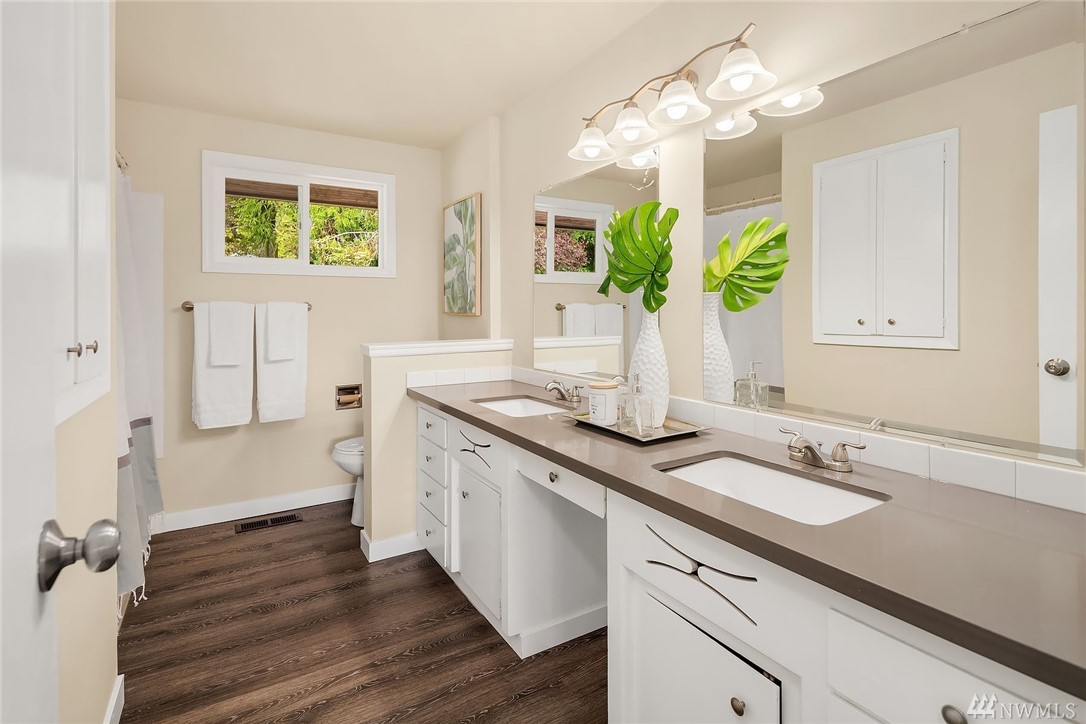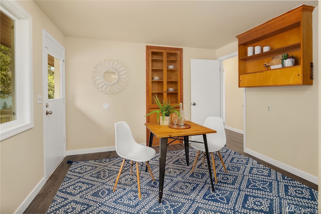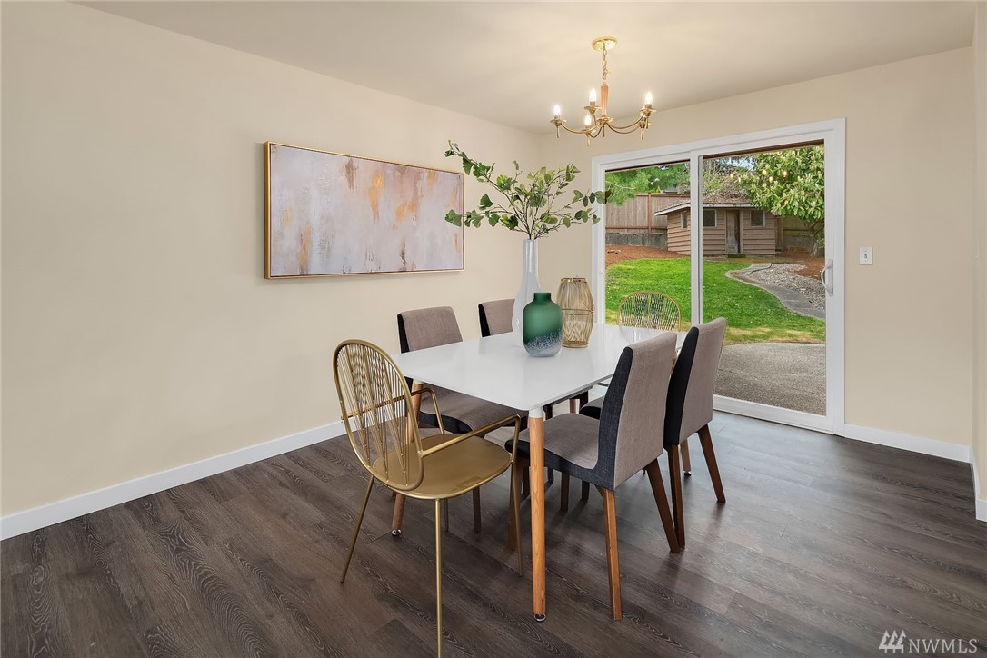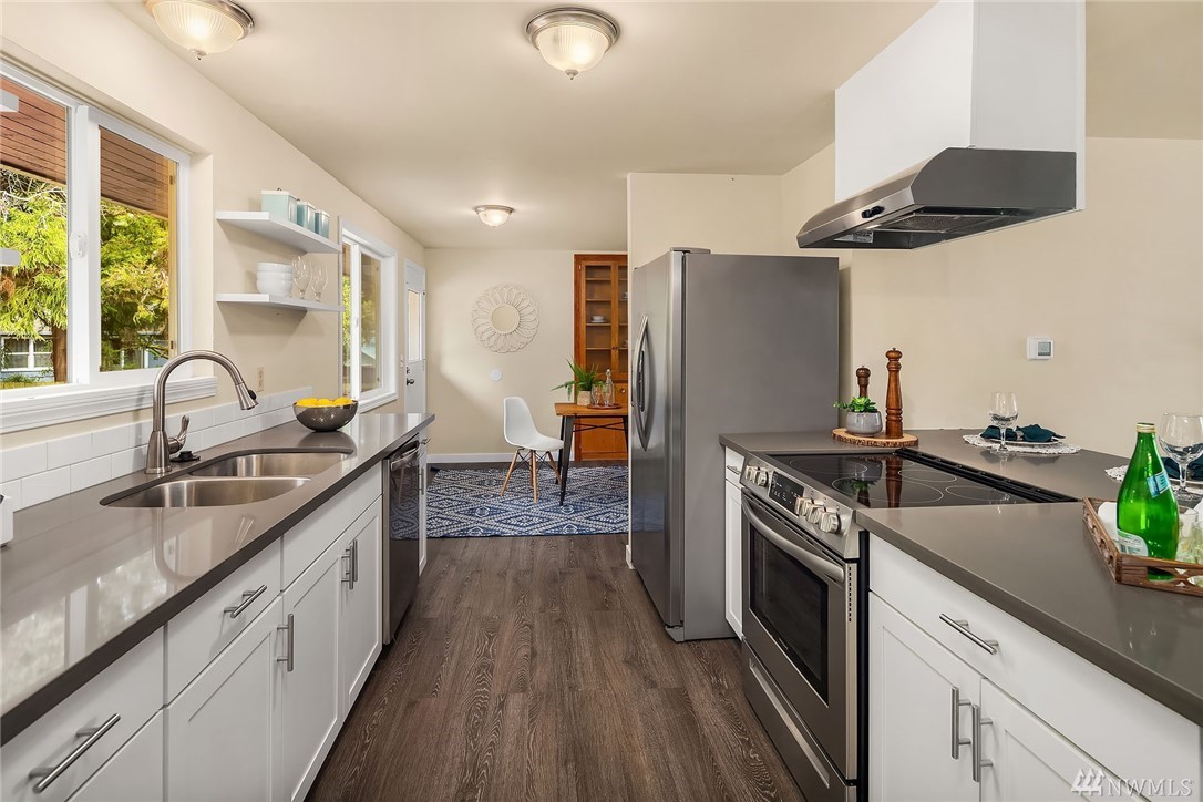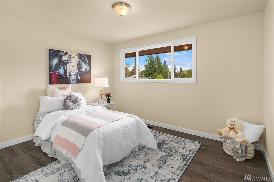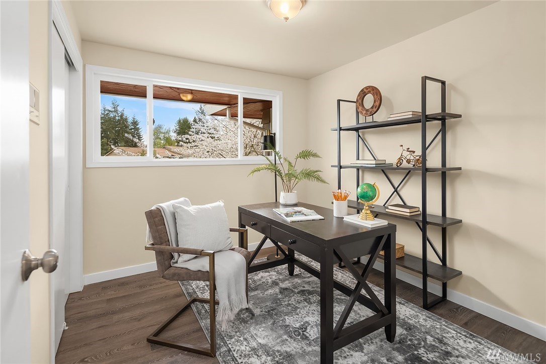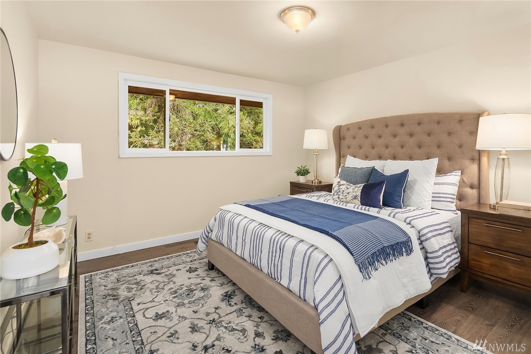 Shoreline classic, in desirable Ridgecrest neighborhood, offers mid-century vibe complimented with numerous updates. Situated on a quiet cul-de-sac, flanked by two beautiful Cherry trees, this may be the home you have been searching for. Light filled open living areas, highlighted by a remodeled kitchen and a large stone fireplace; you will be inspired. A small kitchen nook offers a gathering space for WFH, school projects & morning coffee. 3 Bedrooms on the main is super convenient. Lower level offers a large bonus room, a den/office plus ¾ bath. Spacious two car attached garage offers work shop area & storage galore. Lovely fenced back yard with a large patio and low maintenance private yard offer endless possibilities.