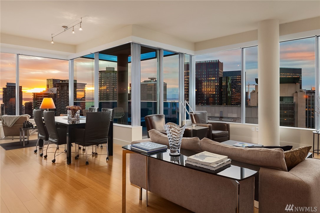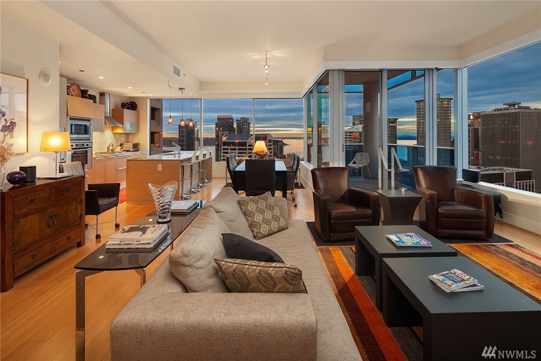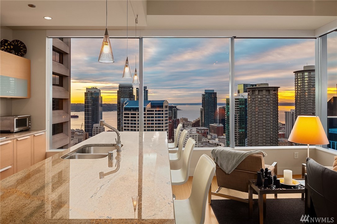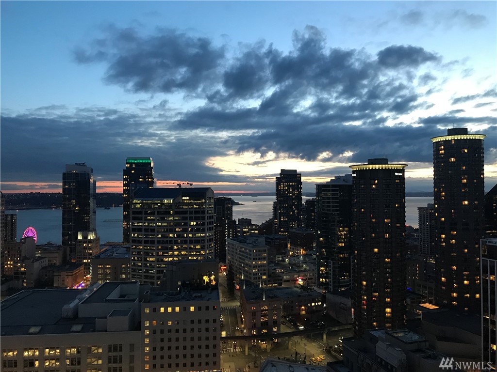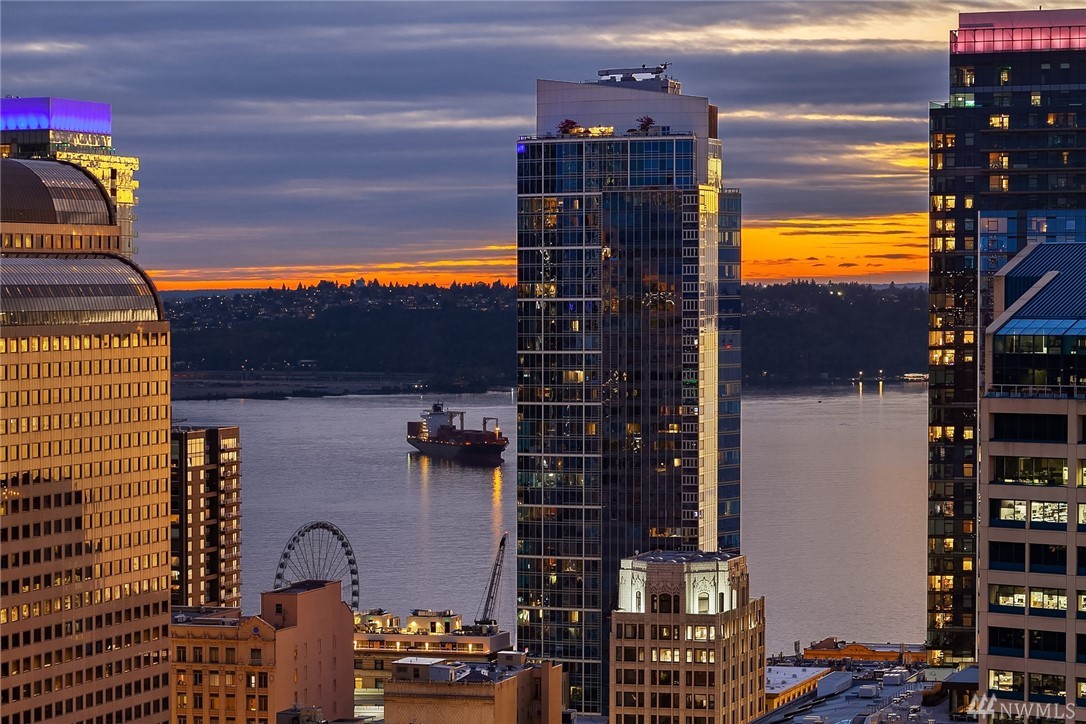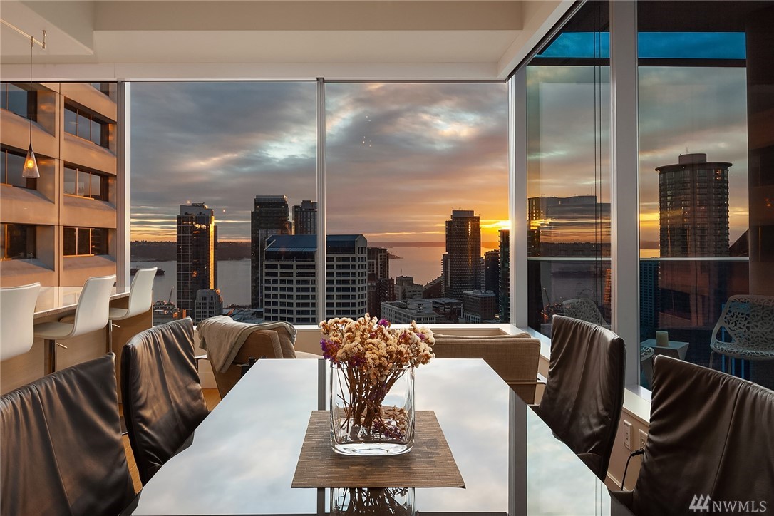 Sparkling City lights, Sound and mountain views from this rare NW corner home at Olive 8! 10' ceilings, Marble baths, Pedini kitchen. World-class hotel amenities: 24-hour concierge, room service, gym, saline lap pool & spa. Residents-only club w/ BBQ terrace, dog run & grooming station, entertainment room & caterer's kitchen. Walk to shopping, theaters, restaurants, Amazon, Whole Foods. Easy access to I-5, light rail & SLU streetcar. EV charger. Experience the best that city life has to offer!