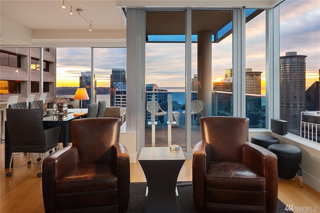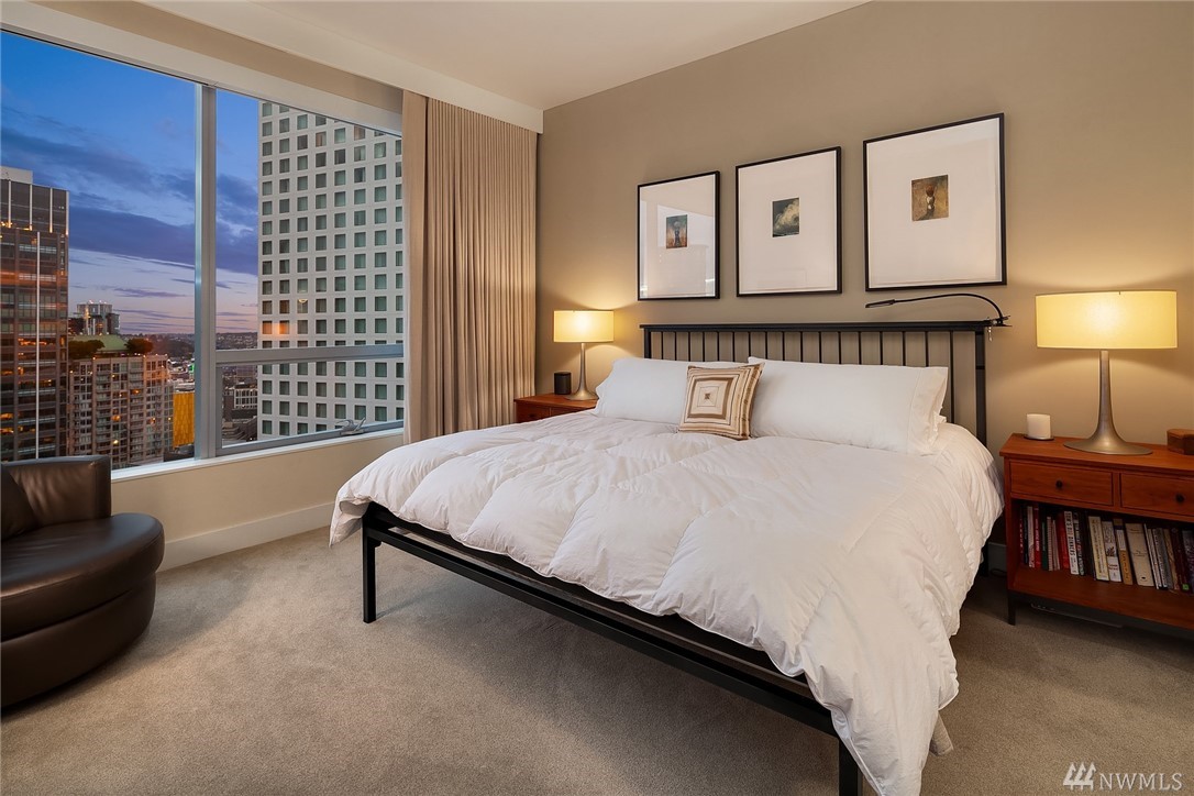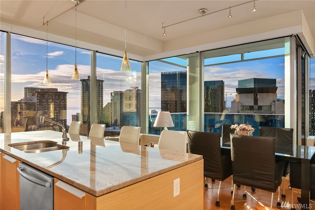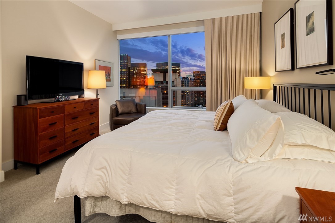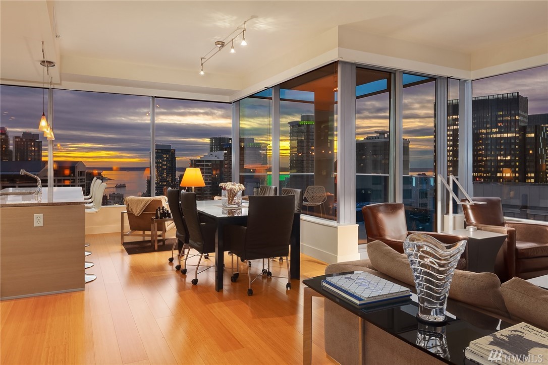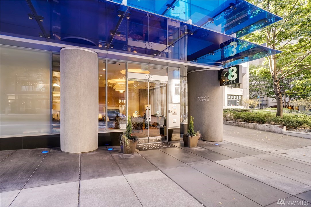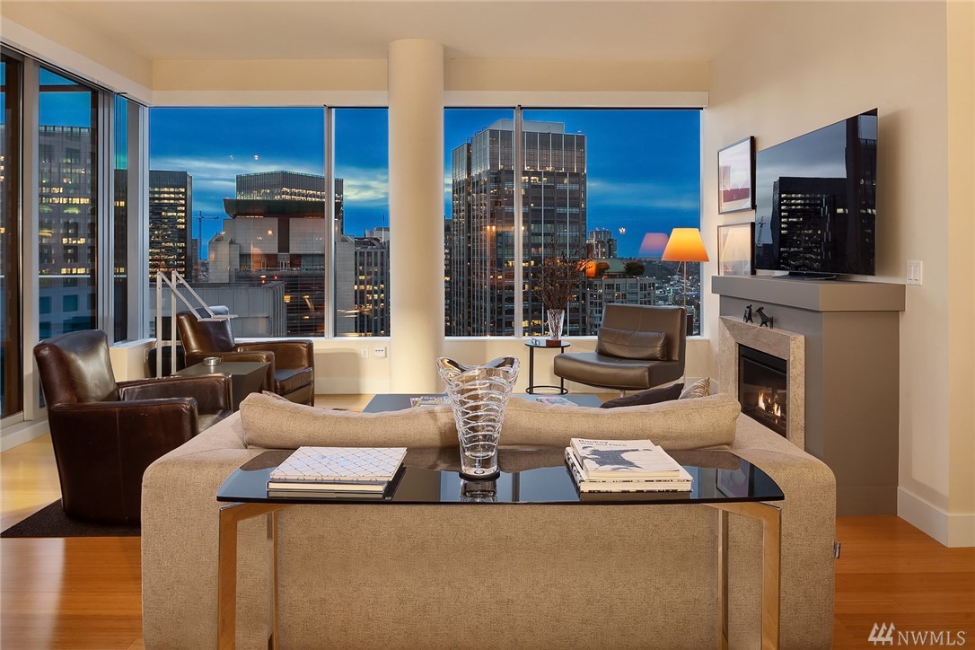 Sparkling City lights, Sound and mountain views from this rare NW corner home at Olive 8! 10' ceilings, Marble baths, Pedini kitchen. World-class hotel amenities: 24-hour concierge, room service, gym, saline lap pool & spa. Residents-only club w/ BBQ terrace, dog run & grooming station, entertainment room & caterer's kitchen. Walk to shopping, theaters, restaurants, Amazon, Whole Foods. Easy access to I-5, light rail & SLU streetcar. EV charger. Experience the best that city life has to offer!