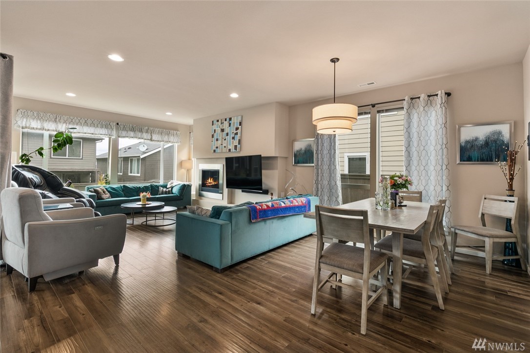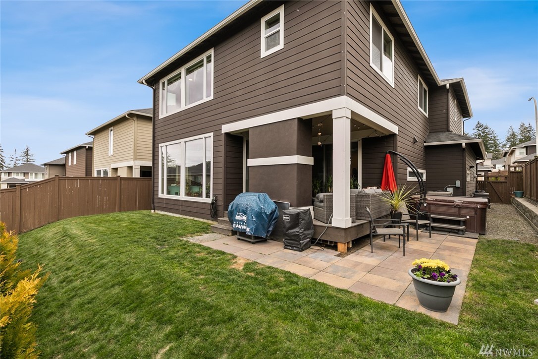 Stunning 3170 sf, 4 bed, 2.5 home on generous .11 acre lot in the Lakeland Hills Community. 2 car garage, beautiful stone pillars, covered front porch & easy to maintain landscape. Fenced back yard & covered back patio w/fireplace for outdoor entertaining! Hardwood floors on main, modern frosted glass doors, modern light fixtures and desirable open floor plan! Formal living and Dining and slider(s) access off living room/kitchen to outdoor living. Kitchen boasts SS appliances, gas range, tons of cabinets for storage/slab counters for prep, large island with sink/storage/seating plus a walk-in pantry. Upper floor loft and spacious Master Suite with private 5pc bath plus large walk-in closet. Easy freeway access & close to shopping/dining!
