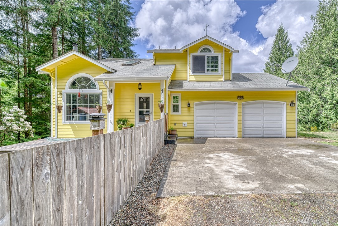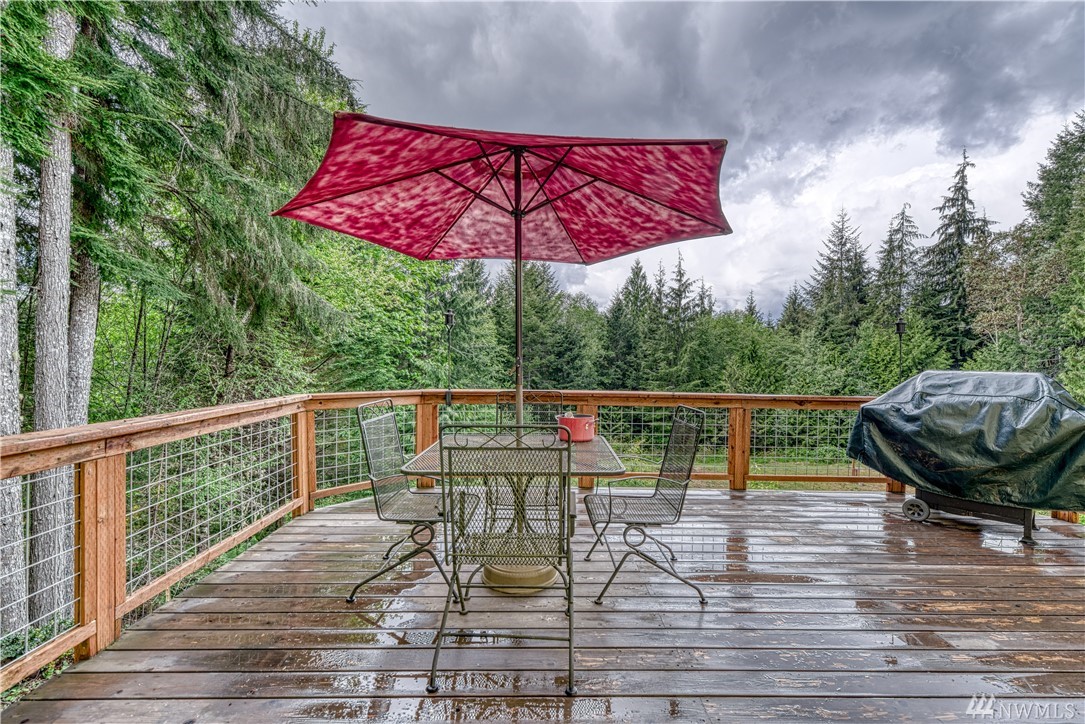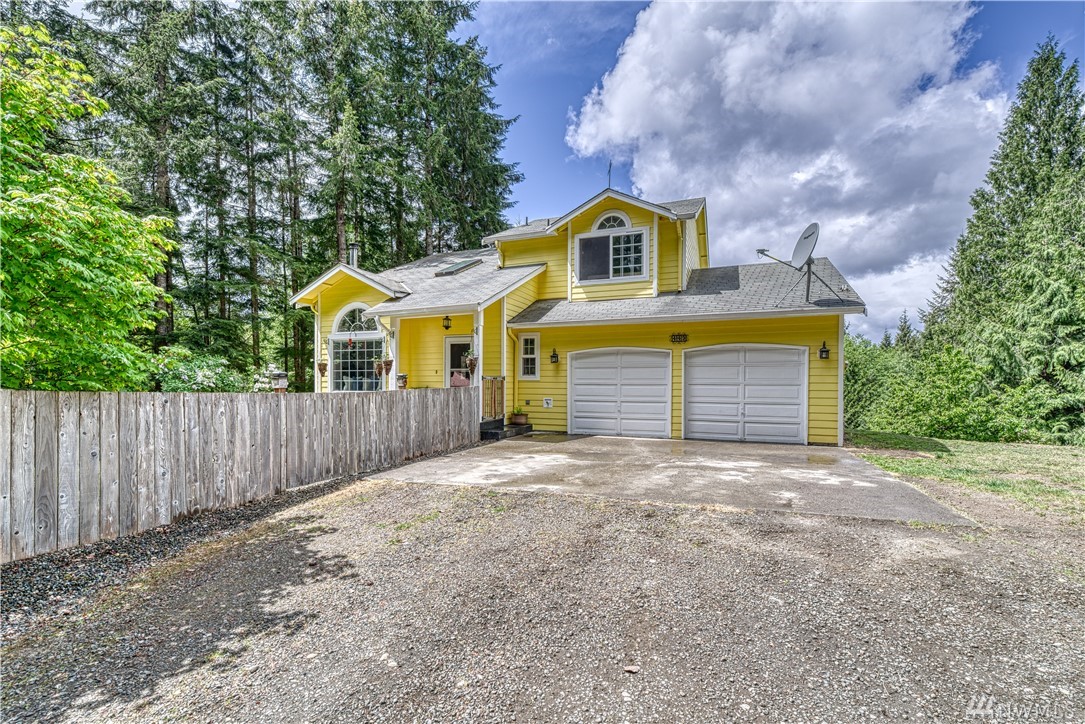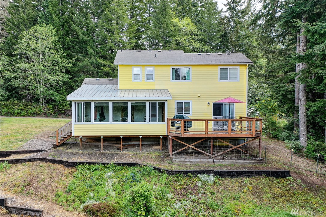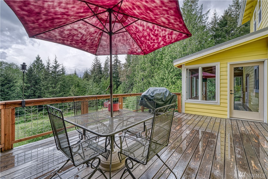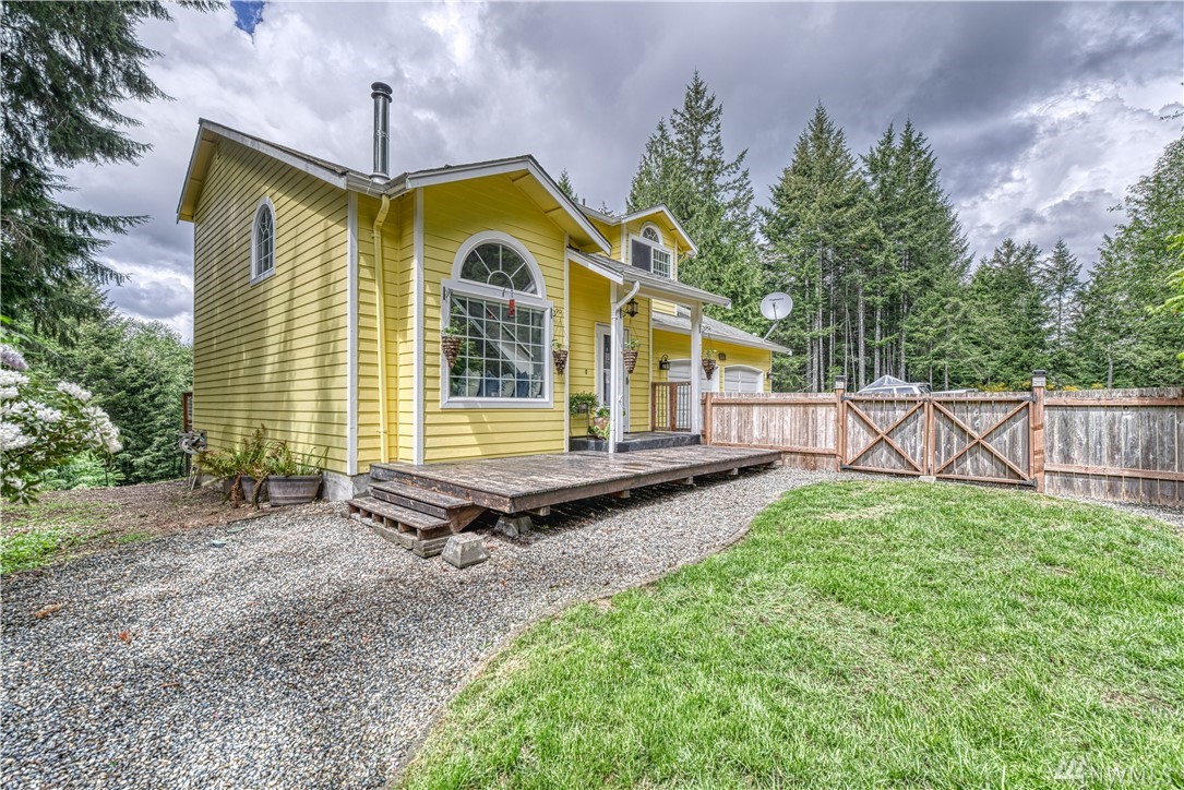Sweet Seabeck home and acreage! You'll appreciate the country setting of this gated lane and its dead end privacy. Upon entry you are greeted by tall ceilings + natural sky light. Attractive open floor plan from living to dining to kitchen: Slider out to a large entertainment deck w panoramic views of acreage, evergreens + peek-a-boos of the Olympic Mtns and a unique, enclosed sun room to enjoy the views year round! Remodeled Kitchen w quartz counters, main level hardwood floors, newer ext + int paint, carpet and updated baths + fixtures. Spacious Master and bath w W/I closet. Cozy wood stove. Huge level land area w fire pit + chicken coop. Large garage w shelving/cabinets + tons of extra parking. Front fenced area for critters or garden.