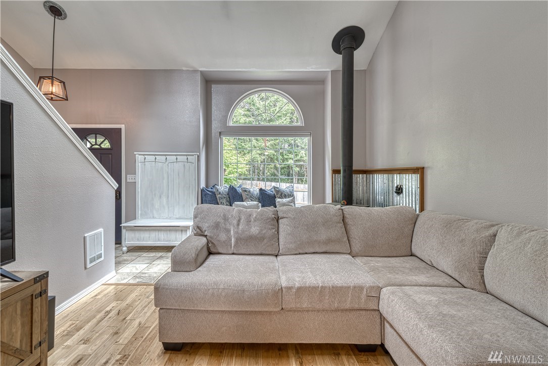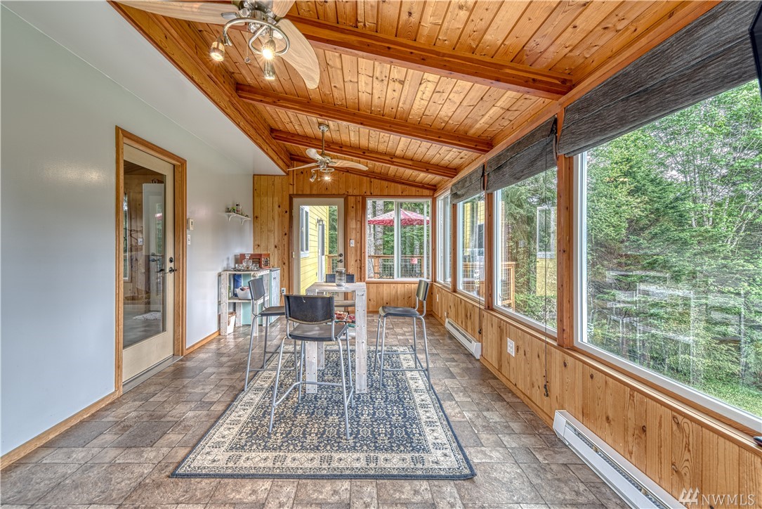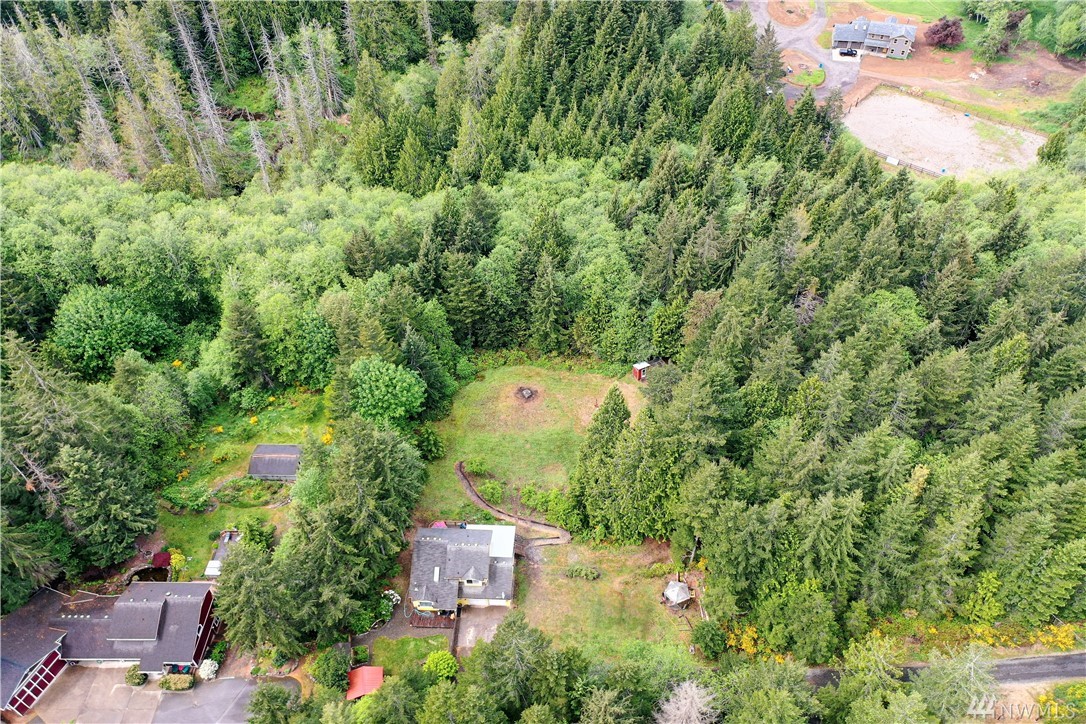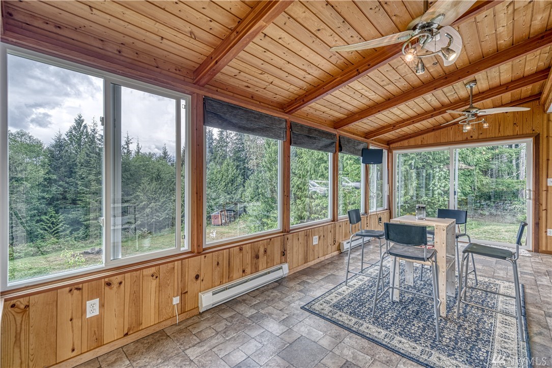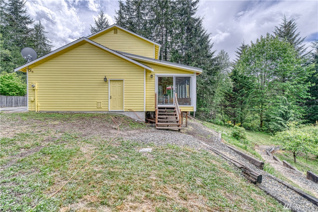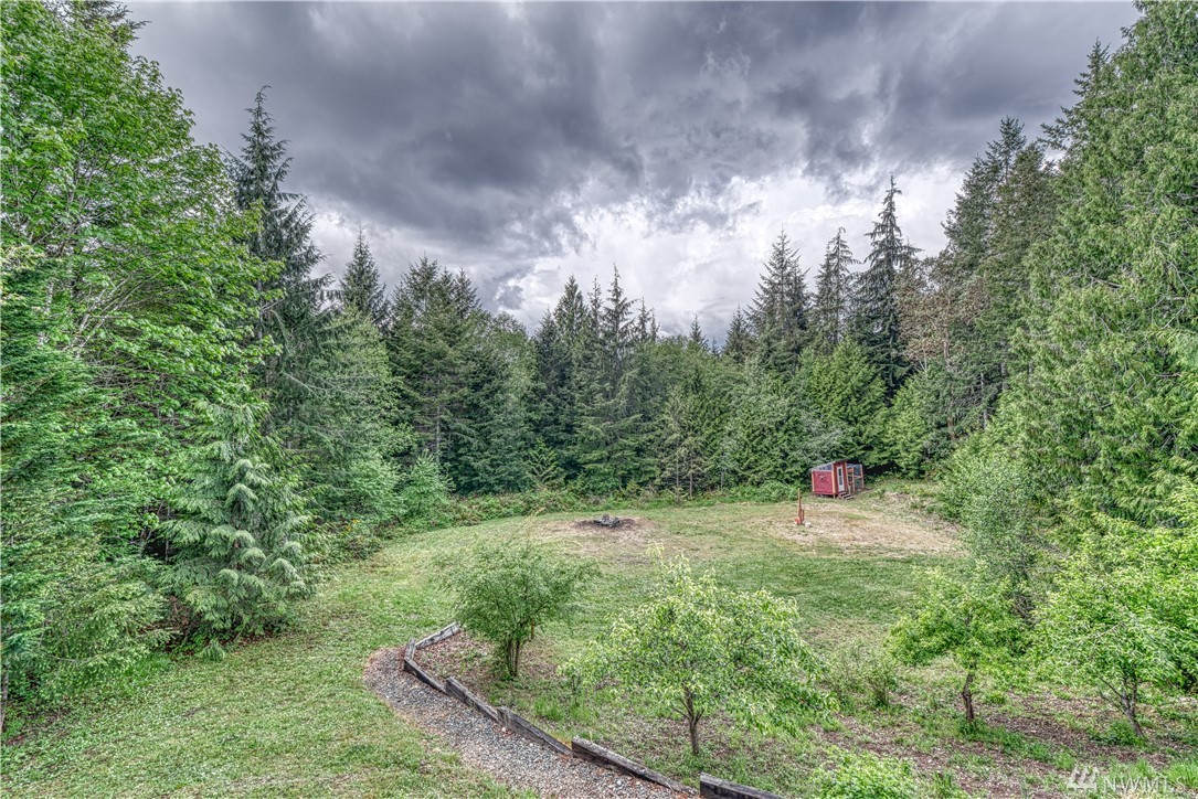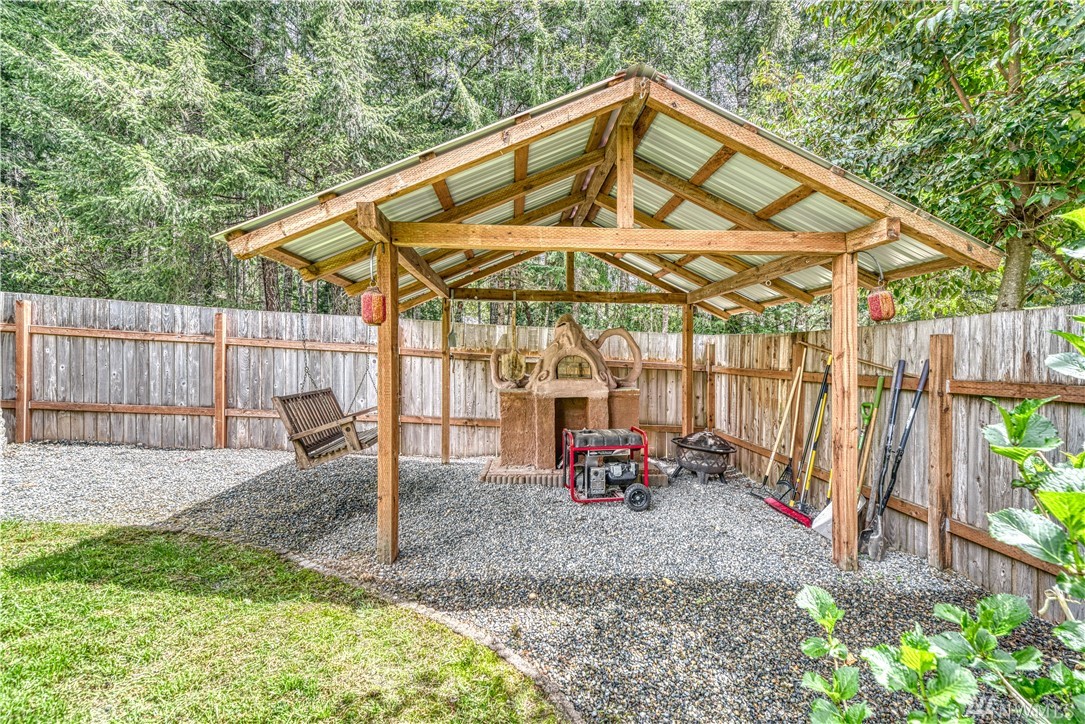 Sweet Seabeck home and acreage! You'll appreciate the country setting of this gated lane and its dead end privacy. Upon entry you are greeted by tall ceilings + natural sky light. Attractive open floor plan from living to dining to kitchen: Slider out to a large entertainment deck w panoramic views of acreage, evergreens + peek-a-boos of the Olympic Mtns and a unique, enclosed sun room to enjoy the views year round! Remodeled Kitchen w quartz counters, main level hardwood floors, newer ext + int paint, carpet and updated baths + fixtures. Spacious Master and bath w W/I closet. Cozy wood stove. Huge level land area w fire pit + chicken coop. Large garage w shelving/cabinets + tons of extra parking. Front fenced area for critters or garden.