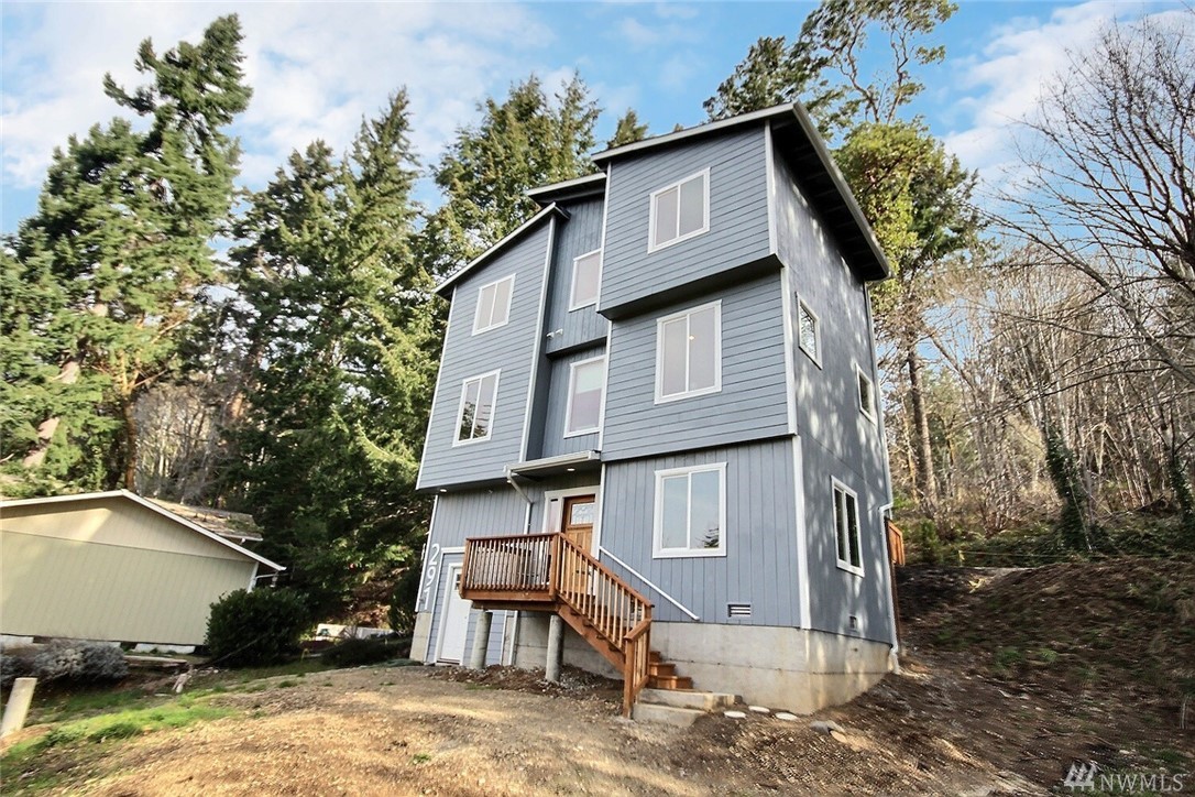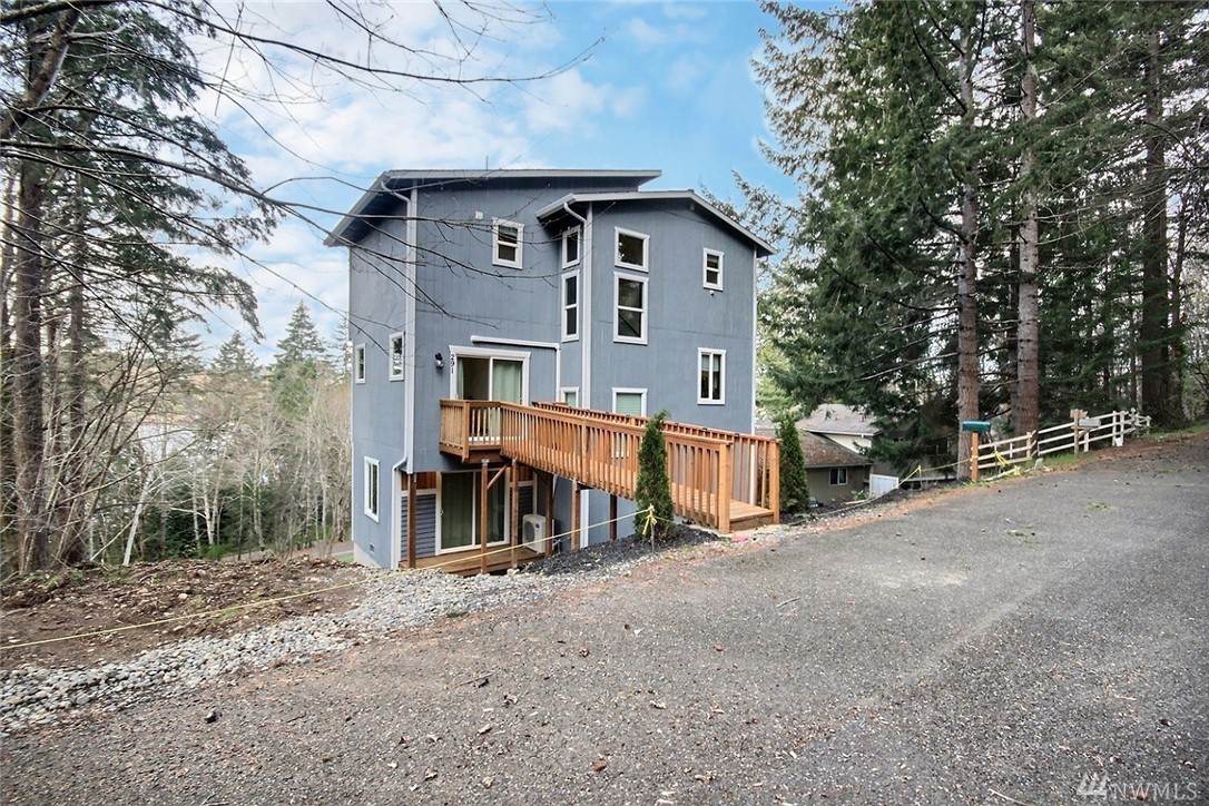 Brand new three level residence is nestled in small saltwater community and enjoys seasonal views of Hammersley Inlet. Architectural detailing, high ceilings, big windows, solid woven bamboo flooring, rich wood finishes, fashionable fixtures, heat pump, ceiling fans, create inviting spaces infused with light. Fresh island kitchen offers casual eating bar, opens to dining area; applcs stay. Two primary suites on upper level each with own stylish full bath; half bath on main. Fully-finished walk-out lower level has third bdrm. Decking overlooks natural green, woodsy, aprx .24 acre setting. Can walk to community amenities which incl clubhouse, pool, parks, covered BBQ, picnic area, county boat launch & saltwater beach access.
