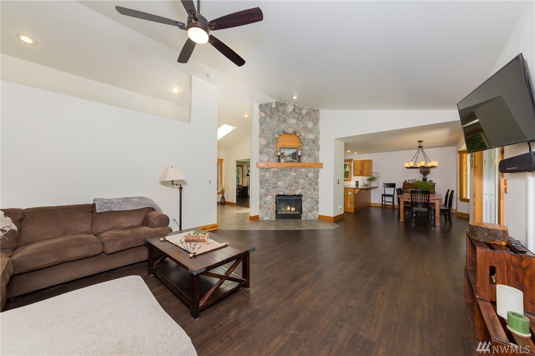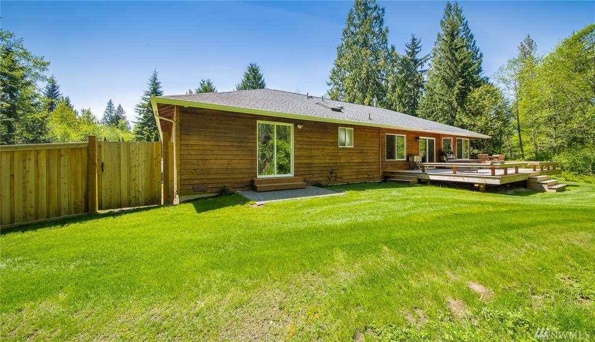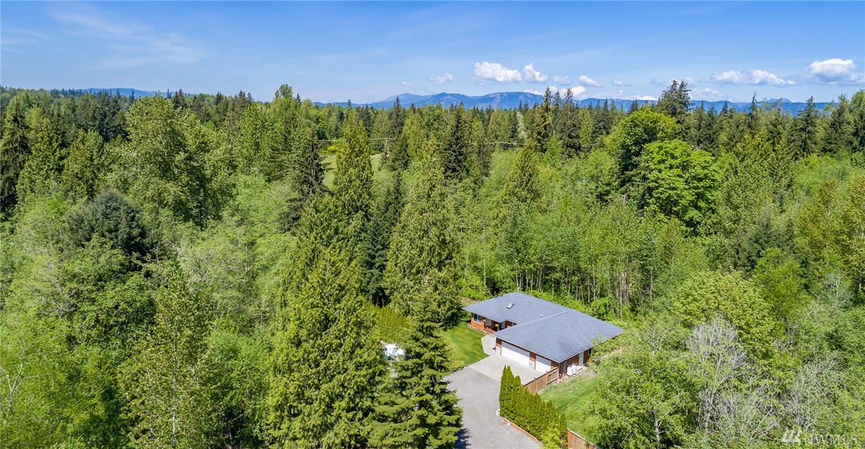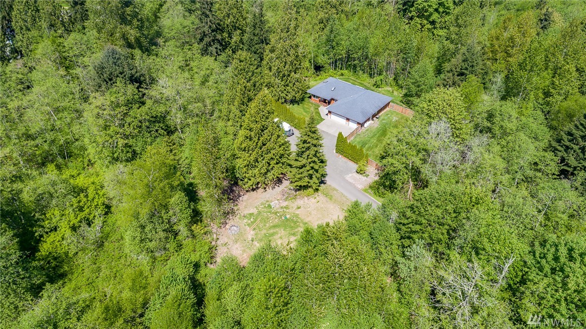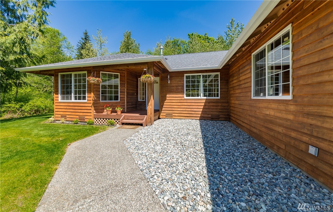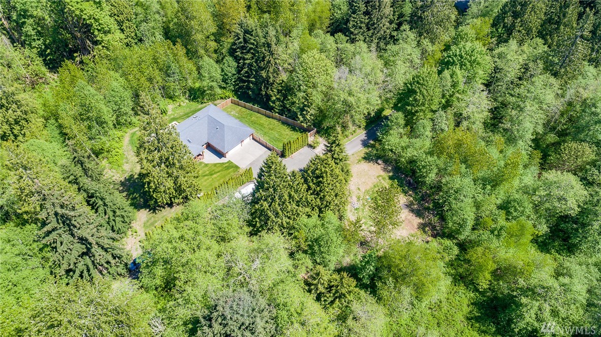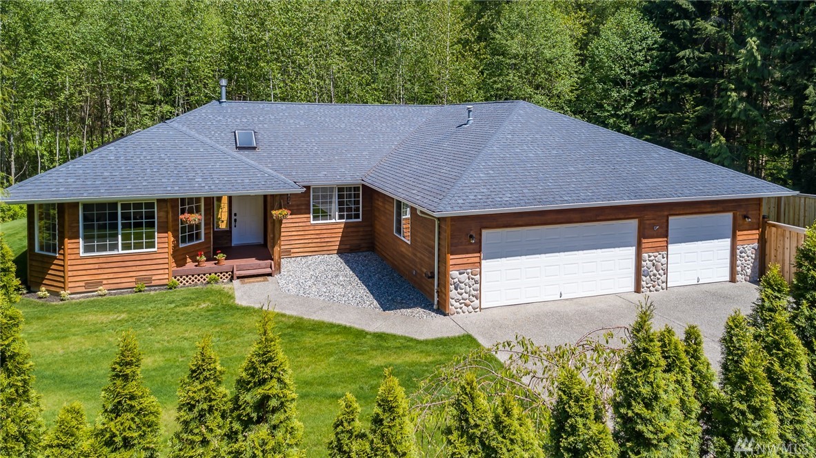BEAUTIFUL hard to find RAMBLER located on a private paved road and greenbelt just shy of 5 ac. Covered porch entry opens into an Open floor plan living area which features a breath taking river rock fireplace, full wall of windows looking into the private backyard w/ large entertaining deck. Left of entry is Separate Dining room or Office, three bedrooms and two full baths. Master features two walk in closets, a HUGE 5 piece bath & slider to back yard. Also features a 3 car garage, separate fully fenced area for a veggie garden, play area, dog run, etc.