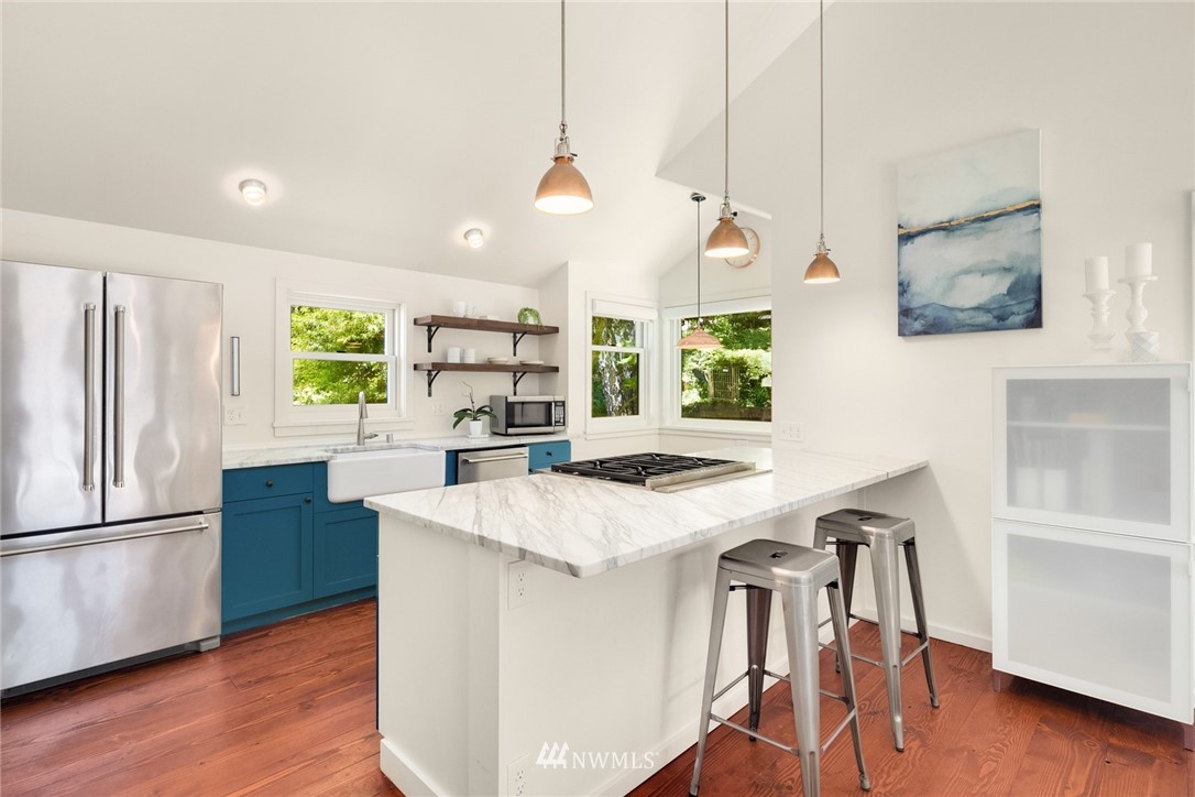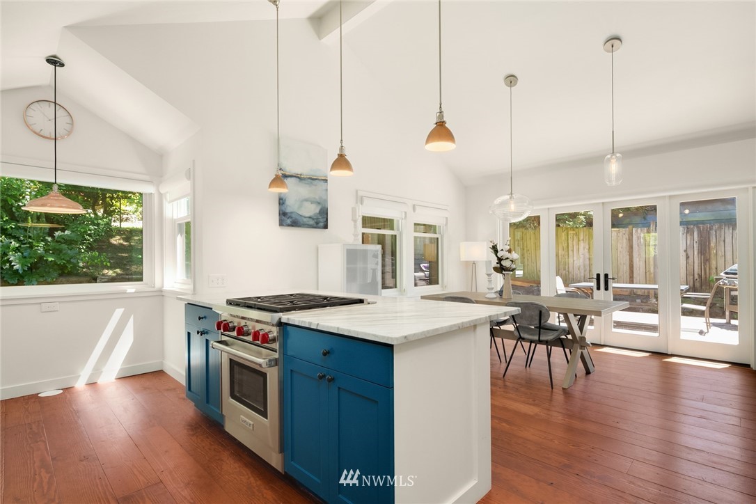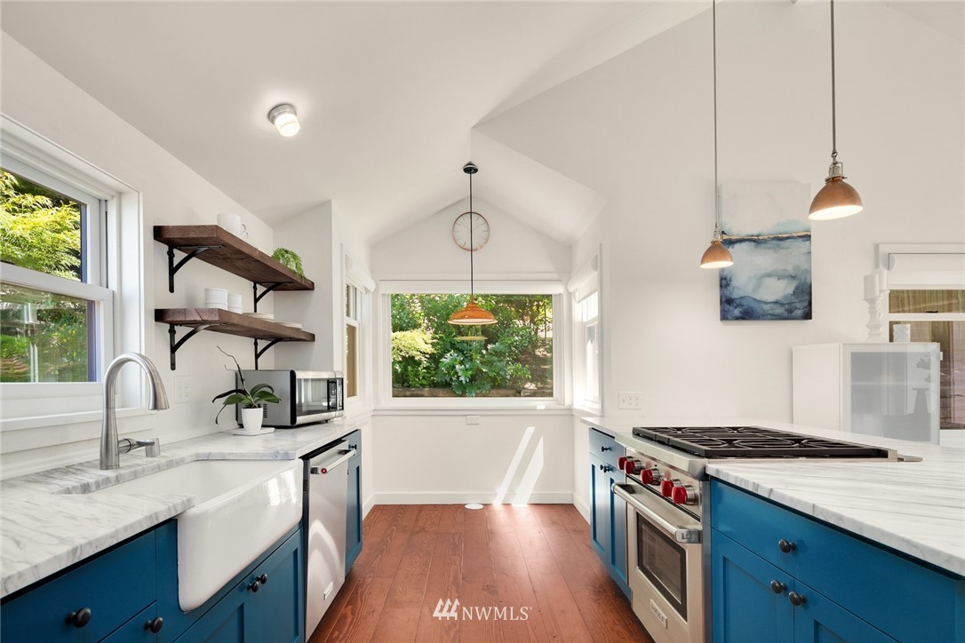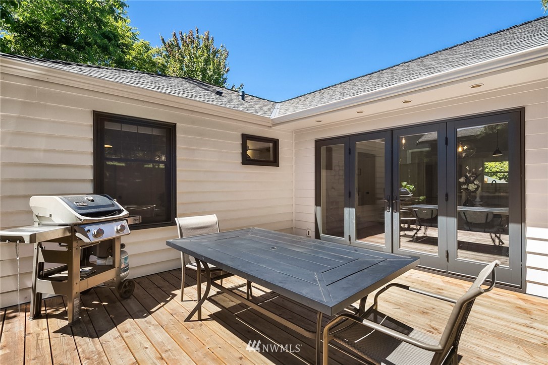 Great Ravenna Remodel bungalow on a quiet street in a great neighborhood. 3 bedrooms on the main floor, including master suite & wide plank fir floors from a WWII Armory. Bright kitchen features Carrara marble counters, farmhouse sink with new Grohe faucet, new Wolf range, eating nook, and pantry. The kitchen and dining room open to a large entertainment deck and private fenced backyard. Finished basement with tall ceilings and 4th bedroom, Rec Room, laundry, & storage. A/C & recently Updated Systems. New window treatments on all windows. Widened driveway to accommodate most vehicles. Incredible location that's close to U Village, amazing parks, and great schools.