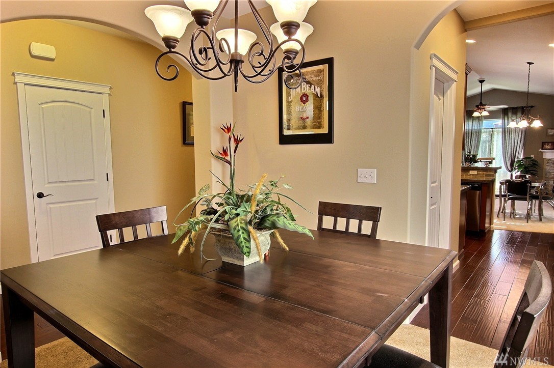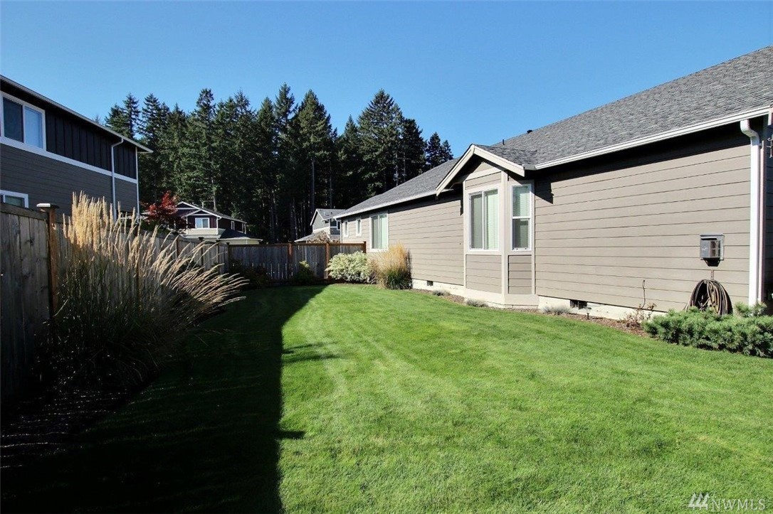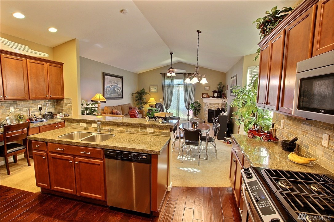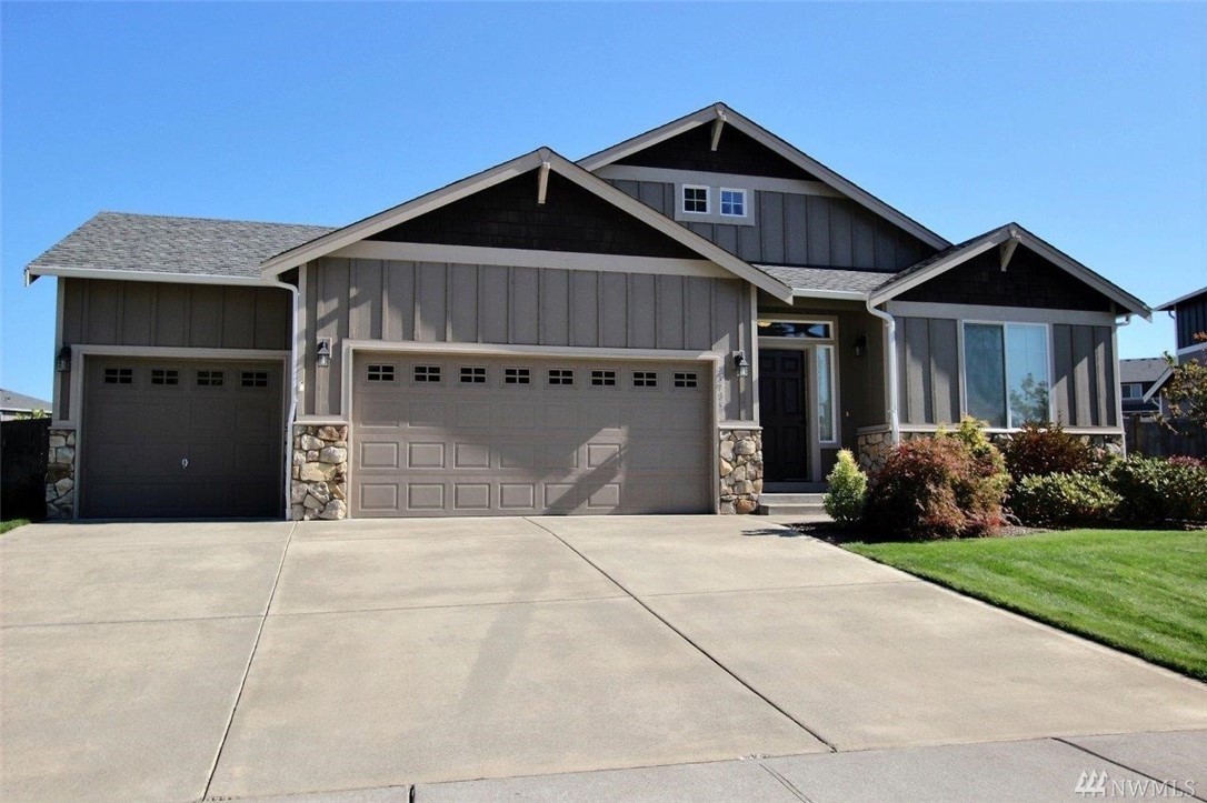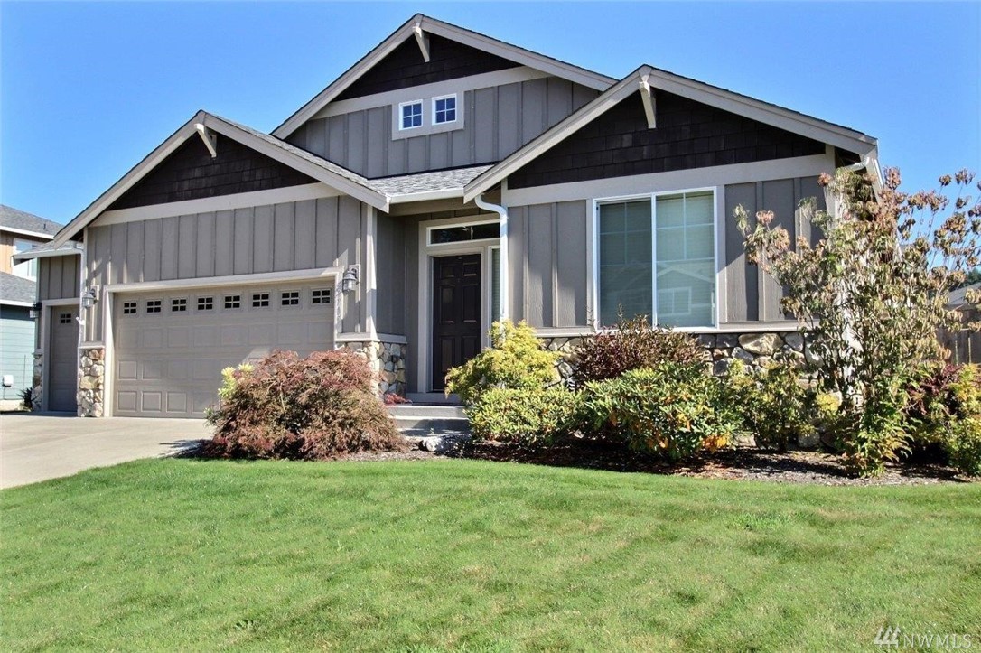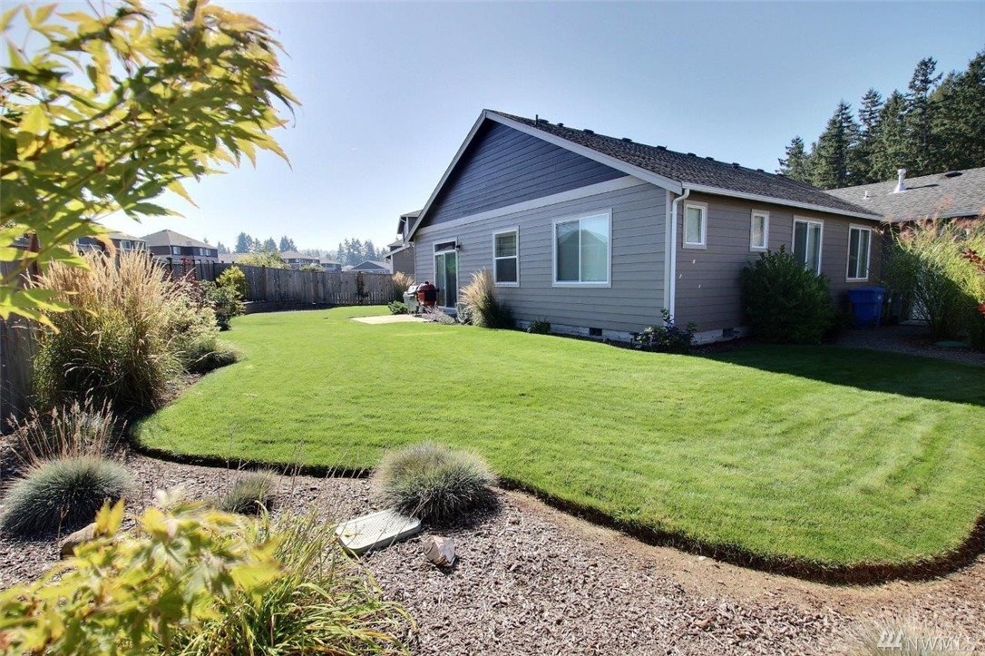 Gated community of Grand Firs enjoys mtn views, miles of sidewalks and trails. Stylish rambler features great rm concept living, hrdwds, vaulted ceilings, French drs, gas frplc, den, tile finishes and more. Polished kitchen offers granite, handsome cbntry, breakfast bar, pantry, applcs stay. Three bdrms include master with 5-pc bath, garden tub; full guest bath. True three car garage, patio, manicured fenced yard. Ideally located close to community park, schools, amenities, 20 minutes to JBLM.