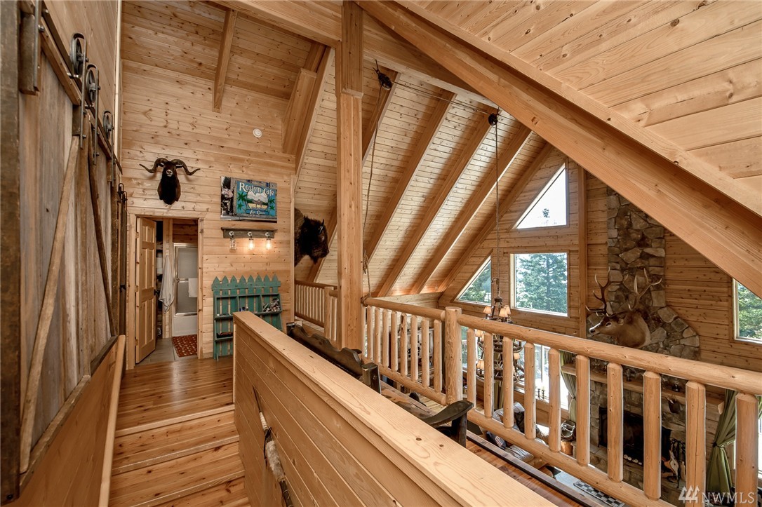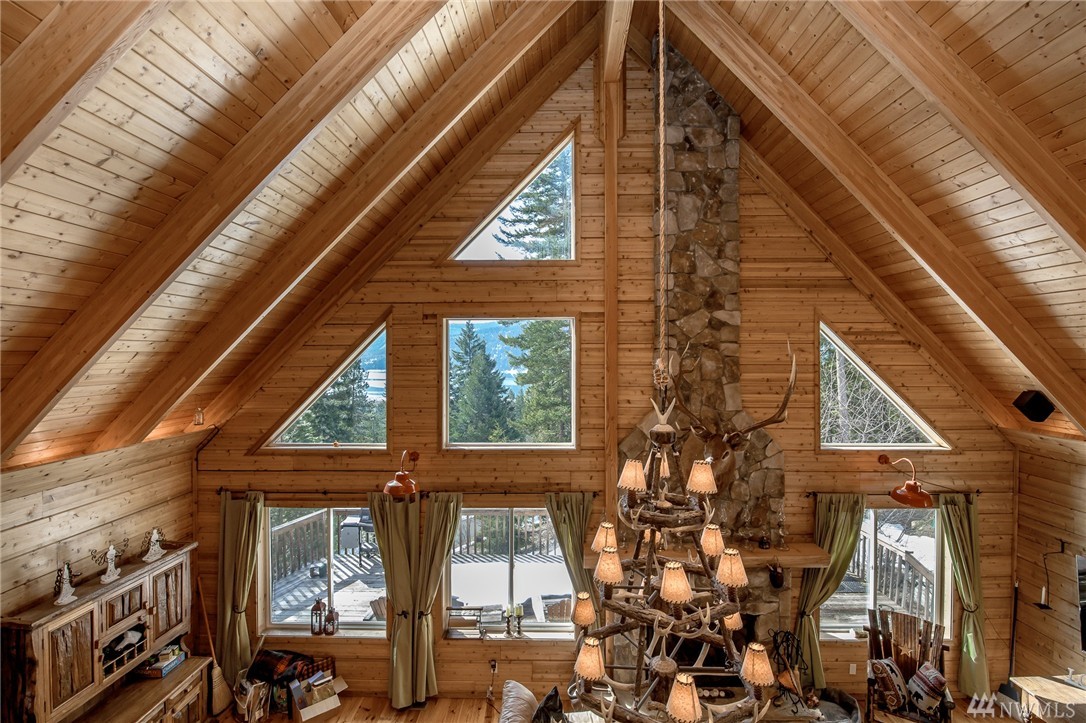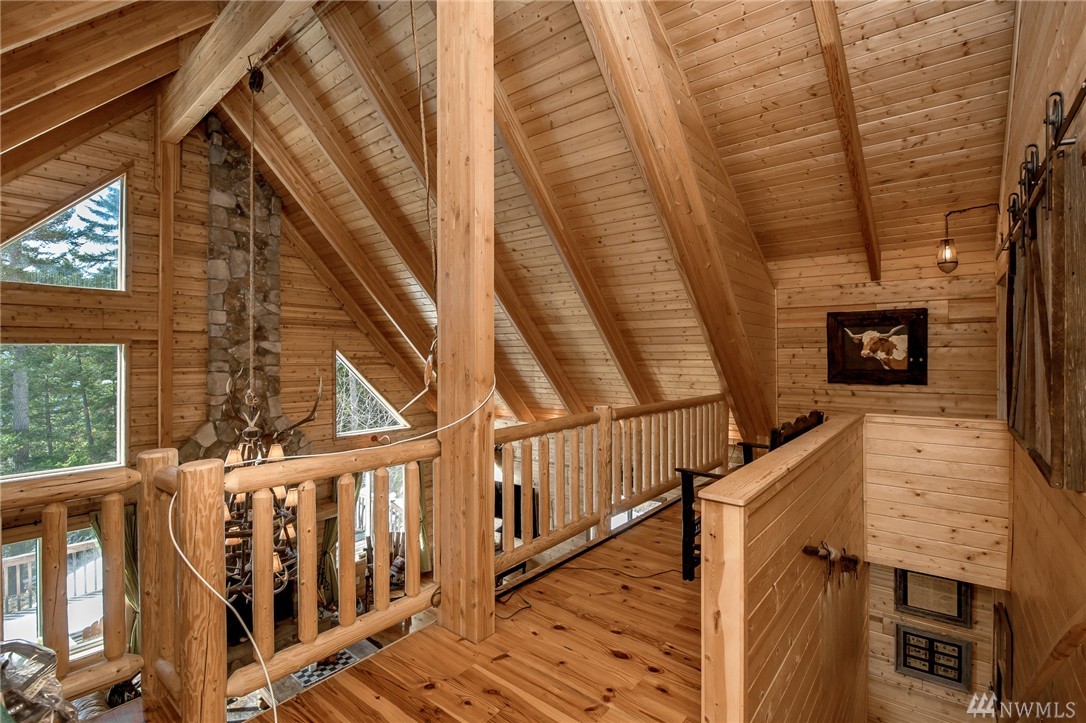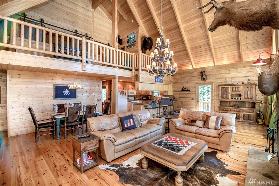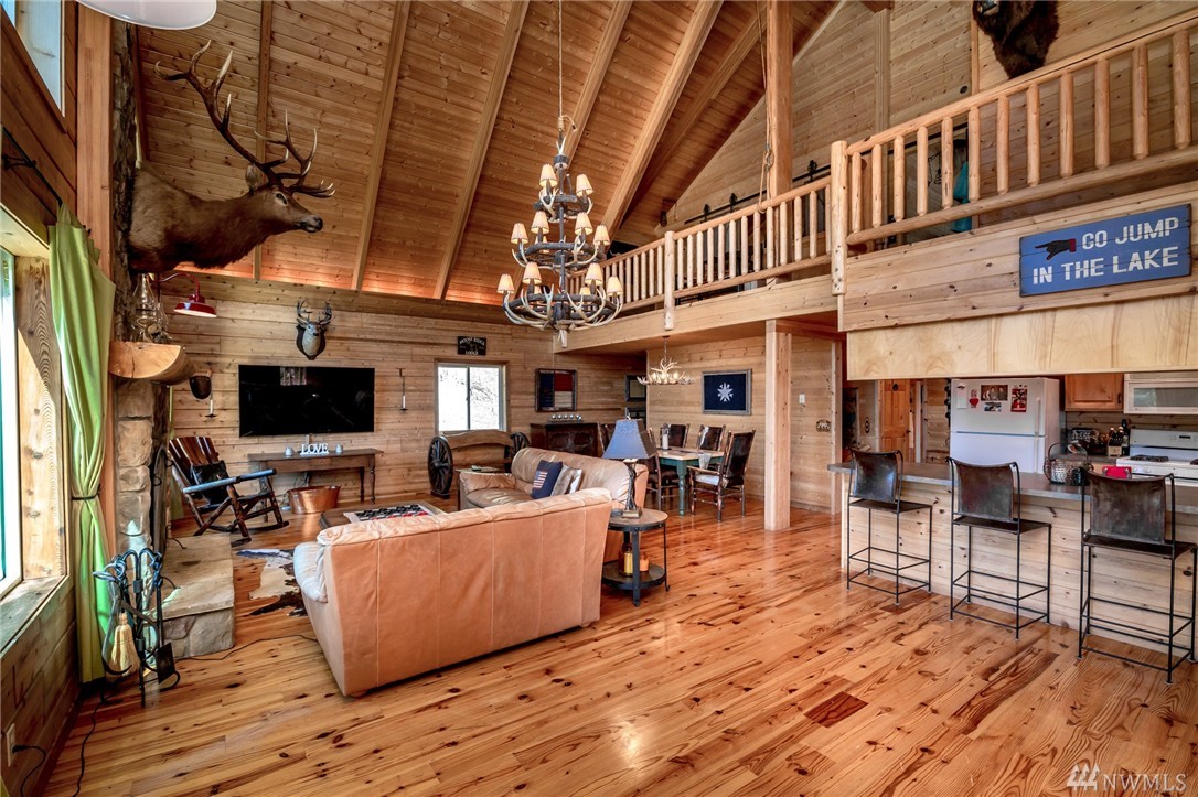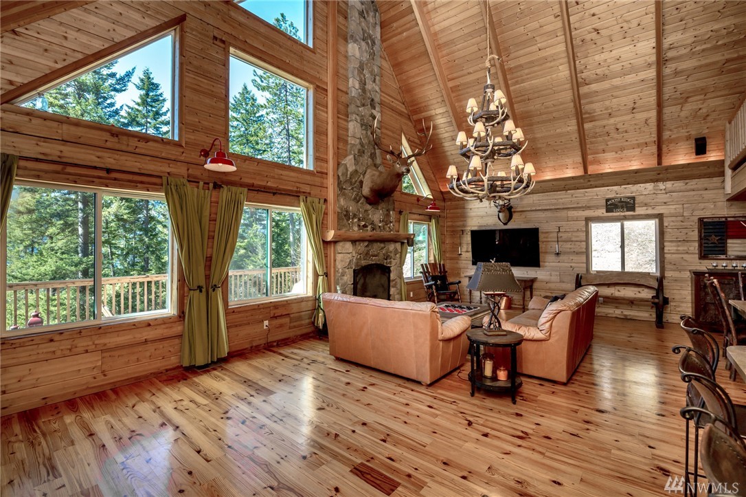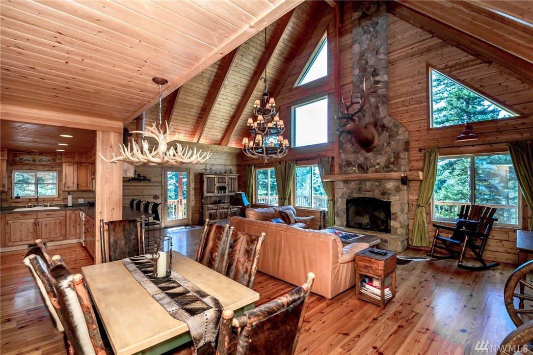 Gorgeous Northwest Lodge retreat w/sweeping lake & mountain views. Nestled among tall evergreens, this retreat offers floor to ceiling stone fireplace, open beams, log railings, antler chandeliers, reclaimed pre civil-war Southern Heartwood Pine floors,antique Texas barnwood sliding doors & shutters. 4bdrms (3 bdrm septic) plus a Game Room w/custom wood & copper bar & attached 2 car garage,enjoy BBQ's on the deck, trail access from your door & starry nights around the fire-pit.