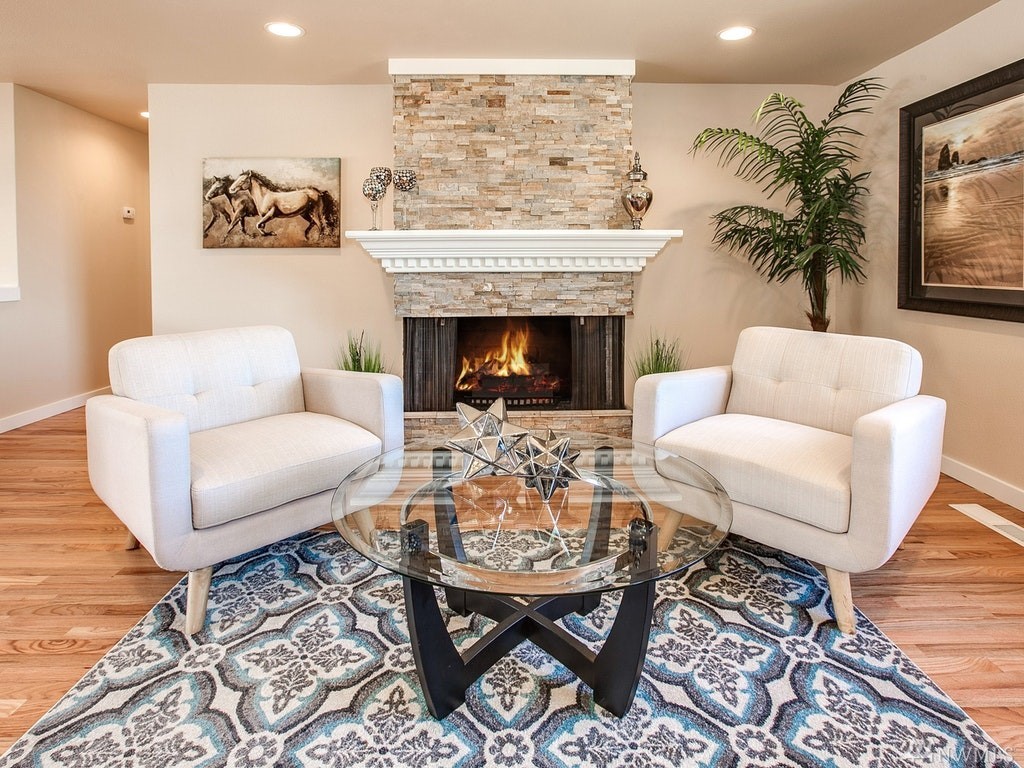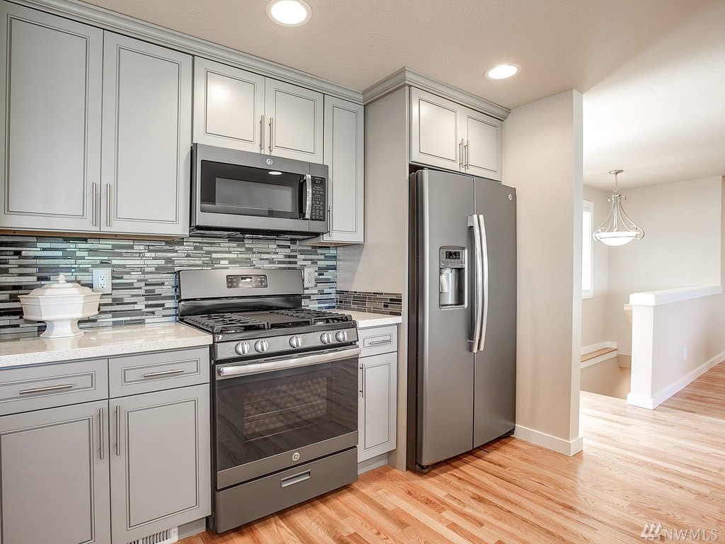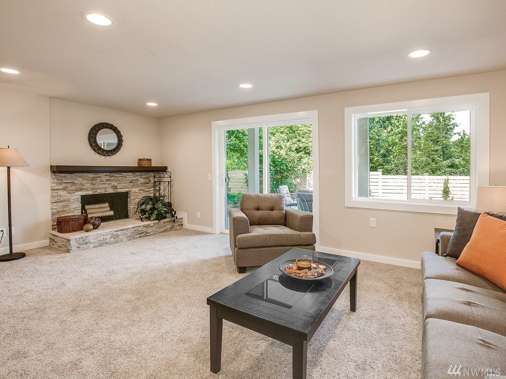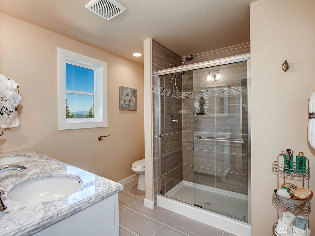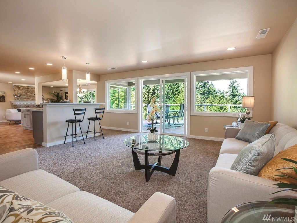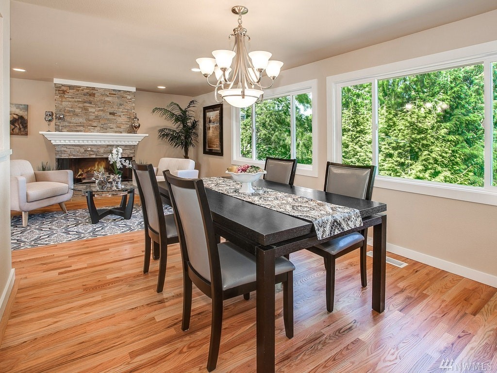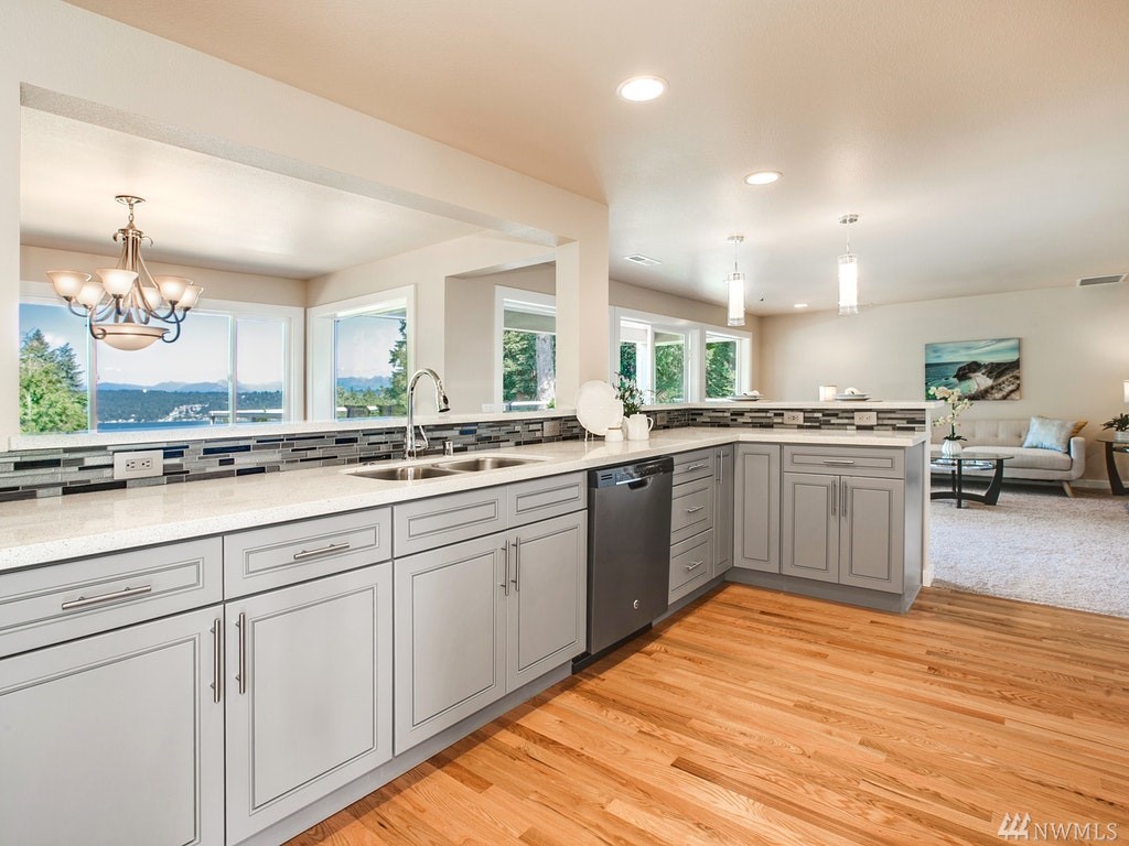 Gorgeous Lake Sammamish & Cascades views!Completely remodeled from top to bottom 5 bed home in Lake Hills! Home offers desired open floor plan, new roof, large deck overlooking greenbelt, lake & mountains, beautiful hardwoods, designer kitchen, gorgeous tile, 2 stack-stone fireplaces, all new lighting, master suite w/walk-in closet & private deck, wetbar, all new appliances including washer/dryer on both floors, walk-out basement! 2 many upgrades 2 list, REALLY A MUST SEE! Close to everything!