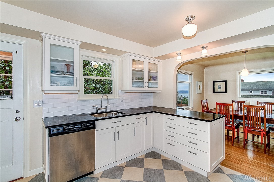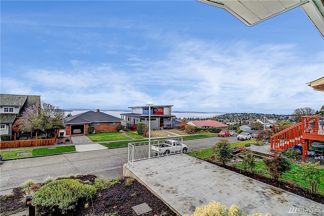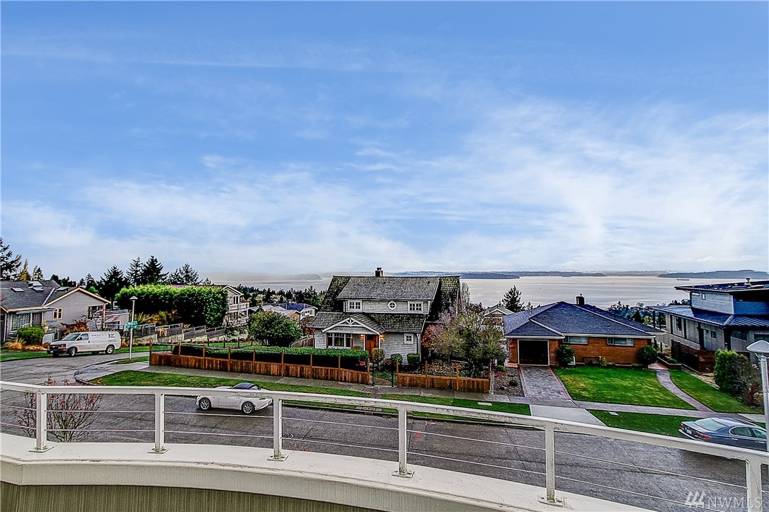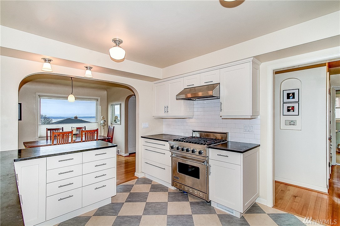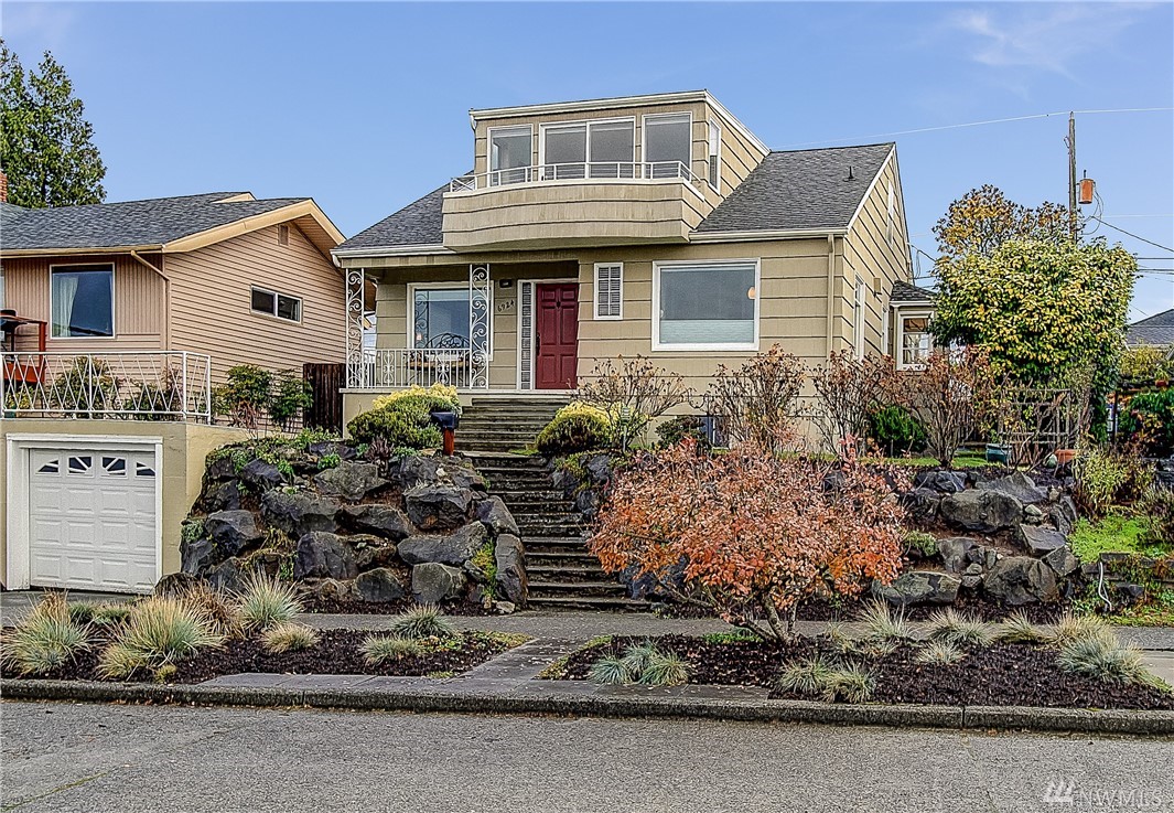 Majestic sunsets from the top of Gatewood Hill with Sound & Mountain views. Coved ceilings & hardwood floors grace the living & dining rooms. Inviting updated kitchen with quality stainless appliances and Viking Stove. Remodeled with white subway tiles, charcoal colored counters & marmoleum flooring. Upstairs master suite with a private bath & deck for enjoying the NW views. The full unfinished basement is ready for your vision. Mature landscaping beautifies the fenced in backyard.