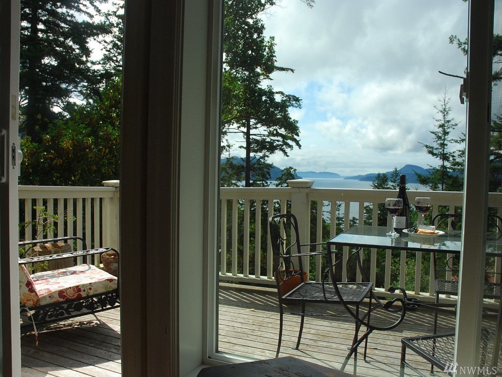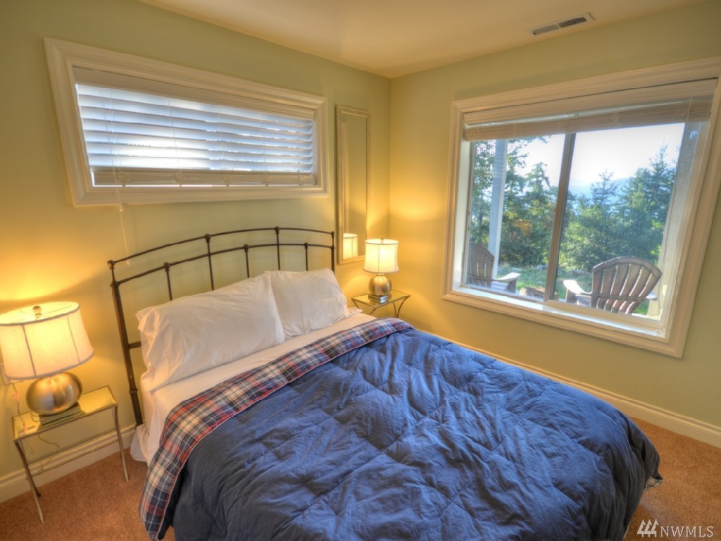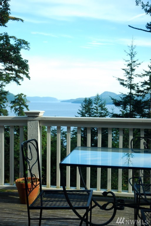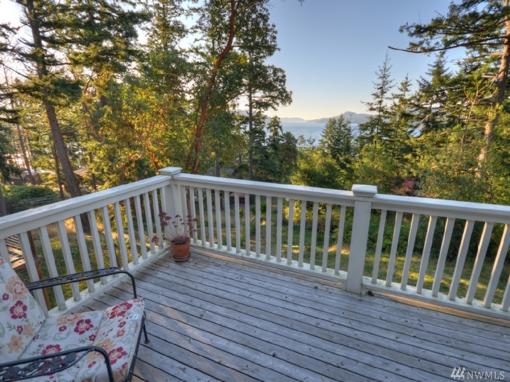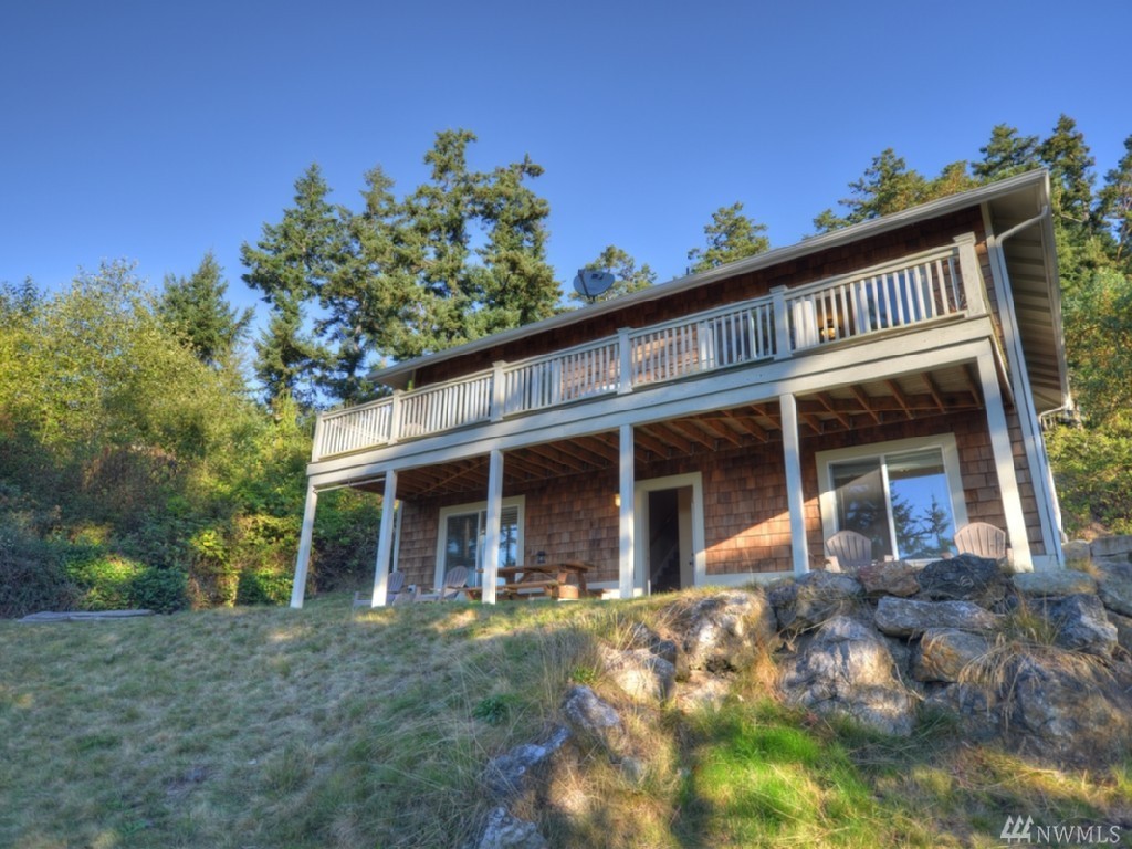 Southern water & mountain views from 3 bedrm/2 bath home w/ established income from transient rental. Main floor view master, utility, kitchen, great room on upper level with 2 bdrms/full bath on the lower level. Garden/play space on sunny lawn. Large cedar deck spans width of the house for entertaining/bbq. Kitchen features stainless appliances, lots of granite top counter space; warm brown mahogany floors, heated marble floor in master. Popular rental with approx. $62k gross in 2016.