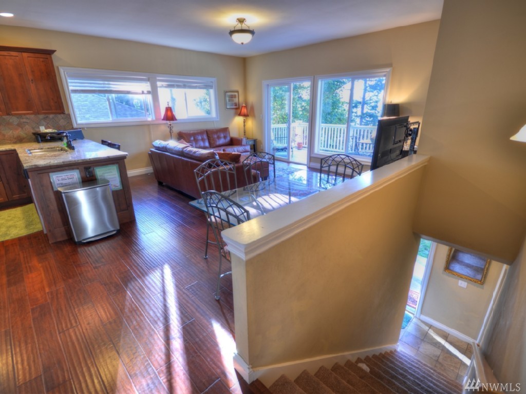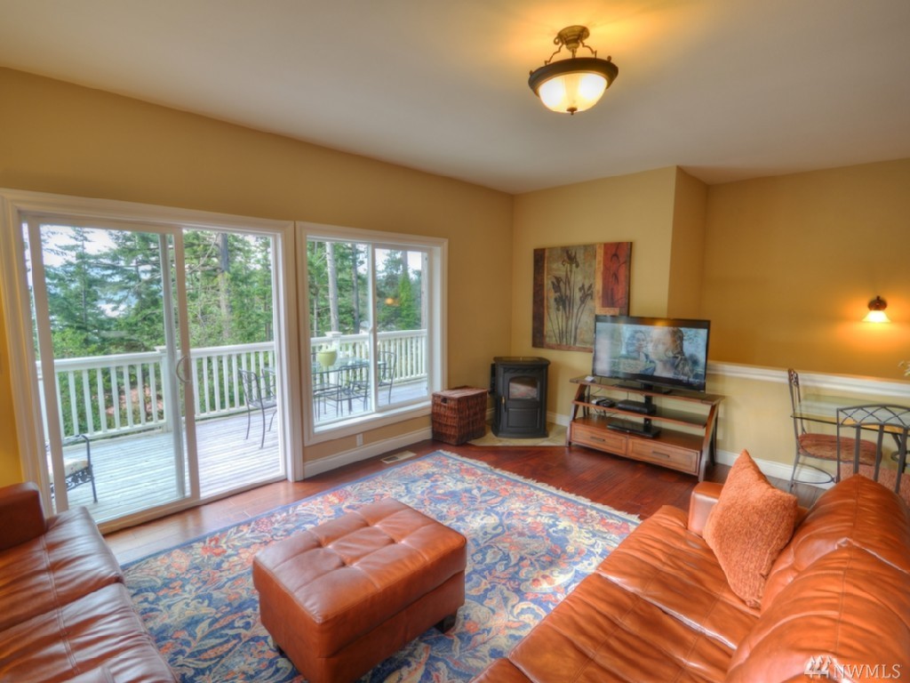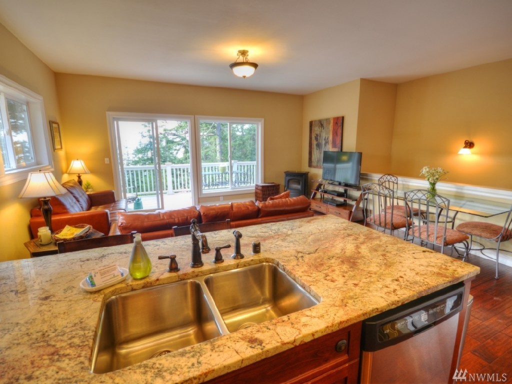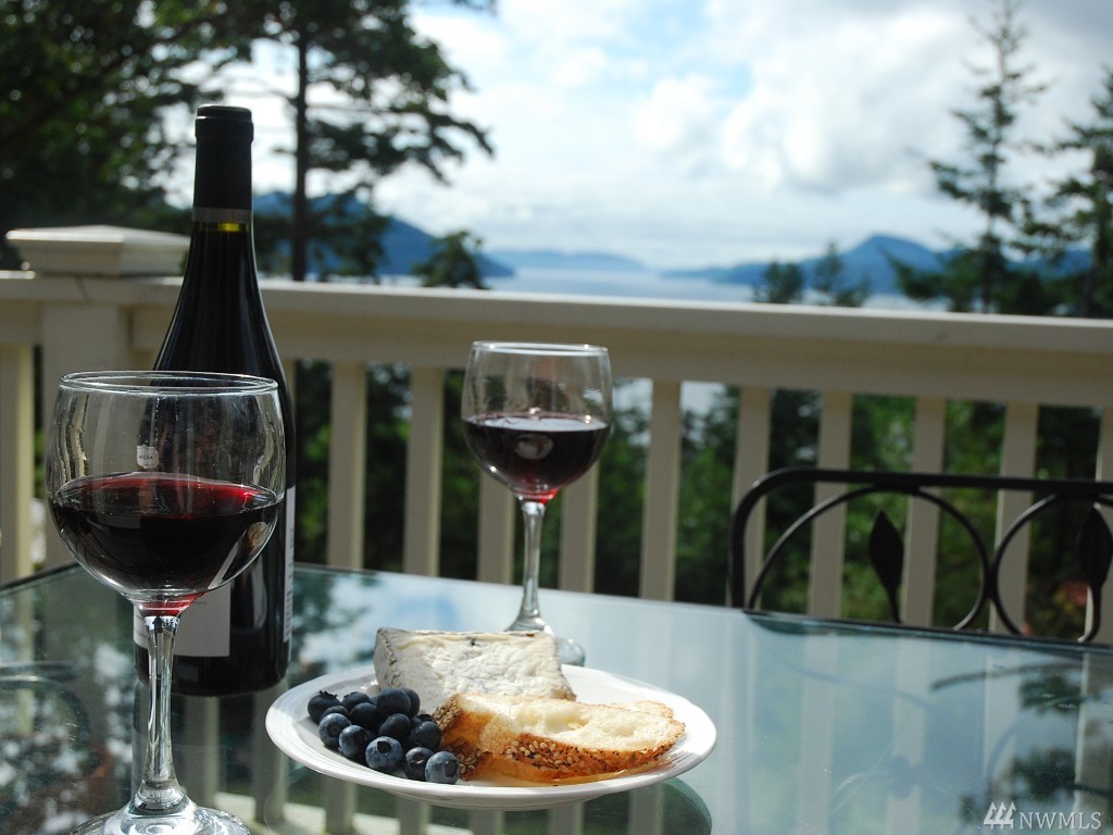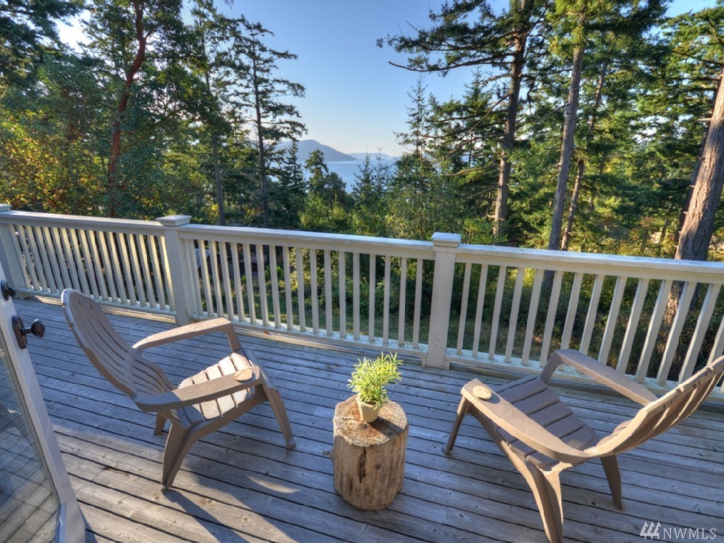 Southern water & mountain views from 3 bedrm/2 bath home w/ established income from transient rental. Main floor view master, utility, kitchen, great room on upper level with 2 bdrms/full bath on the lower level. Garden/play space on sunny lawn. Large cedar deck spans width of the house for entertaining/bbq. Kitchen features stainless appliances, lots of granite top counter space; warm brown mahogany floors, heated marble floor in master. Popular rental with approx. $62k gross in 2016.