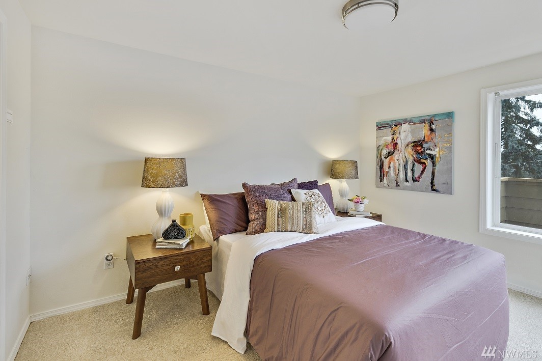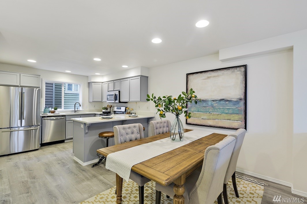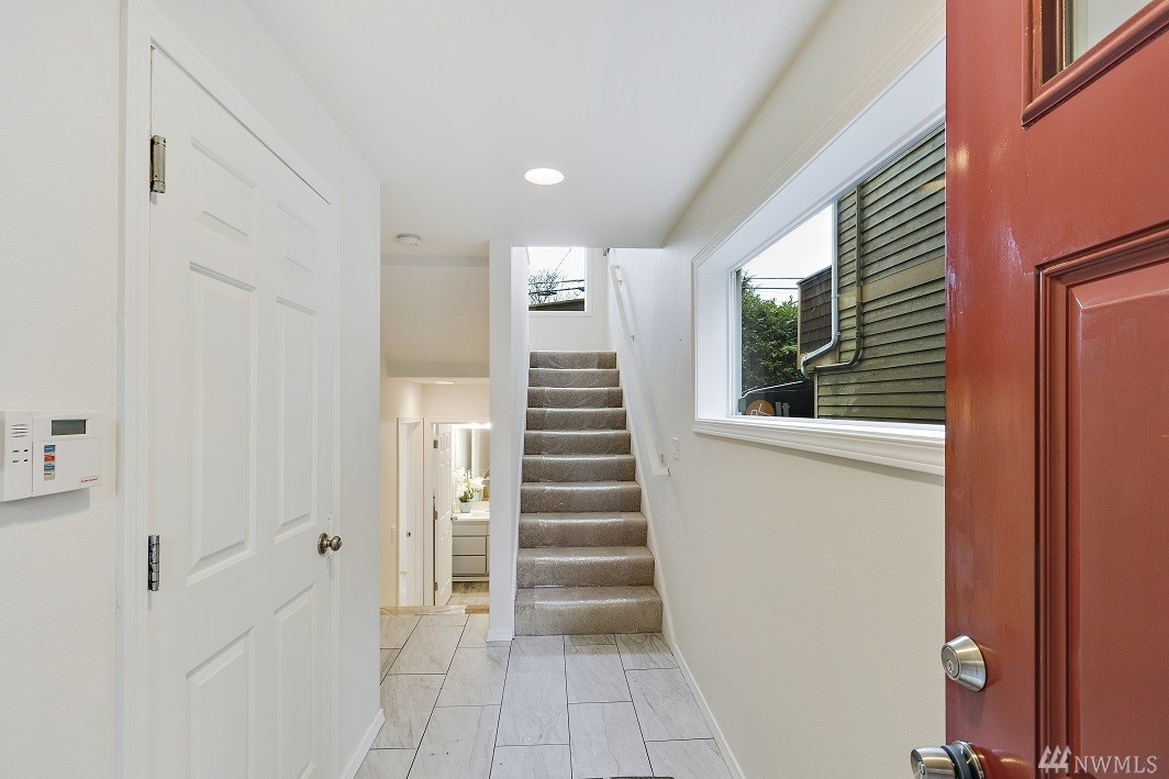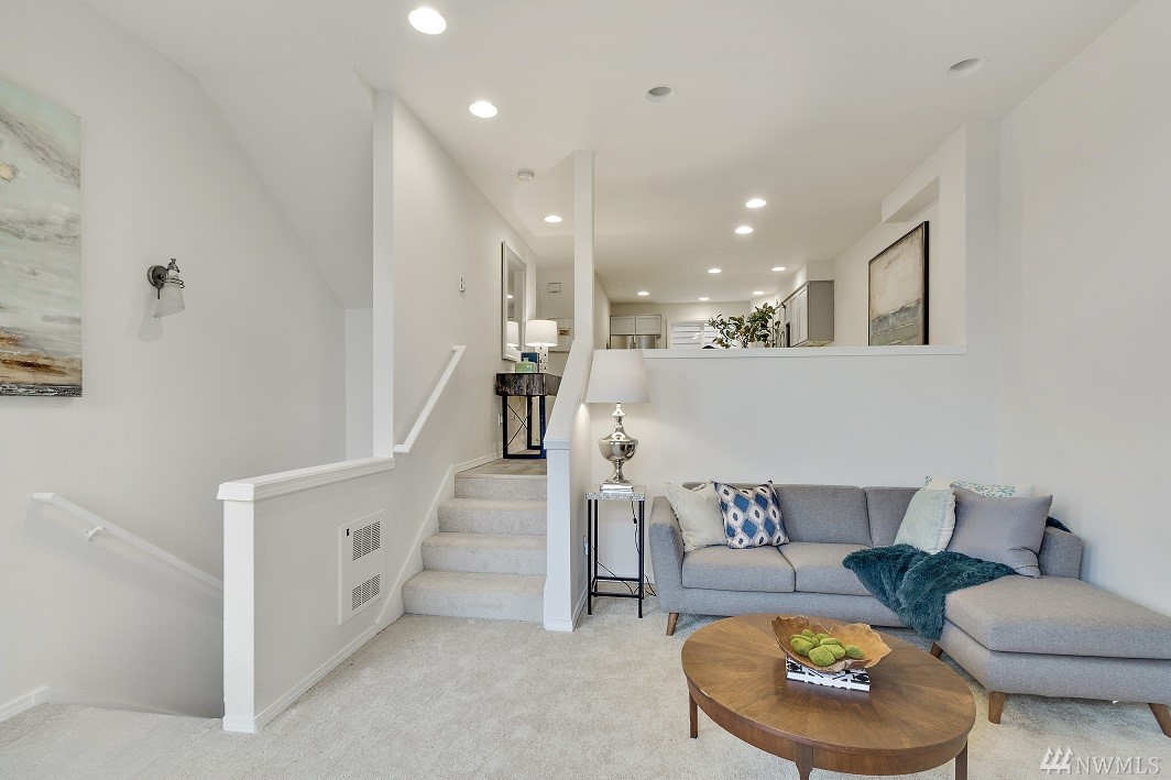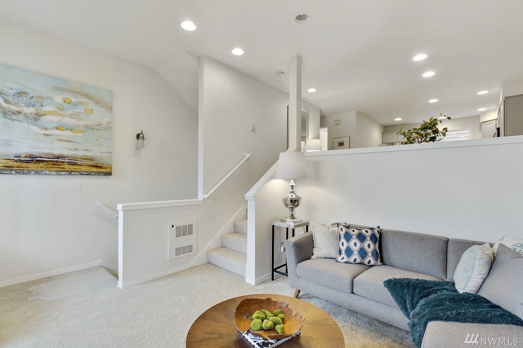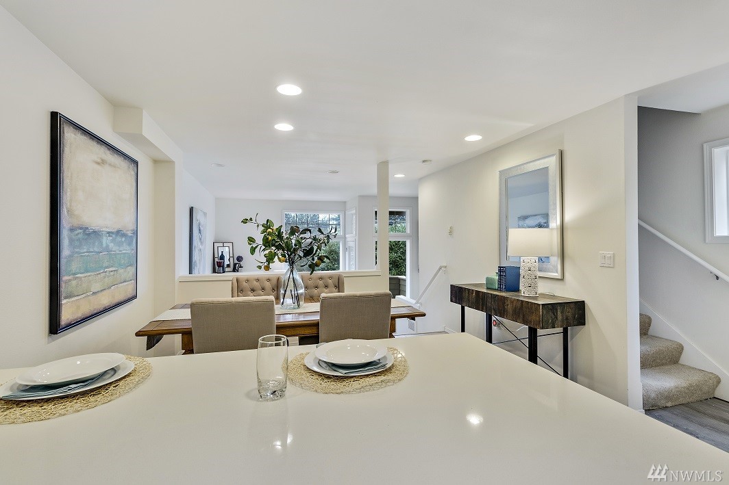 Modernized 3 bedroom / 2.5 bathroom Greenwood townhome. Come home to fresh paint and brand new flooring throughout. Modern kitchen with new white quartz counters, grey cabinets, and new SS appliances. Ensuite on the ground floor - perfect for roommates or Airbnb. 2 bedrooms with jack-and-jill bath on the top floor. Master bedroom and deck overlook peek-a-boo Puget Sound and Olympic Mountain views. Quartz in all the bathrooms. 1 car garage with storage. Best of all, NO HOA dues. Better than new!