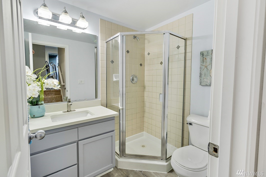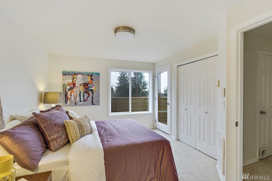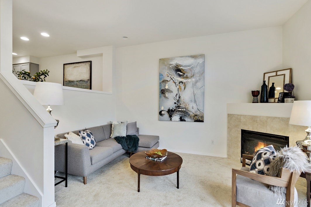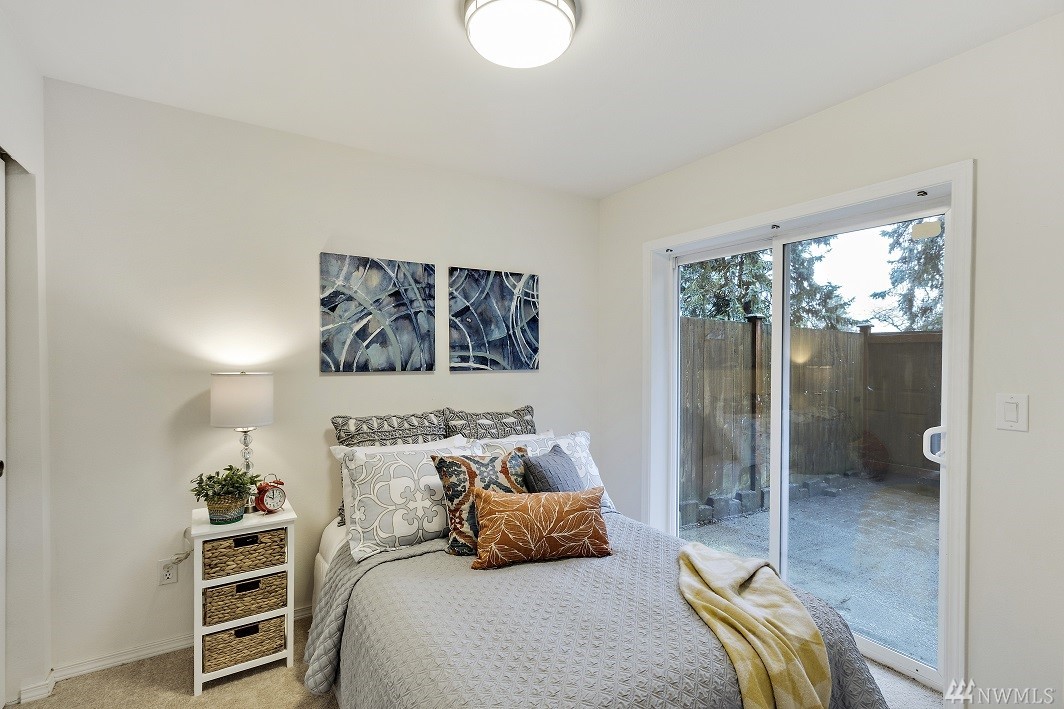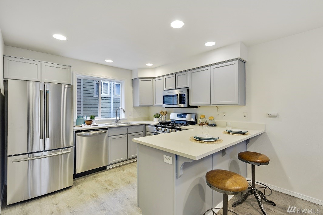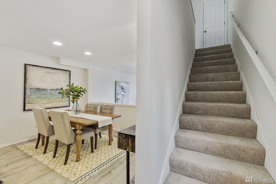 Modernized 3 bedroom / 2.5 bathroom Greenwood townhome. Come home to fresh paint and brand new flooring throughout. Modern kitchen with new white quartz counters, grey cabinets, and new SS appliances. Ensuite on the ground floor - perfect for roommates or Airbnb. 2 bedrooms with jack-and-jill bath on the top floor. Master bedroom and deck overlook peek-a-boo Puget Sound and Olympic Mountain views. Quartz in all the bathrooms. 1 car garage with storage. Best of all, NO HOA dues. Better than new!