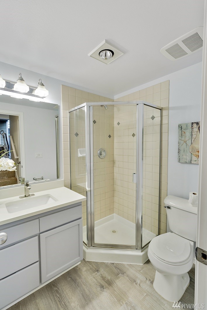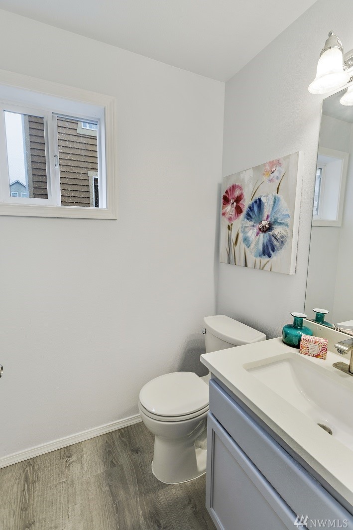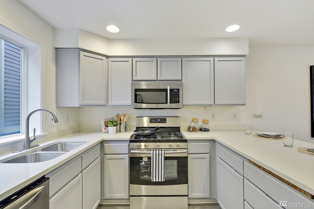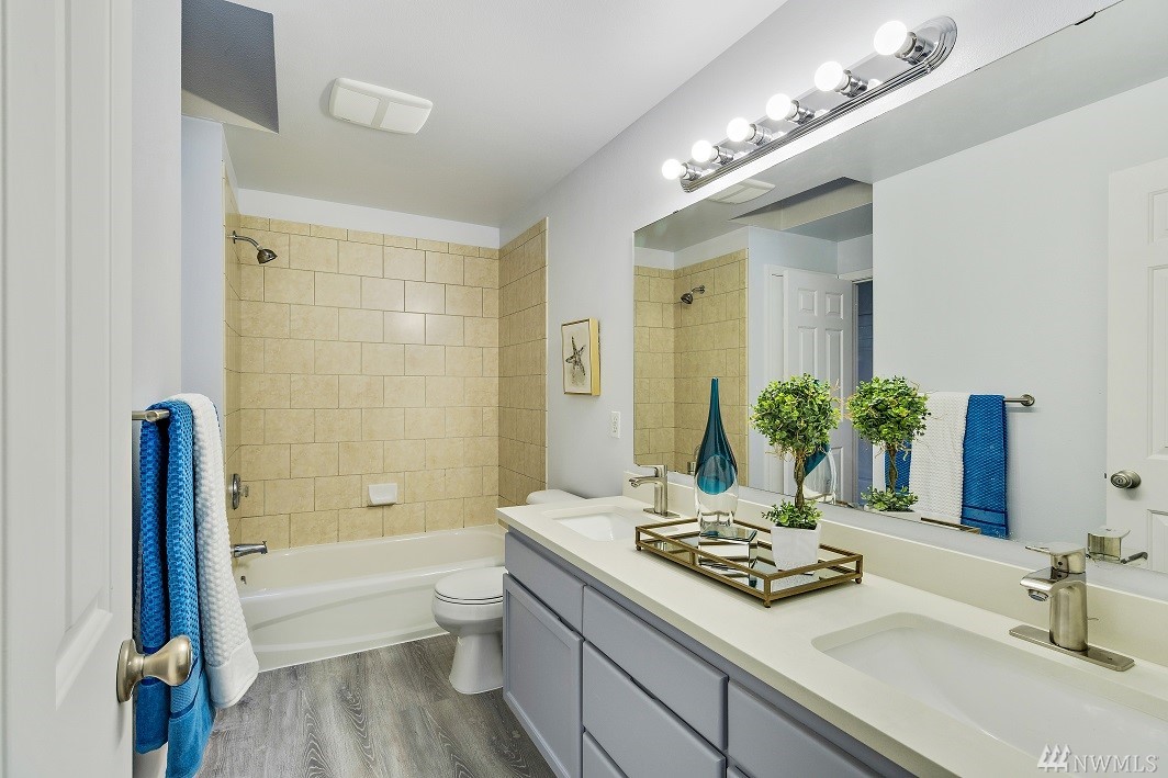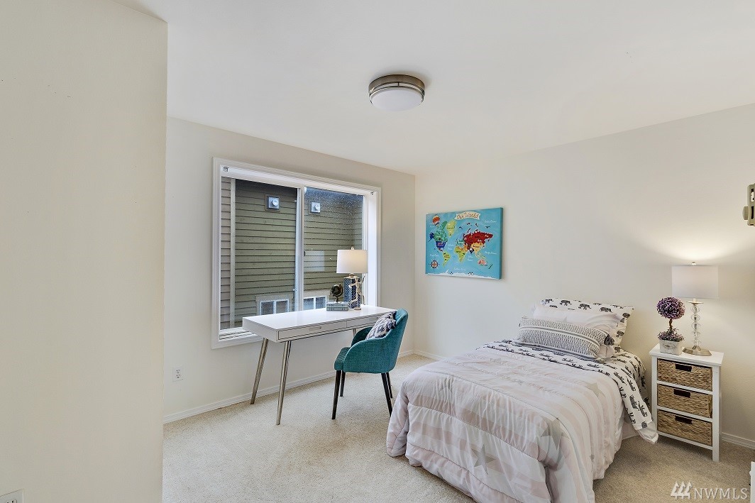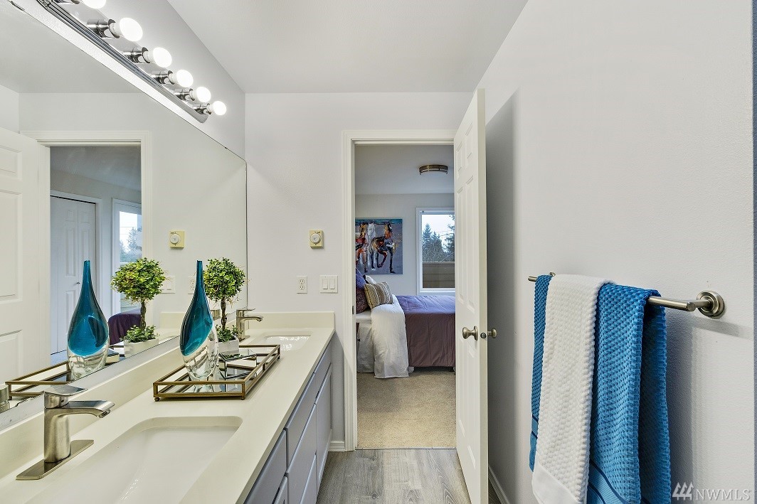 Modernized 3 bedroom / 2.5 bathroom Greenwood townhome. Come home to fresh paint and brand new flooring throughout. Modern kitchen with new white quartz counters, grey cabinets, and new SS appliances. Ensuite on the ground floor - perfect for roommates or Airbnb. 2 bedrooms with jack-and-jill bath on the top floor. Master bedroom and deck overlook peek-a-boo Puget Sound and Olympic Mountain views. Quartz in all the bathrooms. 1 car garage with storage. Best of all, NO HOA dues. Better than new!