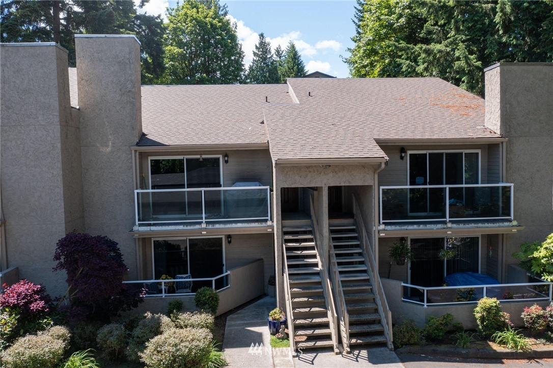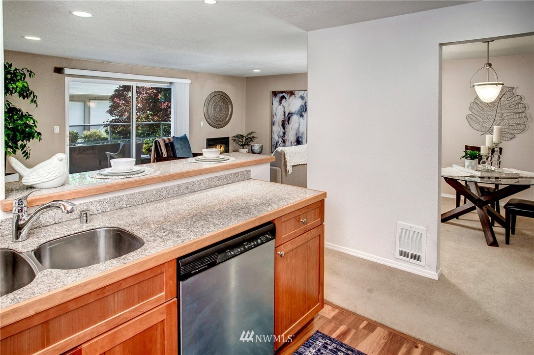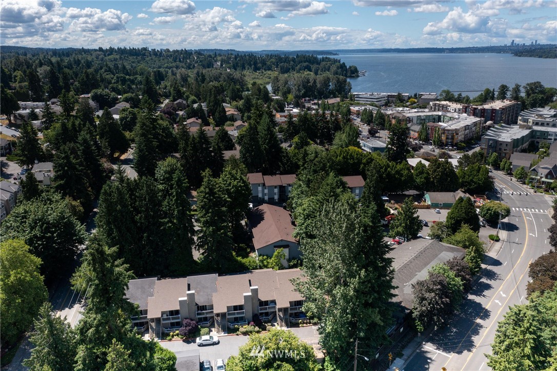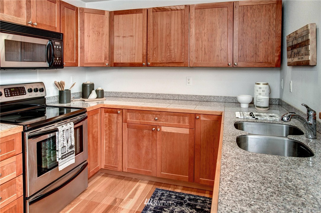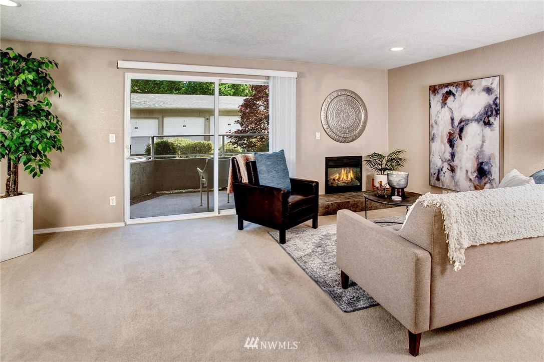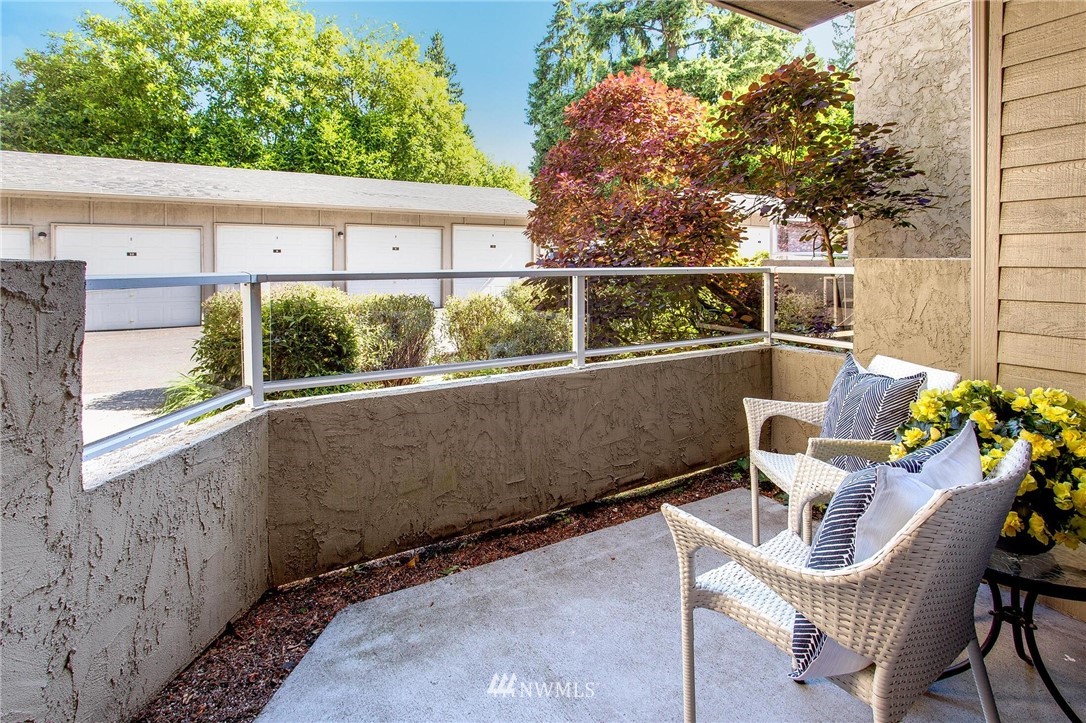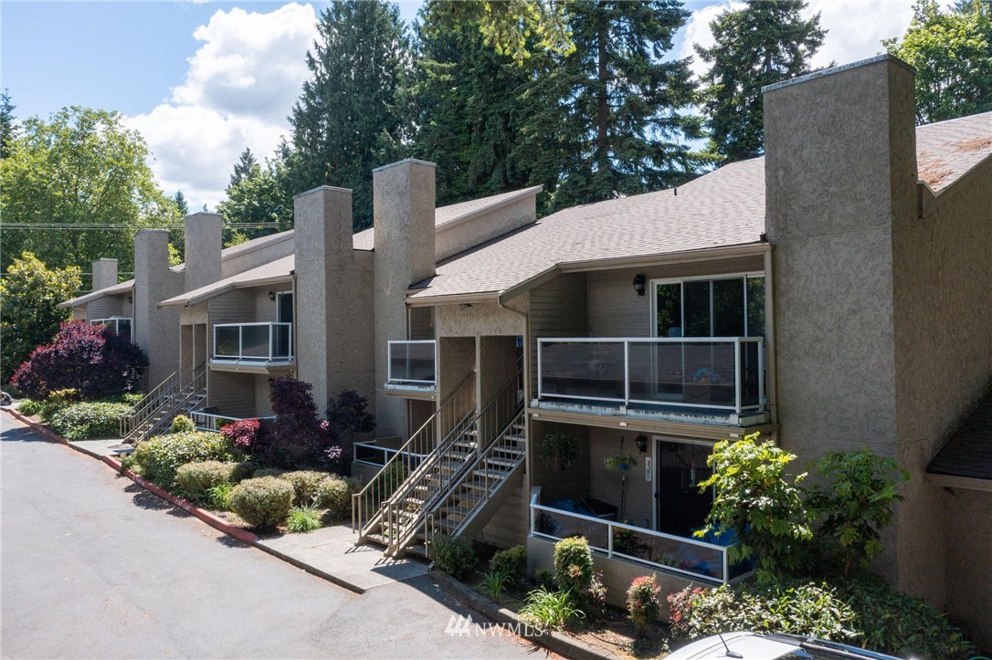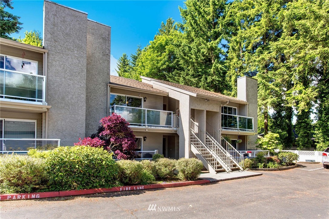 Welcome Home to Eastwood Villa! A lovely private condo community minutes from Juanita Village and Juanita Beach Park. Ground floor entrance into 1 story living! Open concept kitchen/dining/living room space complete with an electric fireplace insert and sliding glass doors opening to a nice covered patio area. Kitchen has good space w/ lots of cabinets, high bar, granite tile counters, laminate hardwoods and SS appliances. More storage found in the hallway along with the washer/dryer that stay w/ home. Master bedroom has double closets and ensuite! Don't miss the 1 car garage located right across the drive PLUS large separate storage closet found around the side of building! Strong HOA! Water/sewer/garbage covered in dues. Move in ready!