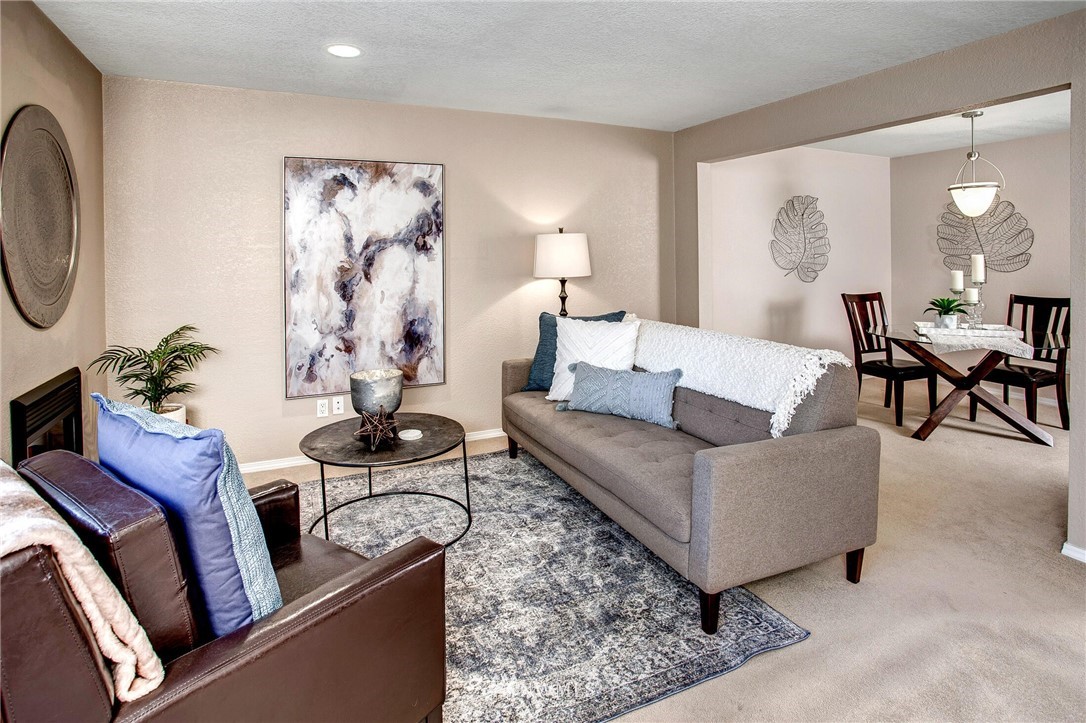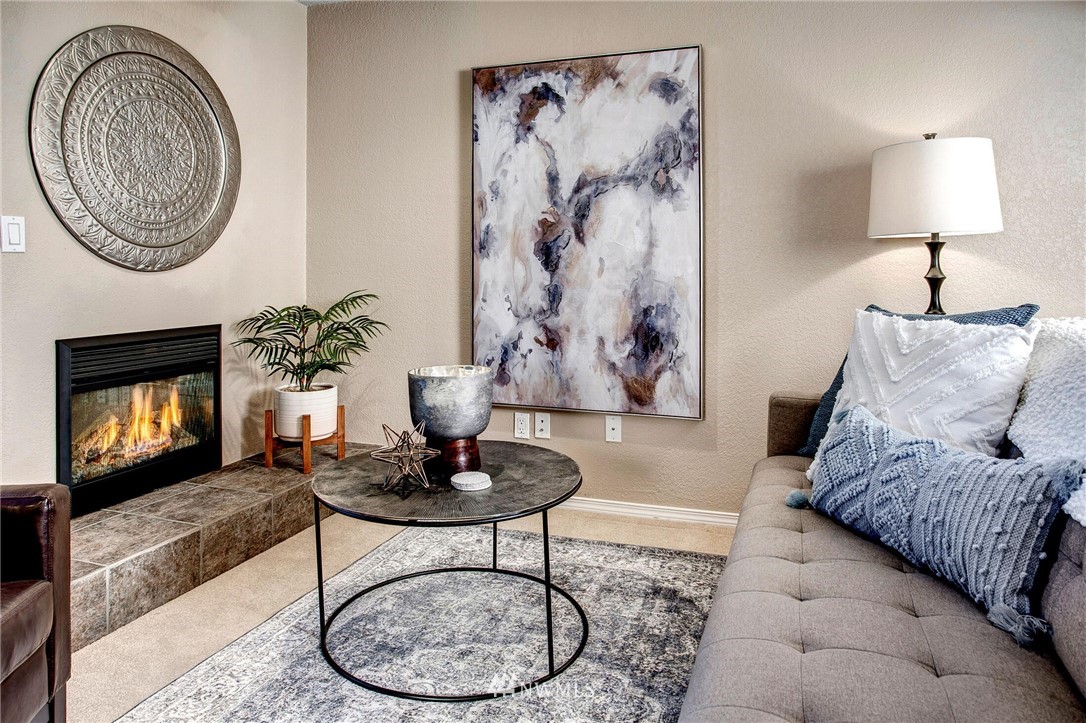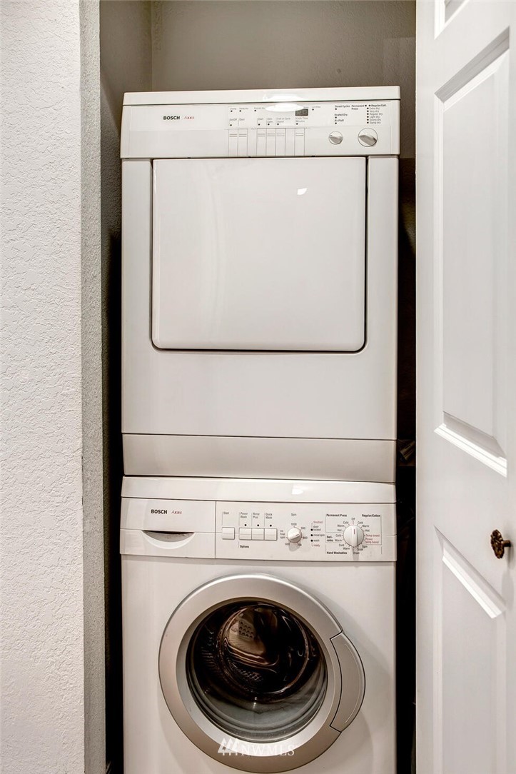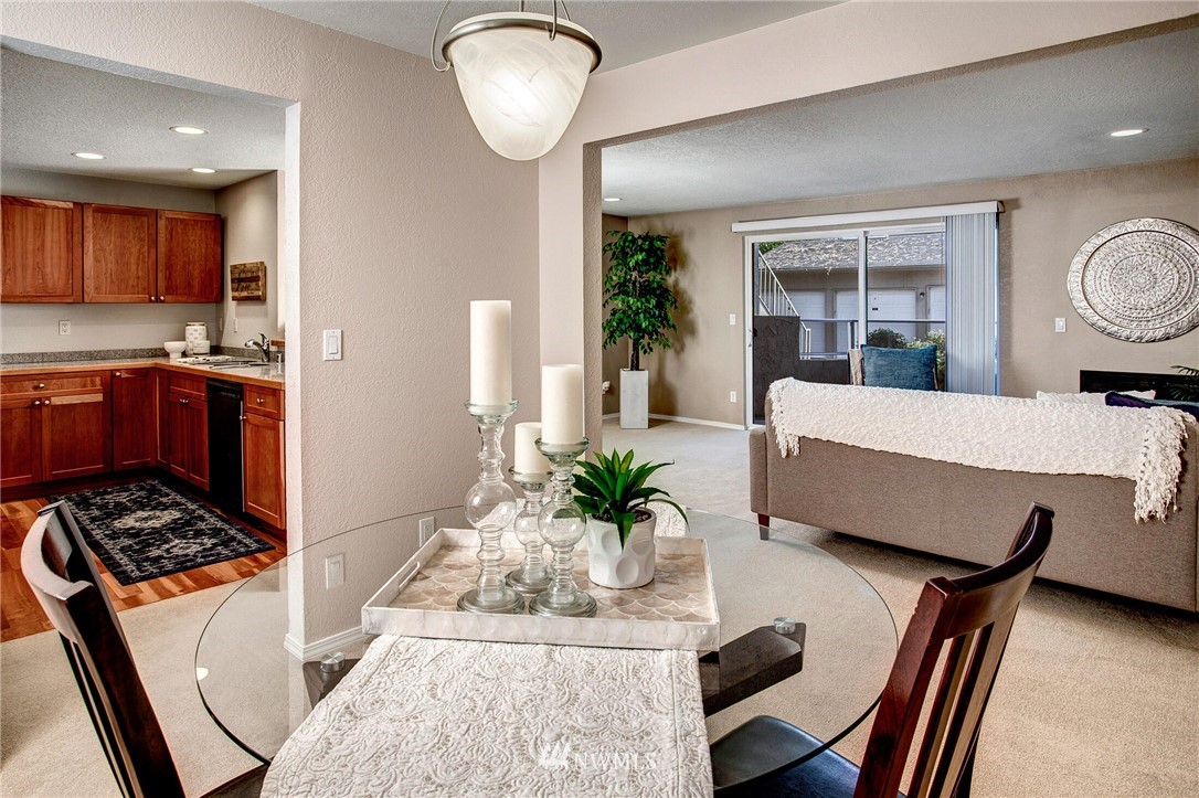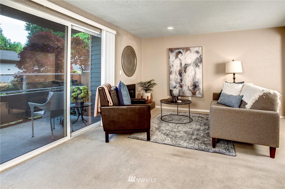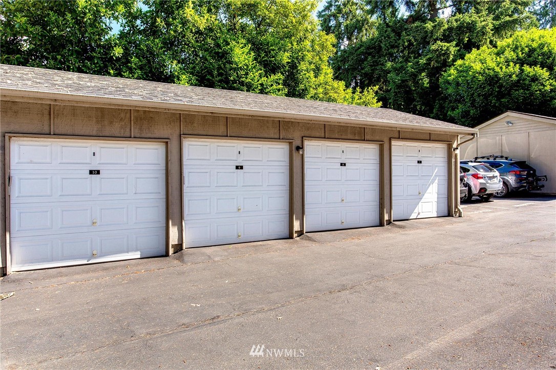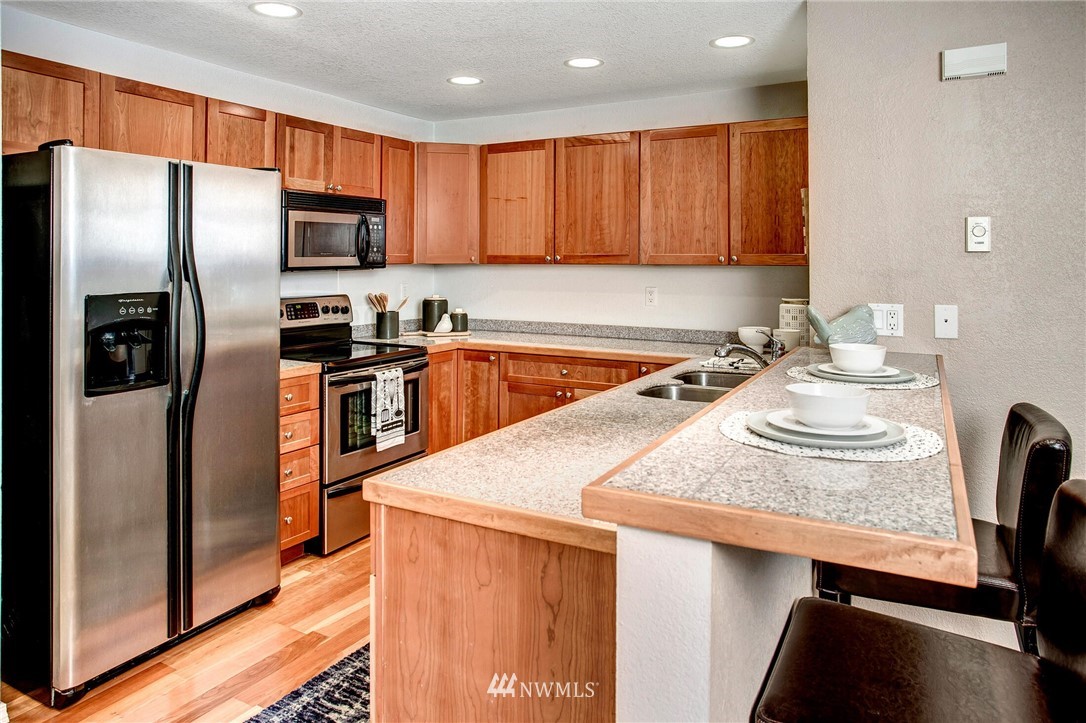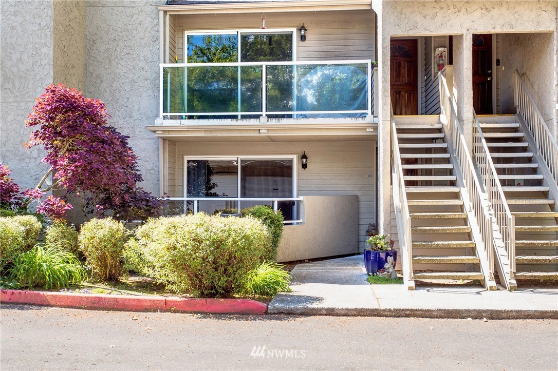 Welcome Home to Eastwood Villa! A lovely private condo community minutes from Juanita Village and Juanita Beach Park. Ground floor entrance into 1 story living! Open concept kitchen/dining/living room space complete with an electric fireplace insert and sliding glass doors opening to a nice covered patio area. Kitchen has good space w/ lots of cabinets, high bar, granite tile counters, laminate hardwoods and SS appliances. More storage found in the hallway along with the washer/dryer that stay w/ home. Master bedroom has double closets and ensuite! Don't miss the 1 car garage located right across the drive PLUS large separate storage closet found around the side of building! Strong HOA! Water/sewer/garbage covered in dues. Move in ready!