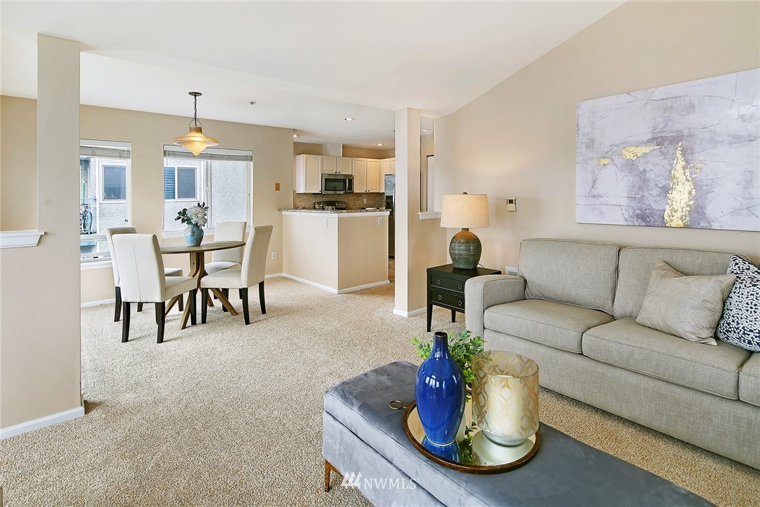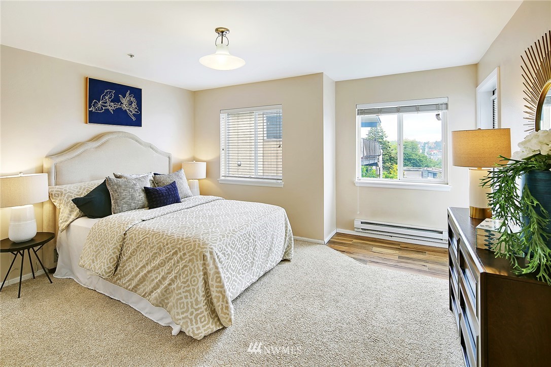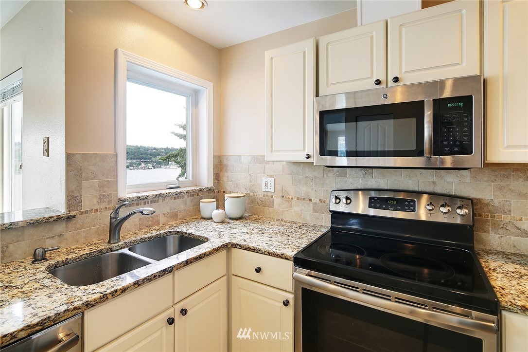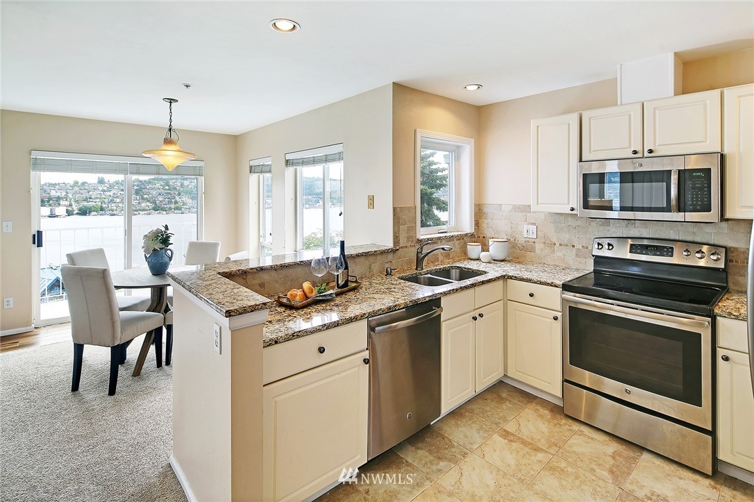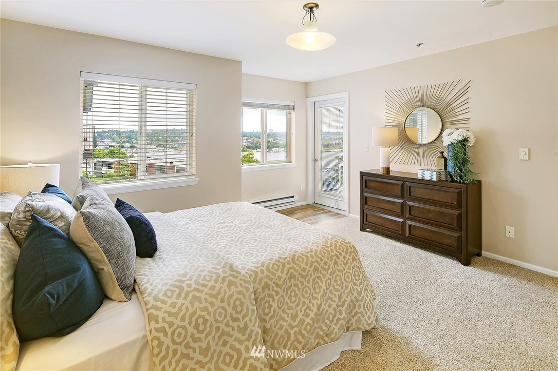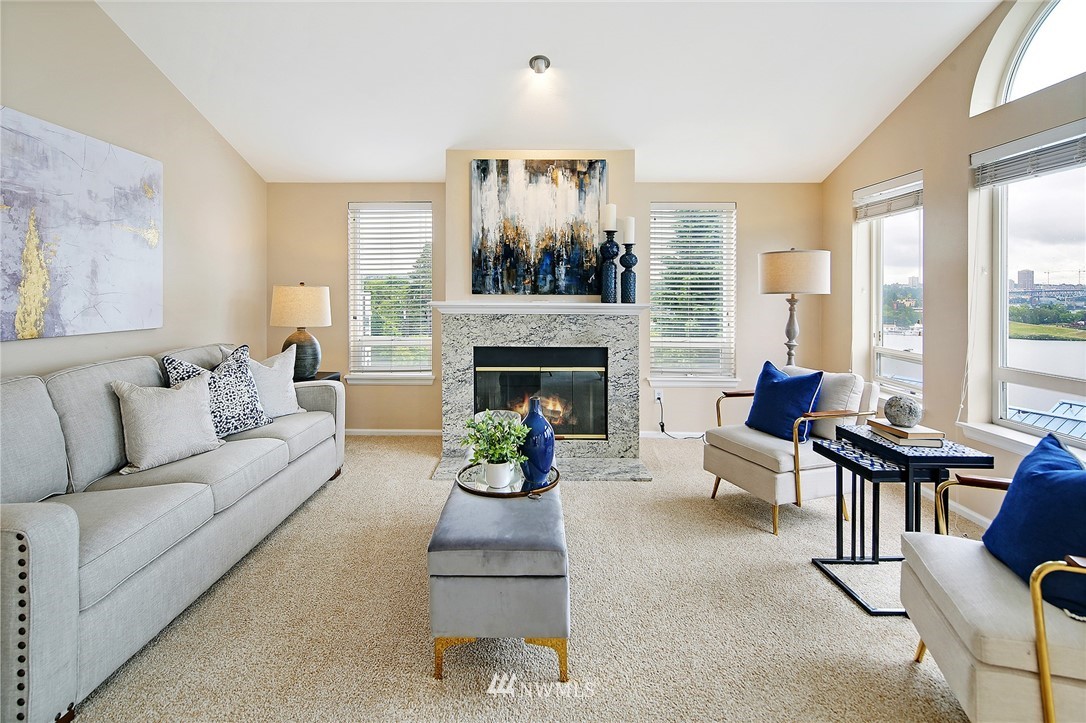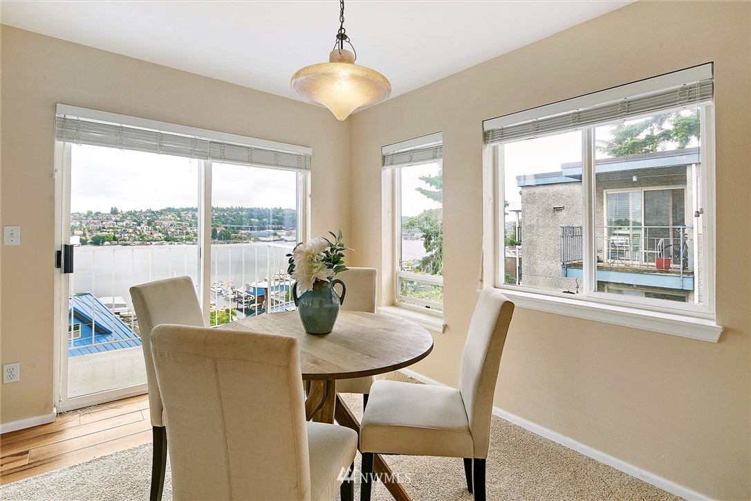 Enjoy a pageant of views from this stunning one level top floor condominium on coveted lower Queen Anne, just minutes to the vibrant downtown and Amazon's headquarters. Bask in the morning sun as it comes up over Capitol Hill and reflects off the crystalline waters of bustling Lake Union as you sip your coffee on one of the two balconies. You will be front and center for the 4th of July festivities and the cascade of fireworks at your feet. The great room has a wall of windows encompassing the lake and city vistas. Huge owner's suite with walk in closet. Both bathrooms have been updated. One covered parking spots in secure garage, storage unit and guest parking. This is the perfect investment property or simply a lovely place to call home!
