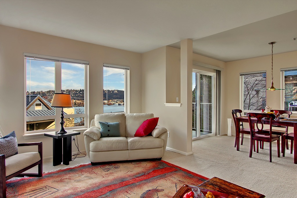 Open & airy, this light-filled home sits high above the street, with views to the East & windows on 3 sides. Enjoy great sunrises & seaplanes landing on the lake. Stylish kitchen has stainless appliances and opens to bright, spacious, and truly comfortable rooms. FP in living room- 2 decks - Master suite with double sinks and private jetted tub - Plenty of storage. Perfect sized, 8 unit building has easy access to downtown, Fremont, Queen Anne and South Lake Union. Garage pkg & storage.