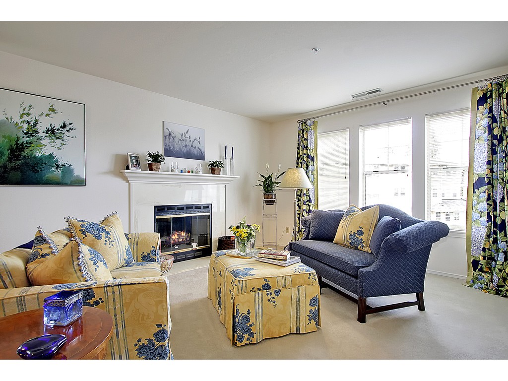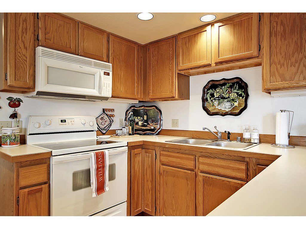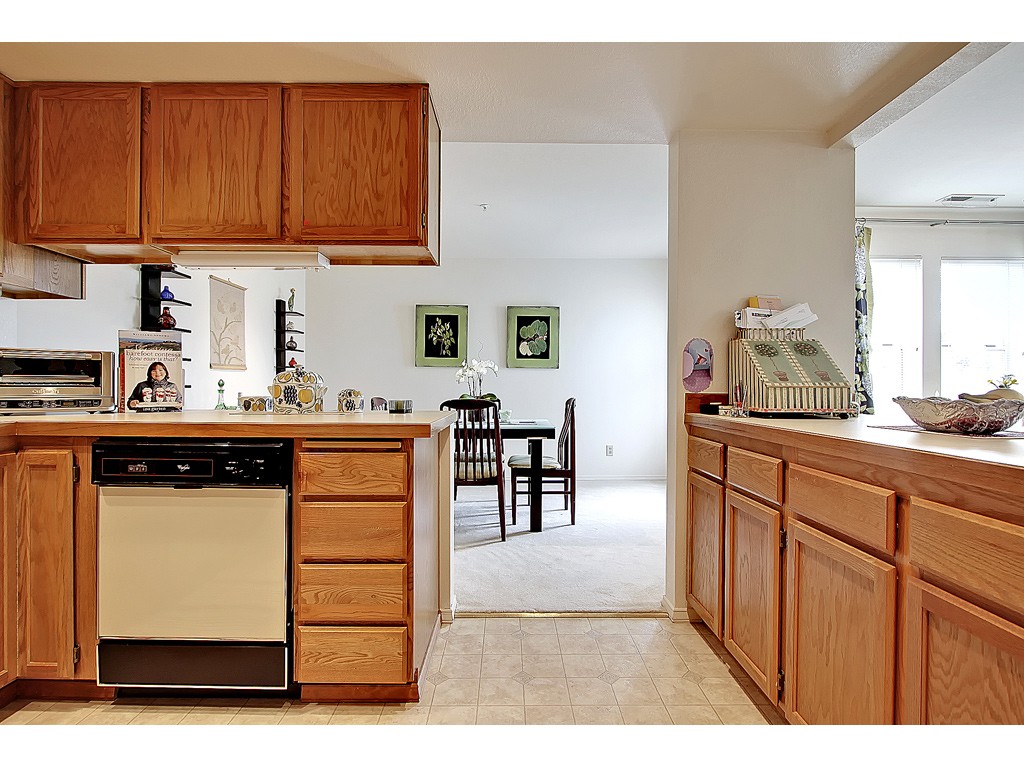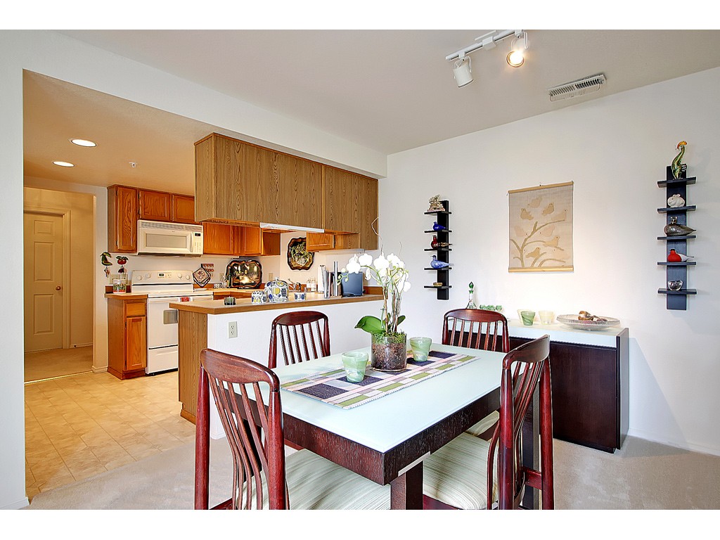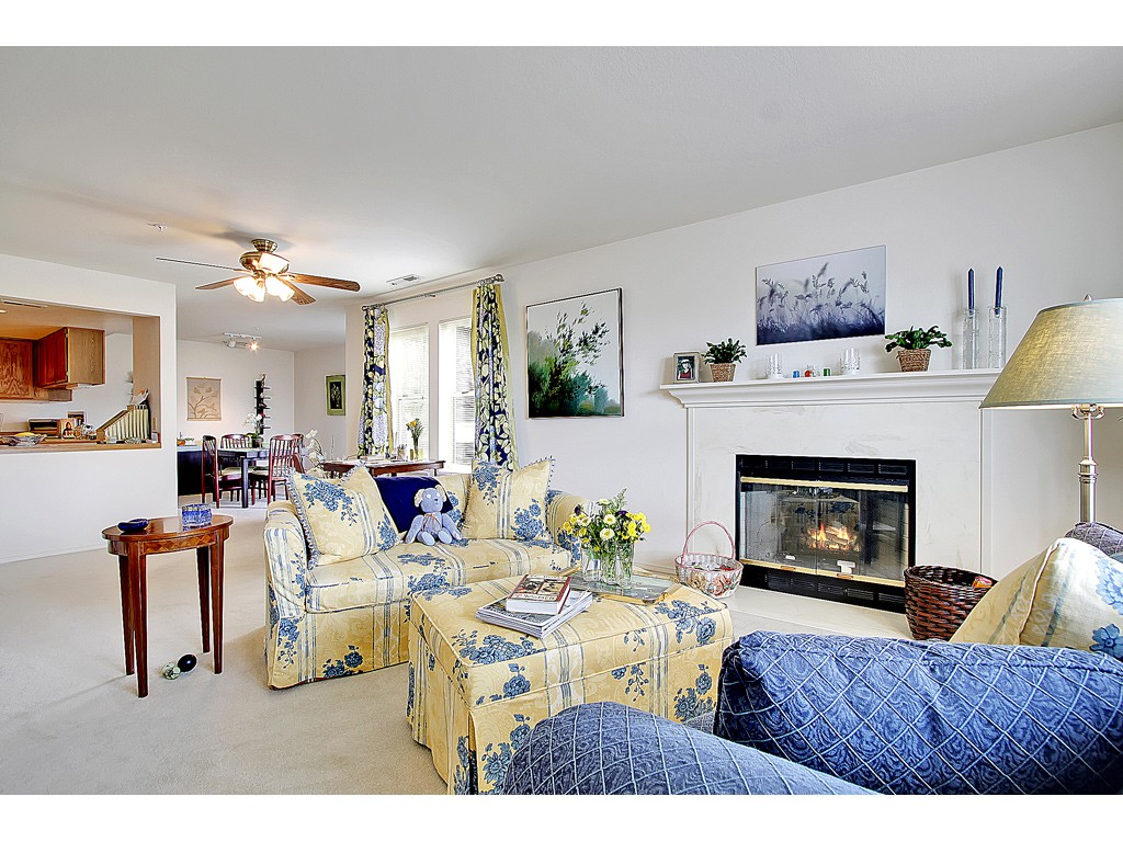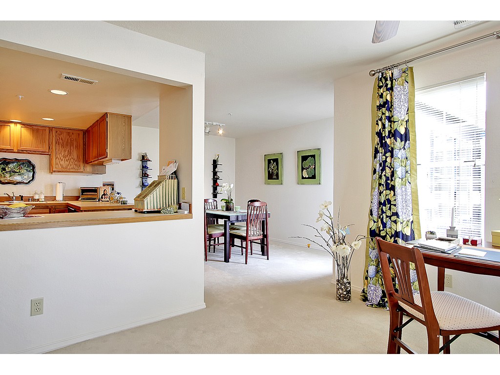 Beautiful top floor unit with nice territorial views. Great condition, light and bright with lots of windows and open floor plan. Spacious kitchen opens to dining room and living room. Nice buffet counter with storage beneath. Can have both casual and formal dining. Second bedroom has pocket doors and a nice closet and can double as a roomy den. Master suite has 2 closets and a big bath with walk-in shower. 2nd full bath. Cozy fireplace for winter and new deck for summer. Garage, secure bldg.