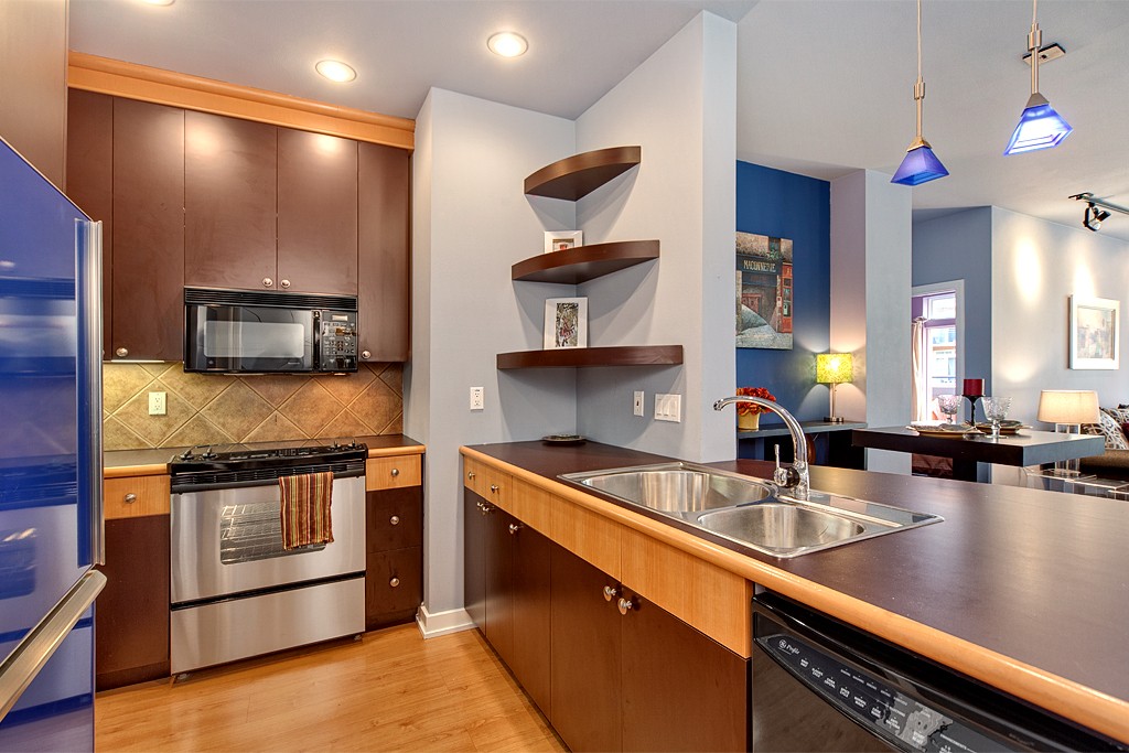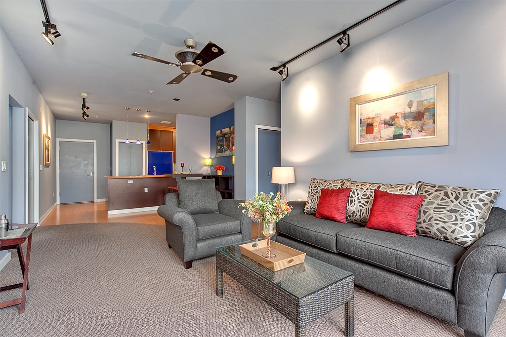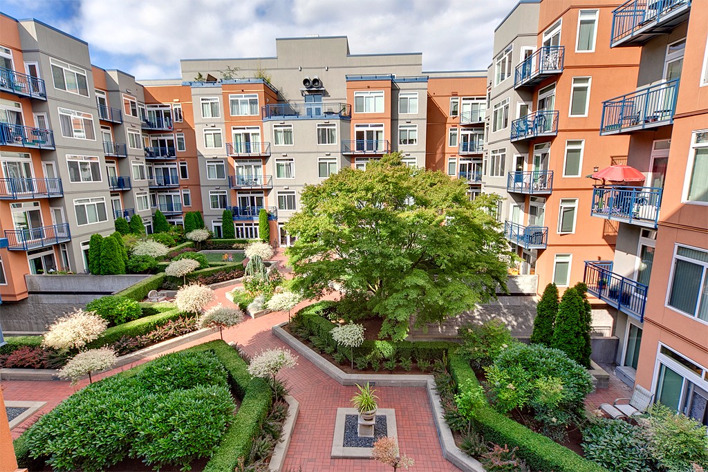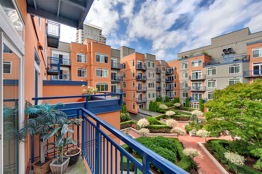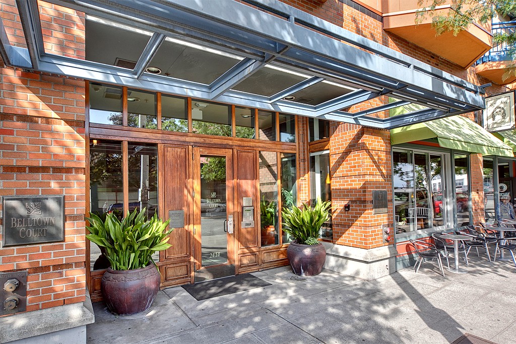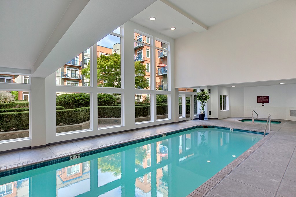 Live in the heart of popular Belltown! Former model unit overlooks tranquil inner courtyard from living room, 2 bedrooms, & 2 over-sized decks. Includes oversize handicap parking stall & secure storage + washer & dryer in unit. Building offers pool, hot tube, sauna, gym. Open floor plan, walk-in closet, walk-in shower, hardwood floors in entry, kitchen & dining areas. With a "walkscore.com" score of 92 & transit score of 100, this is near an abundance of shopping, dining & entertainment options!