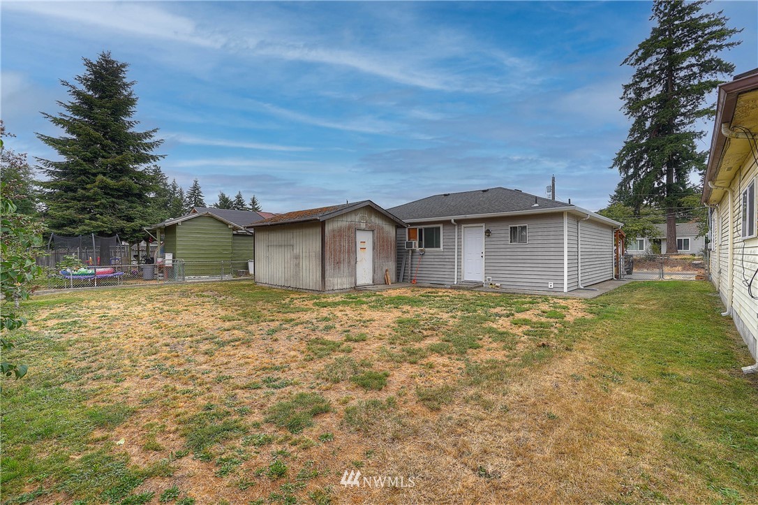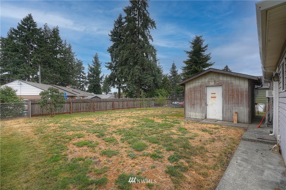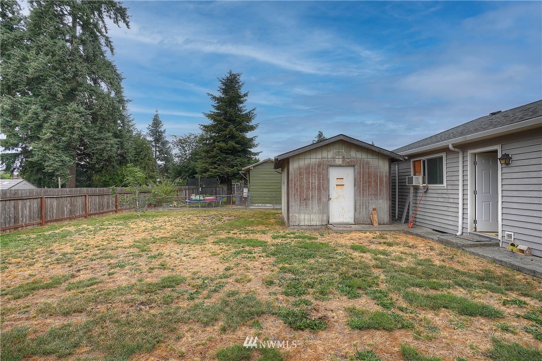 Practical and convenient 1 – story home in South Tacoma with a deceivingly large lot/backyard. Located near JBLM, this rambler could offer a lot of versatility & screams potential! Perfect addition to a rental portfolio, or make it your own and enjoy the convenience of a central location! 2 beds, 1 bath, over 1000 sqft, brand new roof 2021, hardwoods in beds, hardwood laminate in extra finished room, newer carpet (over hardwood in LR), triple pane windows w/kryptonite (besides slider), a covered front porch, walnut tree, lilacs, rose bushes and a practical shed in the back for storage or shop. The fenced lot is perfect for furry ones or others to play. Come check it out!