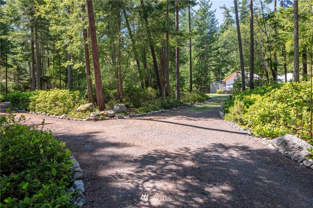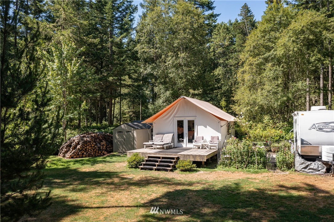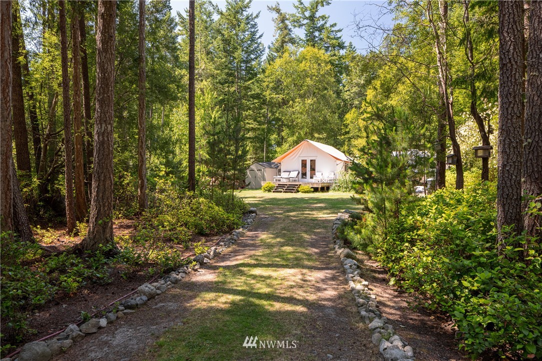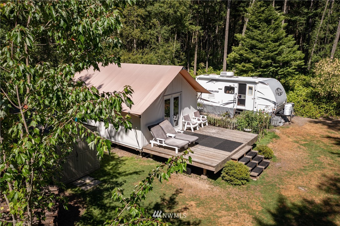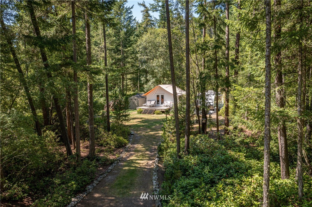 Wrought Iron Gate leads to a rock-lined, curved drive through the woods to the perfect building site. Excavation for the 2 car garage/studio is complete with utilities stubbed in. A fruit tree lined path takes you to the house site. There you will find a Rainer Wall Tent with insulated walls, double pane windows and French door plus a nice deck--currently used as a 320 sqft bedroom. Next to the tent is a small travel trailer which provides a kitchen, 3/4 bath, eating nook and bed. Property is deer fenced on 3 sides. Approved garage/studio plans included. 3 bedroom septic installed & in use. Good producing private well. All you need to get started on Lopez.