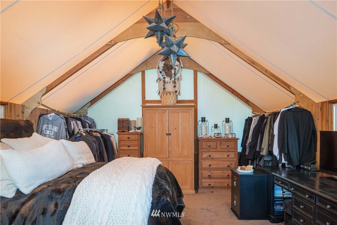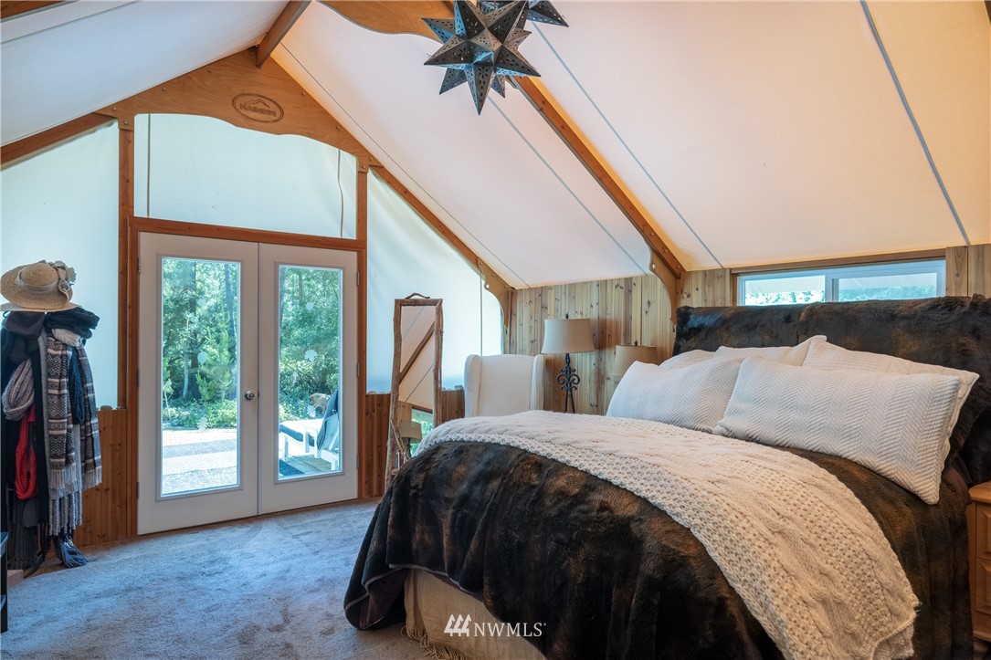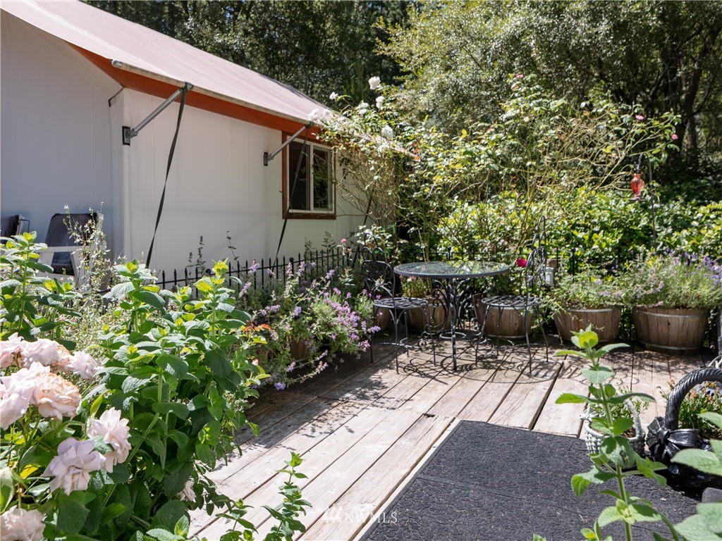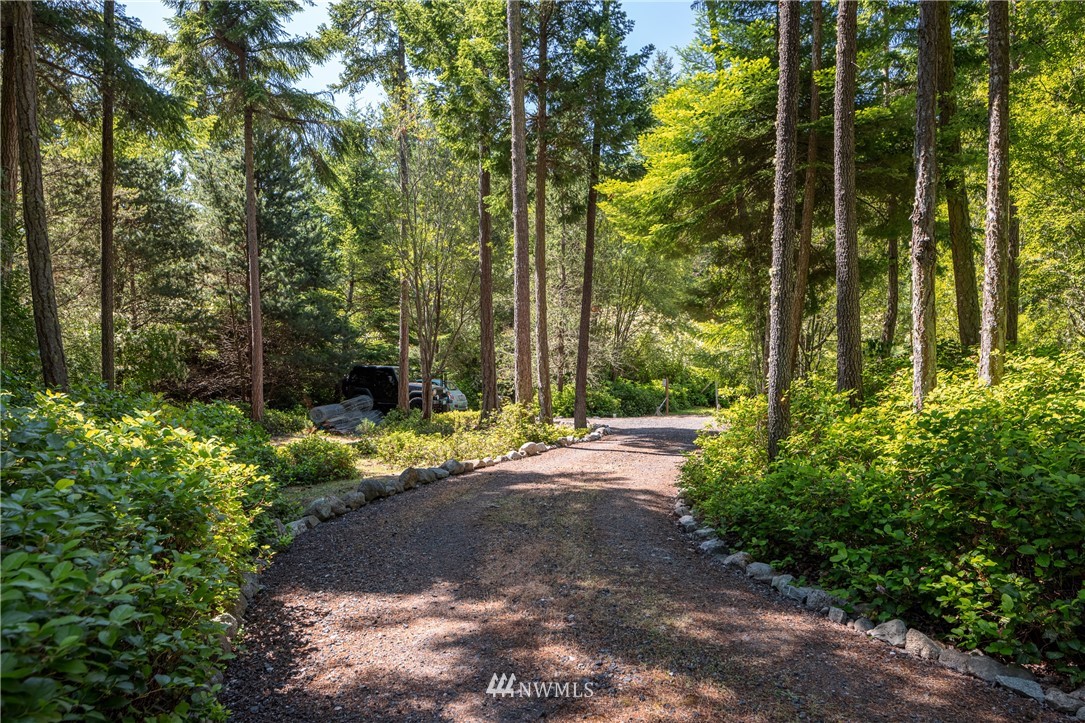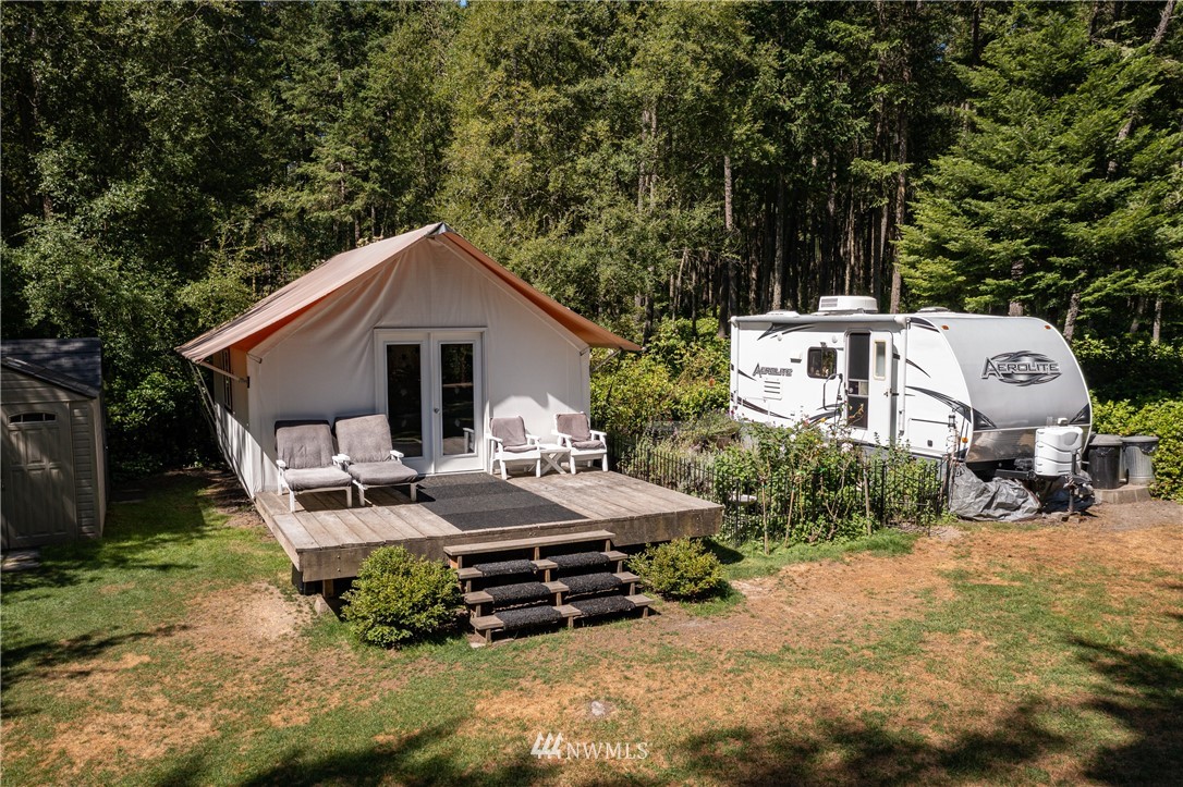 Wrought Iron Gate leads to a rock-lined, curved drive through the woods to the perfect building site. Excavation for the 2 car garage/studio is complete with utilities stubbed in. A fruit tree lined path takes you to the house site. There you will find a Rainer Wall Tent with insulated walls, double pane windows and French door plus a nice deck--currently used as a 320 sqft bedroom. Next to the tent is a small travel trailer which provides a kitchen, 3/4 bath, eating nook and bed. Property is deer fenced on 3 sides. Approved garage/studio plans included. 3 bedroom septic installed & in use. Good producing private well. All you need to get started on Lopez.
