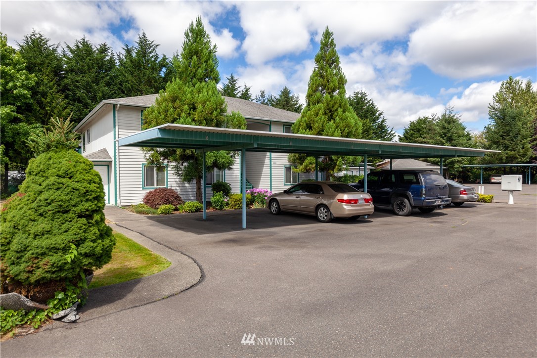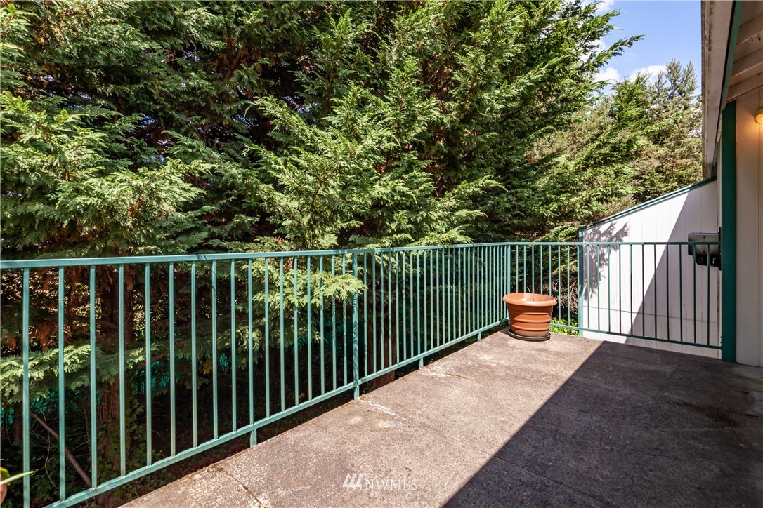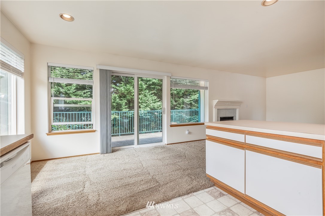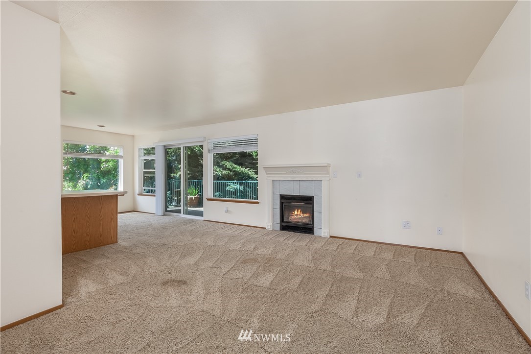 Top-floor end unit in the 50+ age Midland Court Condo community. Open concept living area features a beautiful gas fireplace with tile surround. Bright & spacious kitchen offers lots of cabinet space plus bar seating. Dining room with big windows opens to the wonderful balcony surrounded by evergreens for excellent privacy. The generous master bedroom includes a walk-in closet and private full bathroom. Convenient full laundry in the unit, washer & dryer stay! Newer cordless blinds on all windows. Outdoor storage closet & 2 dedicated carport parking spaces, close to restaurants and amenities.