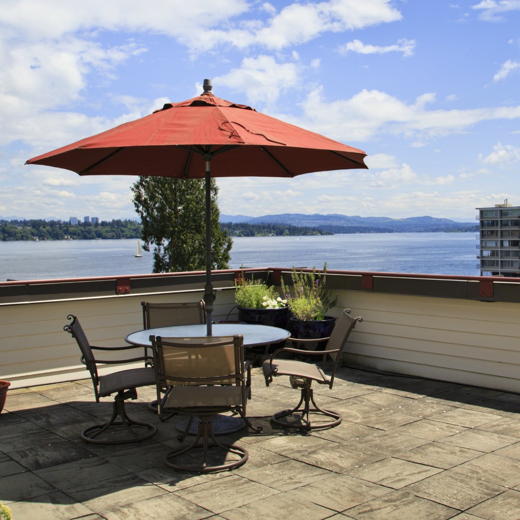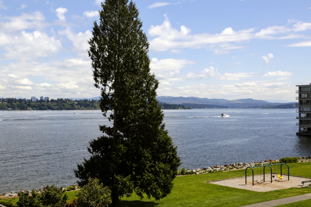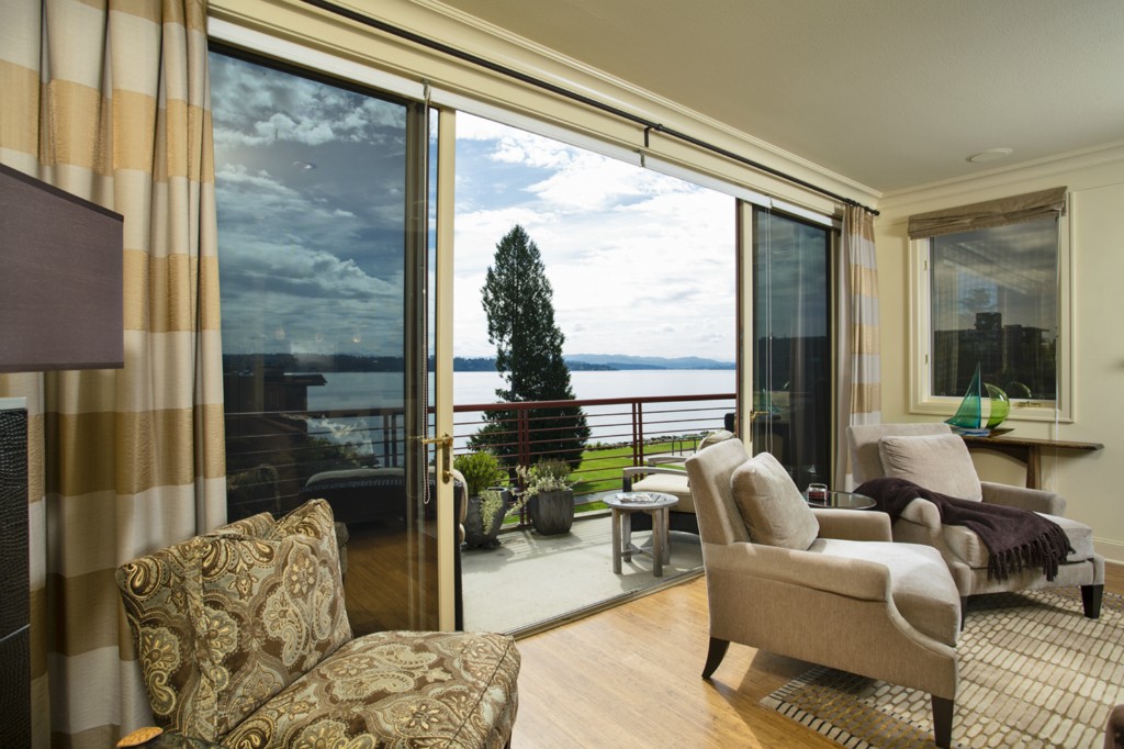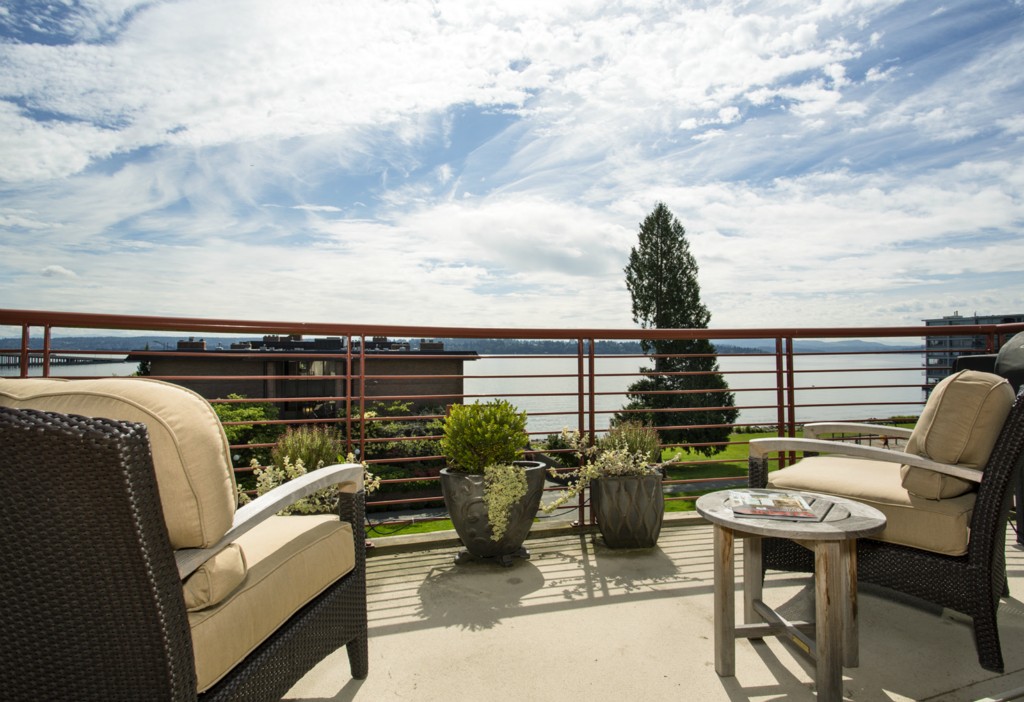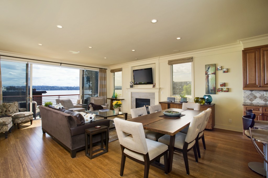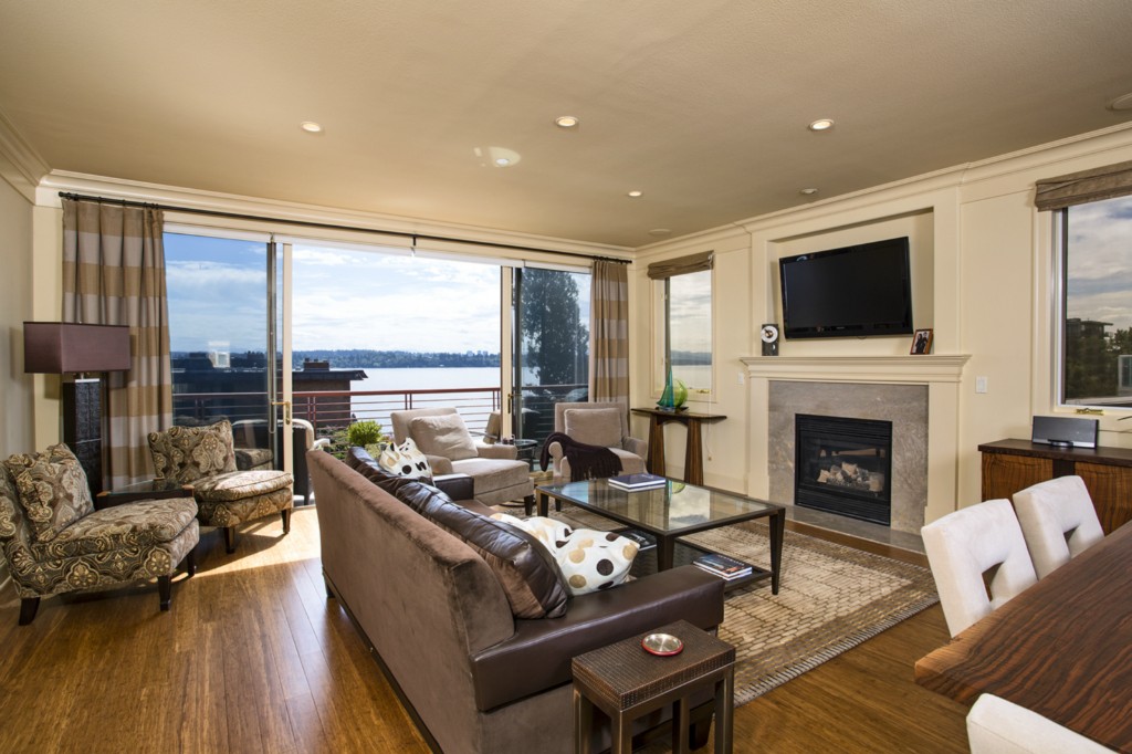 Fine 1 ,400-sq-ft penthouse in 6-unit condominium building. Nicely detailed interiors with open floor plan and lake and mountain views. Living/dining area with gas fireplace and sliding glass doors to terrace; kitchen with granite counters and top-notch appliances; 3 bedrooms and 13/4 baths, master suite with fireplace; private roof-top terrace with 180' vistas. AC; laundry facilities; 2 parking spaces in ground level garage. Looks out on waterfront park, close to Madison Park amenities.