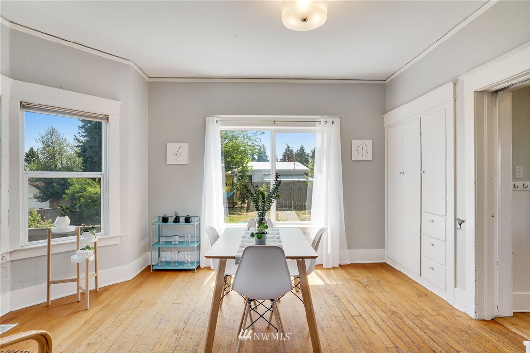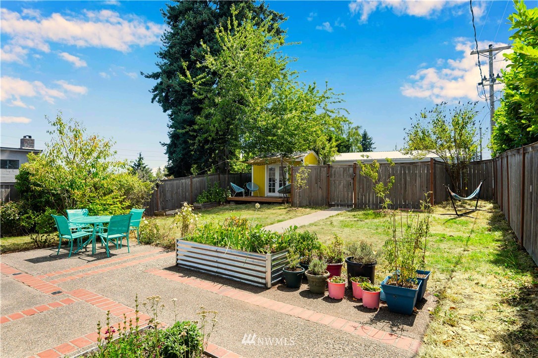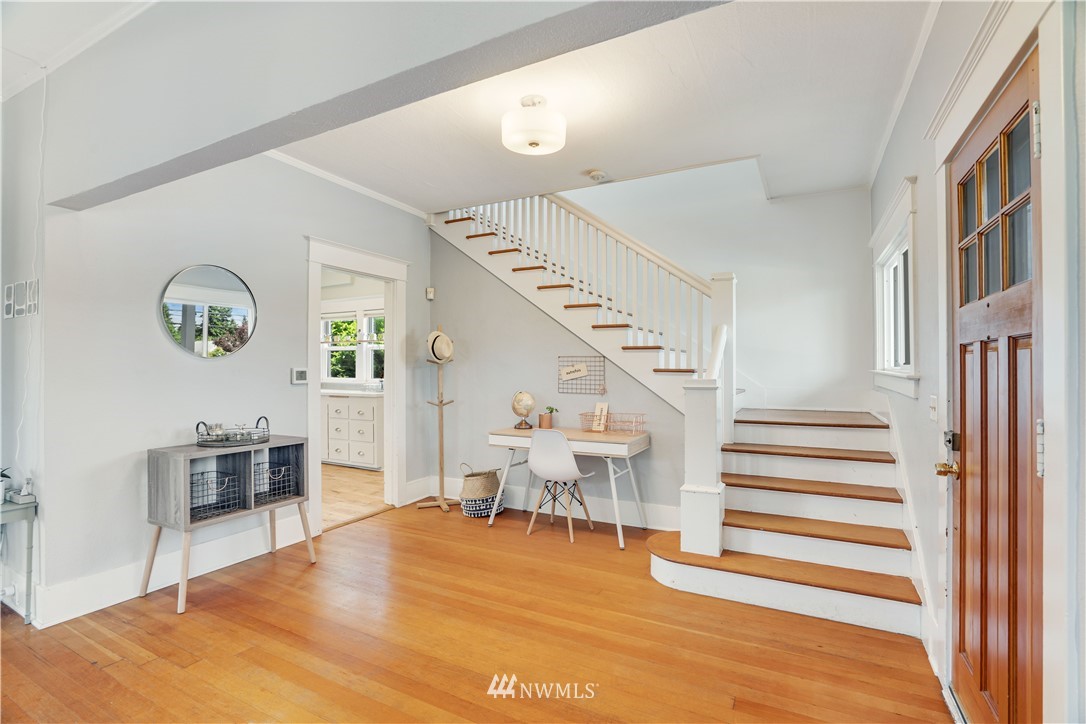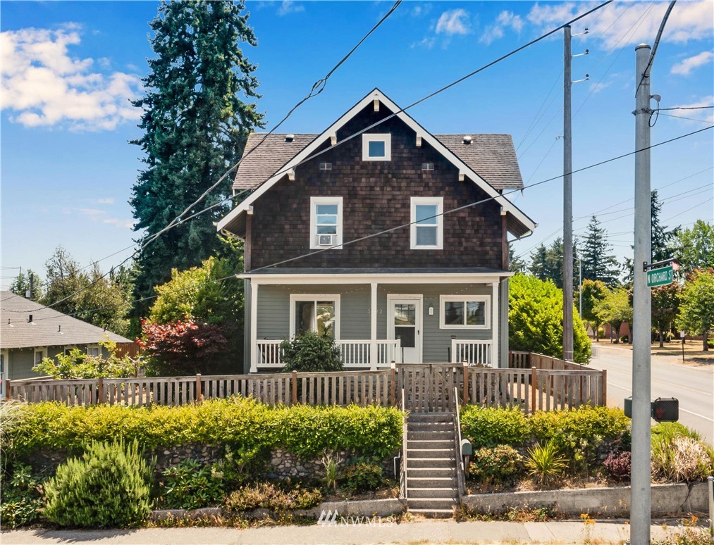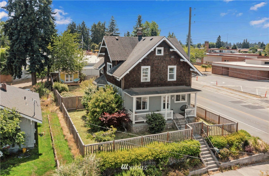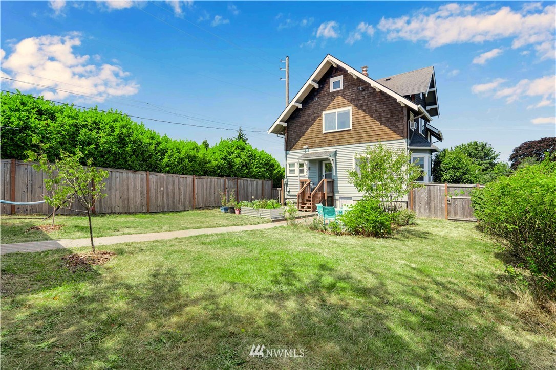 Perched on an elevated North End lot, this classic 1908 foursquare welcomes you with high ceilings, ample natural light, fir floors, crown molding and a bay window with Mt. Rainier views. The large, fully fenced yard includes a garden and fruit trees, a private patio, a bright backyard studio and 2 off-street parking spaces. Inside find bathrooms on 2 floors, 3 upstairs bedrooms, newer double-pane windows and a 2019 gas furnace. The home offers a comfortable balance of open spaces and cozy nooks with period details like the clawfoot tub and vintage cabinets in the updated kitchen with its tile backsplash and beautiful hardwoods. Less than a mile to Proctor Farmers’ Market, 1 block to Kandle Pool and a 10 minute drive to downtown and I-5.