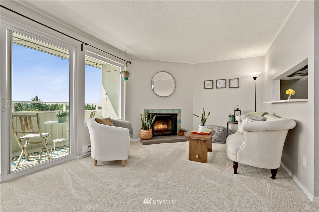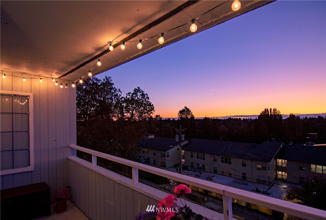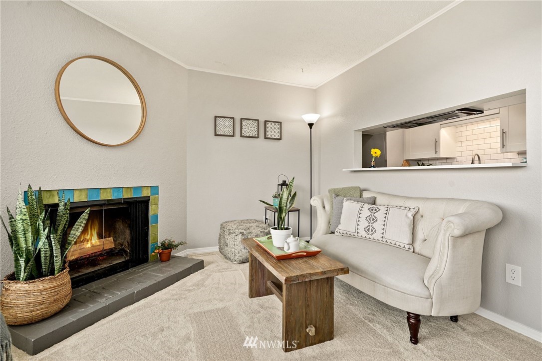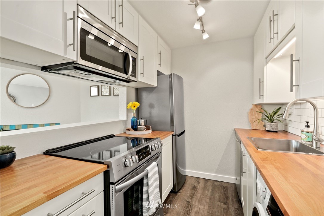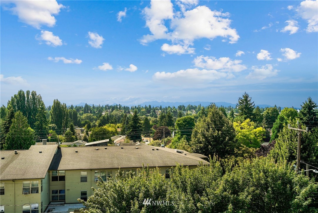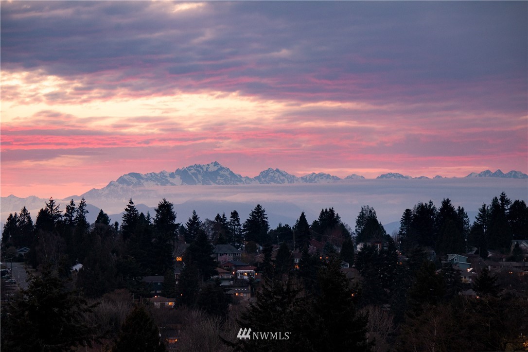 Recently updated top floor 1 bedroom condo in great Greenwood location. Enjoy beautiful sunsets and the amazing mountain views from your private deck or living room. Updated kitchen has white shaker cabinets with new hardware, butcher block counter-tops, stainless steel appliances and subway tile back-splash. New LVP & carpet throughout and fresh interior paint. 1 assigned parking spot. Minutes to vibrant Greenwood District where you can enjoy a variety of restaurants, bars, cafe's, boutique shops and parks. Easy commute to Seattle, with bus access just outside your door. Dues include: water/sewer, garbage & common space. HOA to replace siding and decks in 2022, seller to pay special assessment at closing.