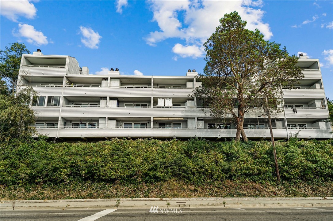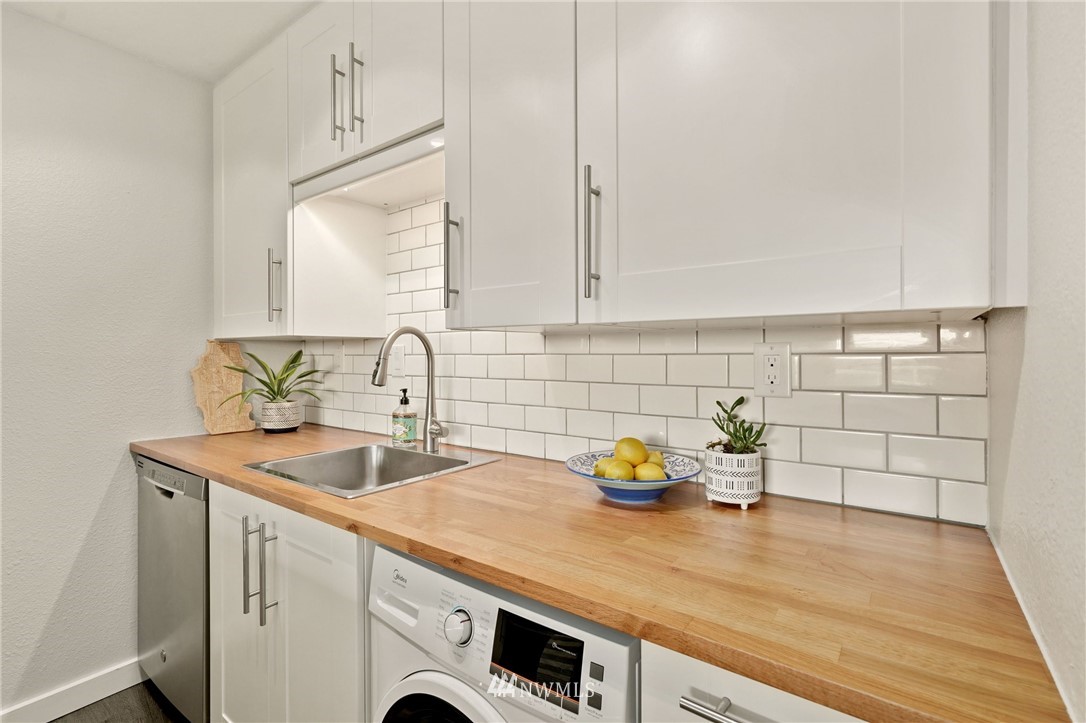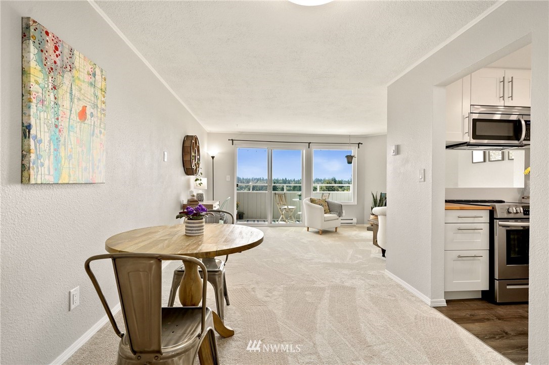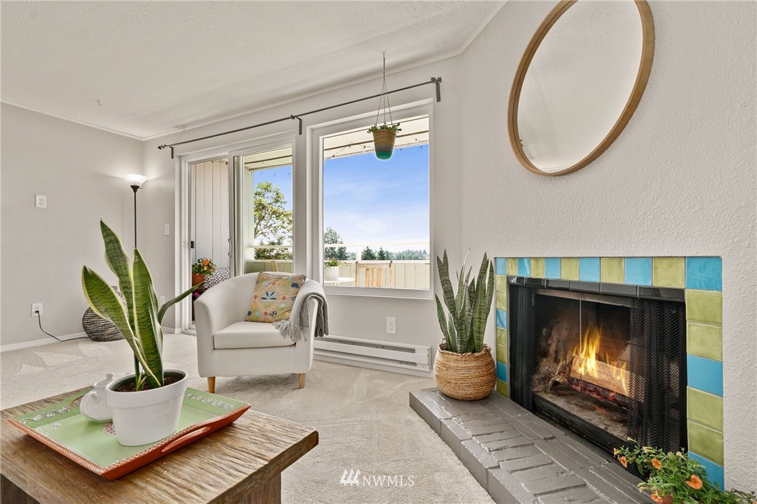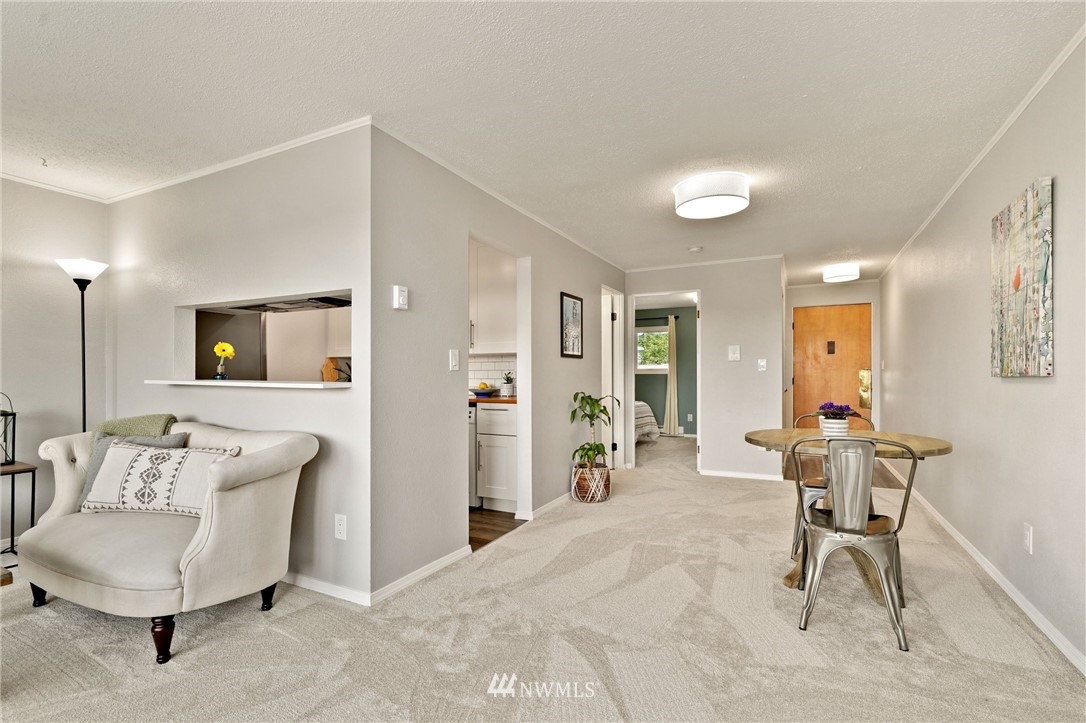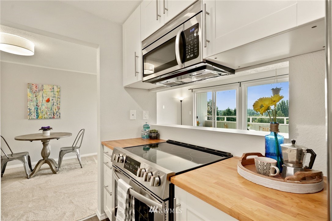 Recently updated top floor 1 bedroom condo in great Greenwood location. Enjoy beautiful sunsets and the amazing mountain views from your private deck or living room. Updated kitchen has white shaker cabinets with new hardware, butcher block counter-tops, stainless steel appliances and subway tile back-splash. New LVP & carpet throughout and fresh interior paint. 1 assigned parking spot. Minutes to vibrant Greenwood District where you can enjoy a variety of restaurants, bars, cafe's, boutique shops and parks. Easy commute to Seattle, with bus access just outside your door. Dues include: water/sewer, garbage & common space. HOA to replace siding and decks in 2022, seller to pay special assessment at closing.