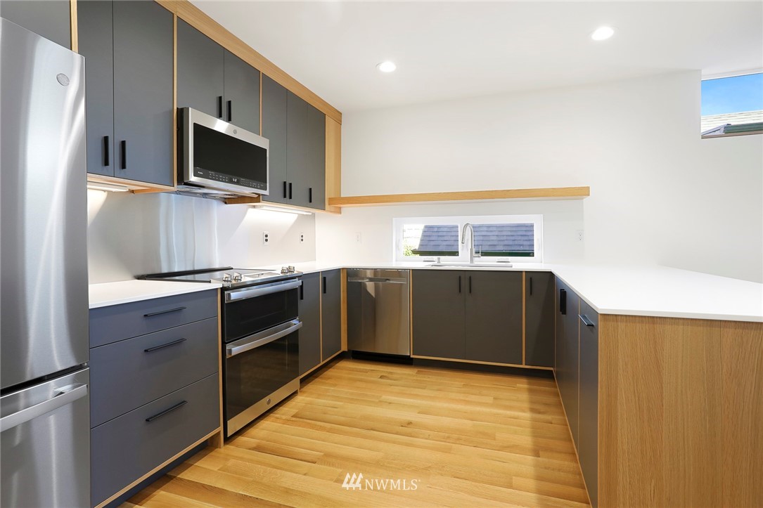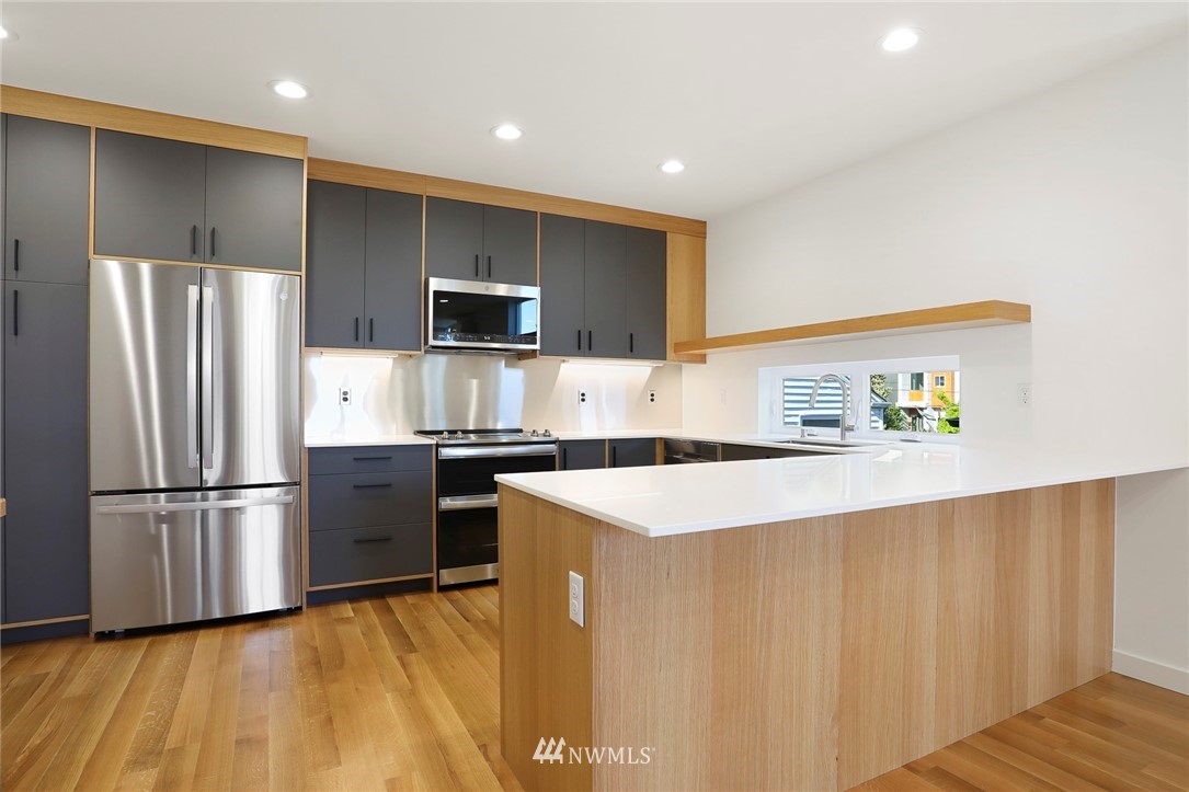 Stunning new construction townhouse by one of Seattle's premier builders Peeler Homes. Stylish and spacious living with the perfect blend of design and function. Featuring beautiful solid oak hardwoods, designer lighting, GE Profile stainless appliances, double oven, gorgeous quartz countertops and enormous island, and two-toned custom cabinetry. Tasteful-tiled baths, glass-enclosed rainfall showers and bidet. Efficient heat/AC mini splits provide cool summer months. Huge private roof top deck with 360 views perfect for summer BBQs and entertaining. Parking EV charger ready.