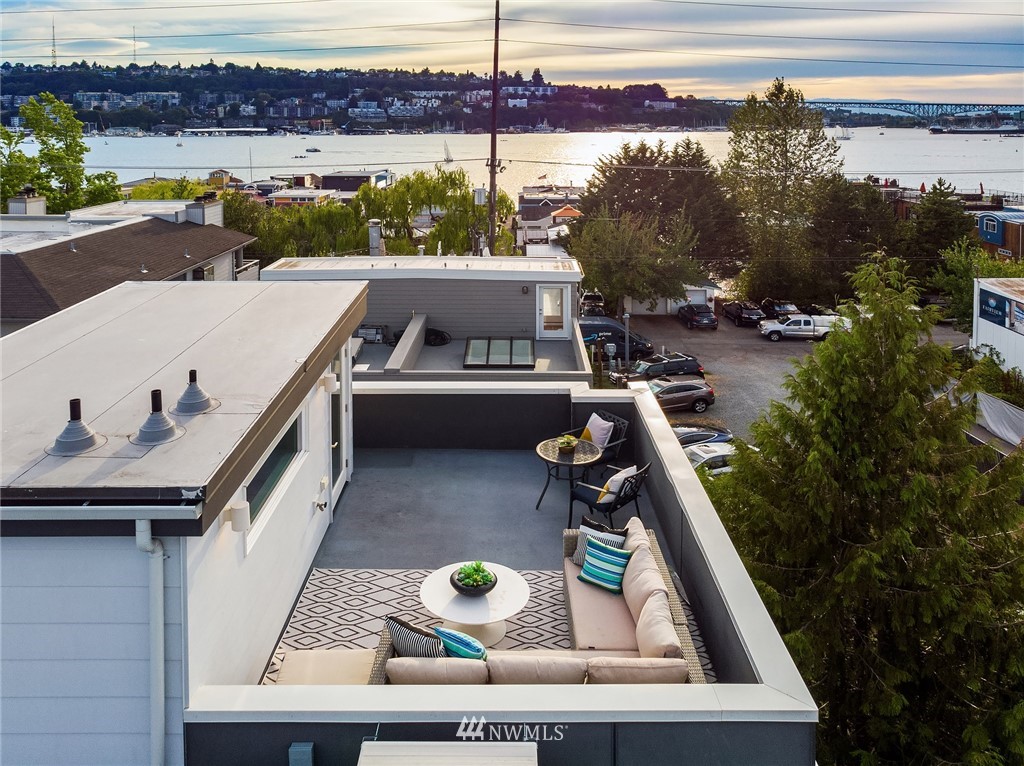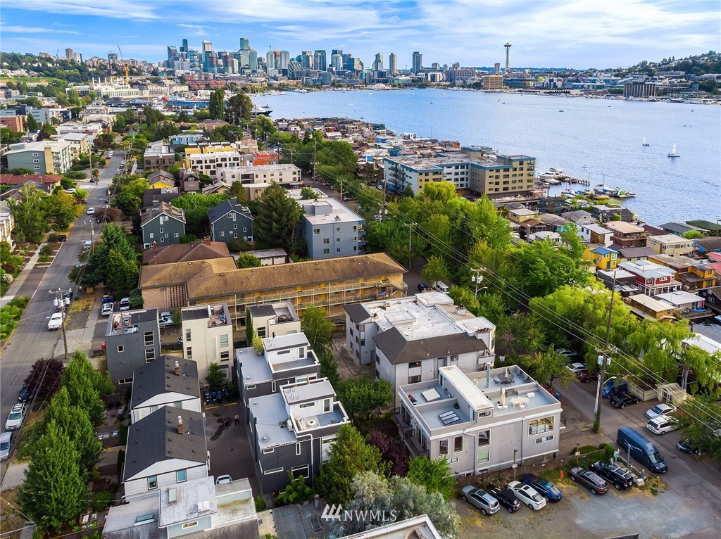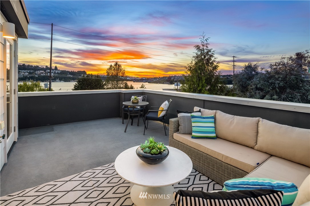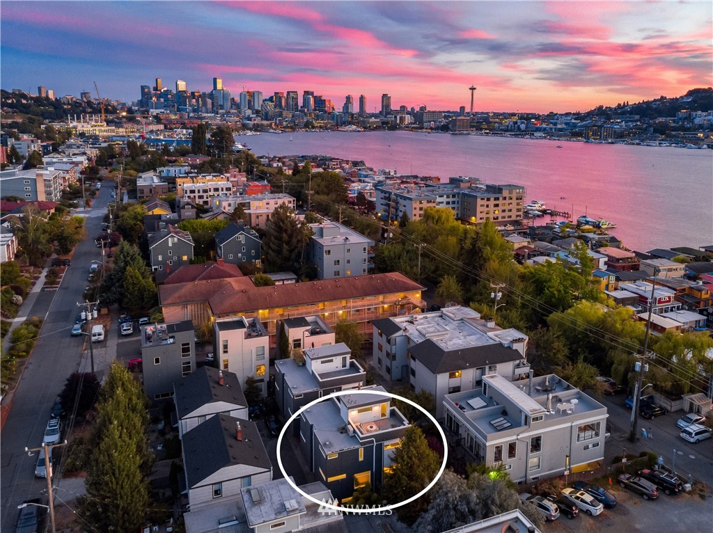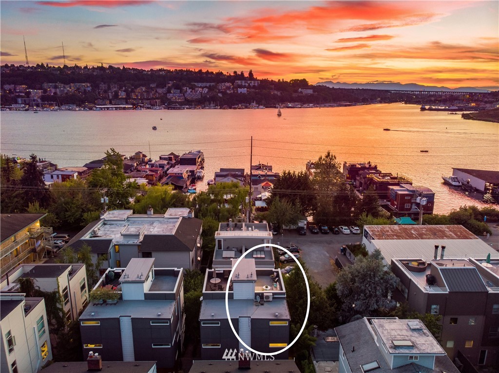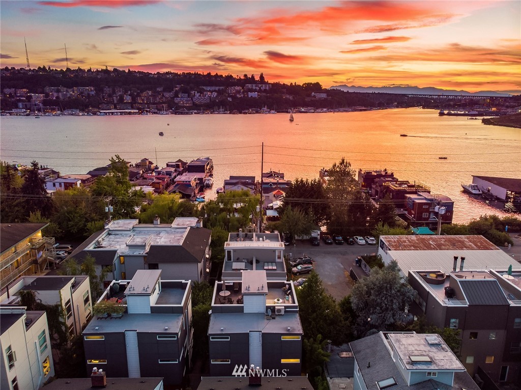 Spectacular tri-level 2BR Eastlake TH with rooftop deck offering panoramic views of Lake Union, Gas Works Park + Olympics. Impress guests with front-row seats to fireworks on the Fourth + Christmas boat show or just relax while savoring brilliant sunsets. Built Green 4-star home reflects a sophisticated contemporary design aesthetic inside + out. The true open-concept main living area fills with natural light from walls of windows and is highlighted by solid oak hardwoods + high ceilings. Modern kitchen features luxe S/S appliances + refined finishes. Entire upper level is spacious owner’s suite incl. spa-like bath + WIC with built-ins. Short walk to Lake Union waterfront/neighborhood parks + also convenient to UW, Fremont, SLU + downtown.